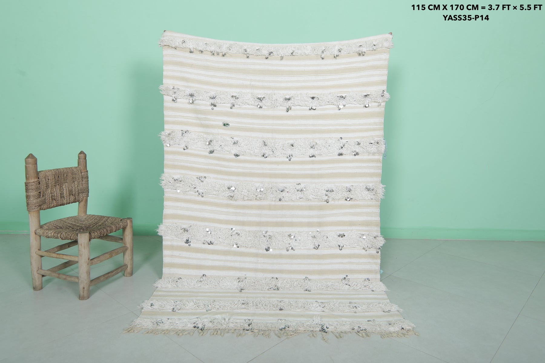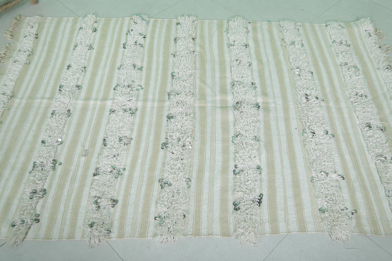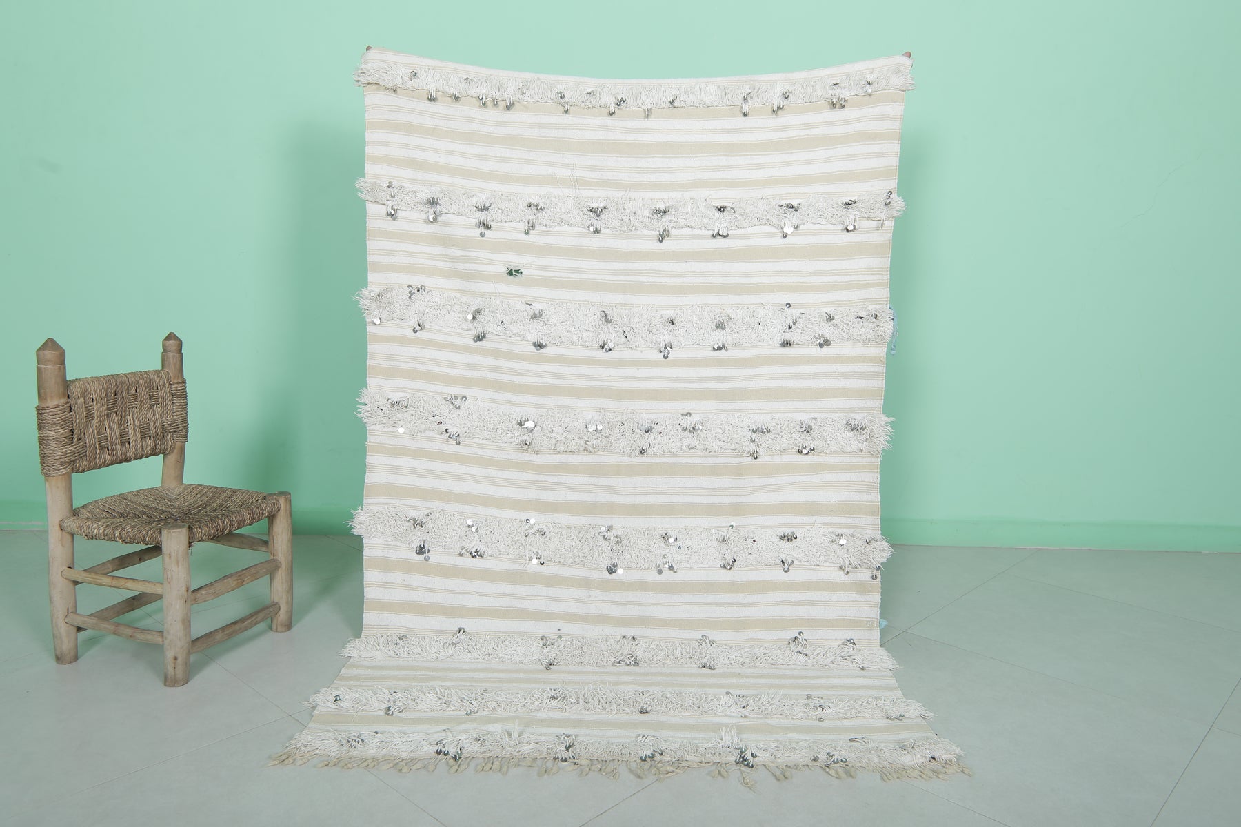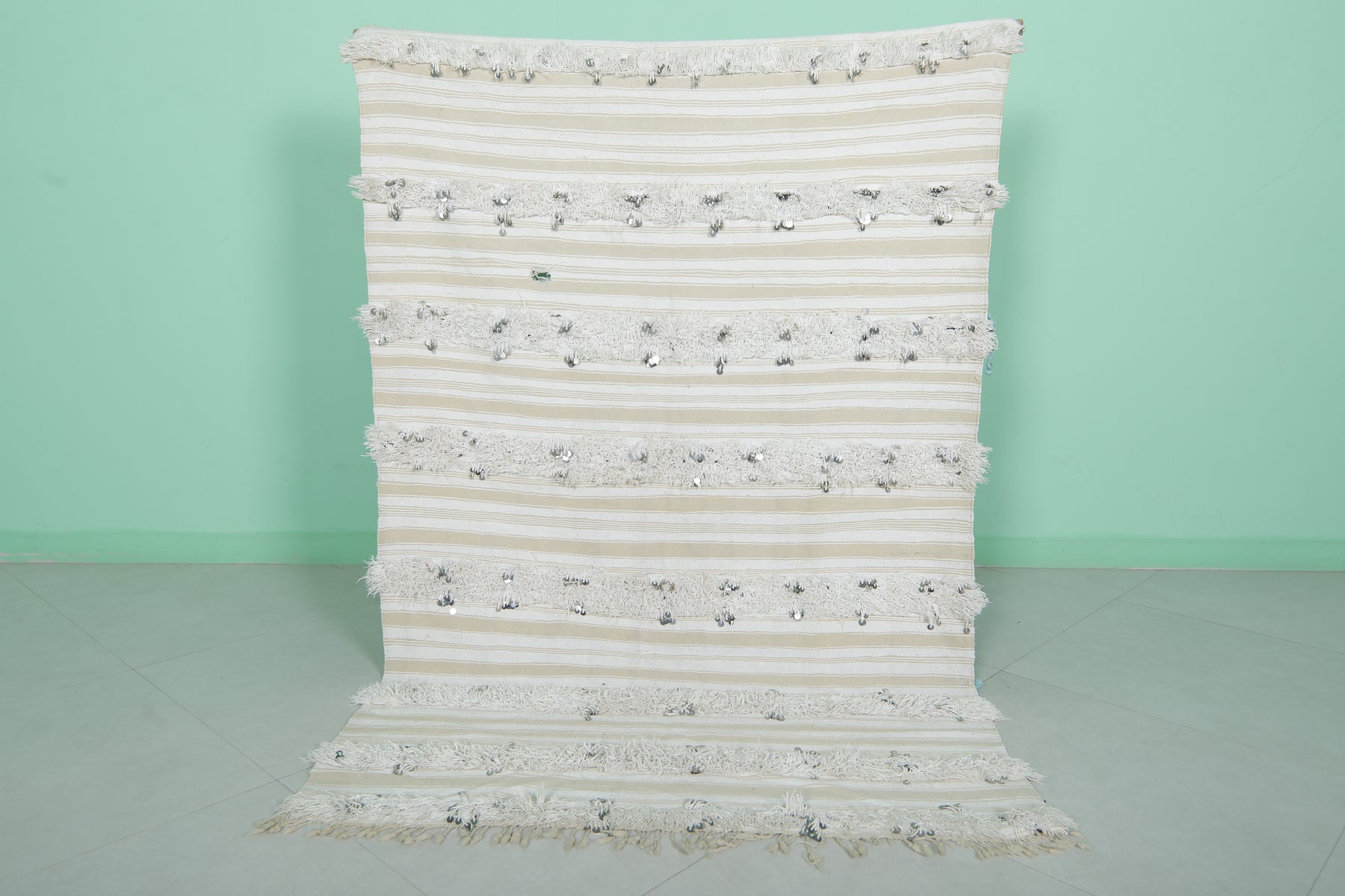 Add refined texture and heritage to your home with this Berber Wedding Blanket Rug, sized at 3.7 x 5.5 feet. Handwoven in Morocco, this exquisite piece features soft neutral tones, traditional Moroccan patterns, and shimmering sequin accents for a touch of elegance. Ideal as a decorative throw, bed cover, or cozy rug, it brings timeless beauty to any space.