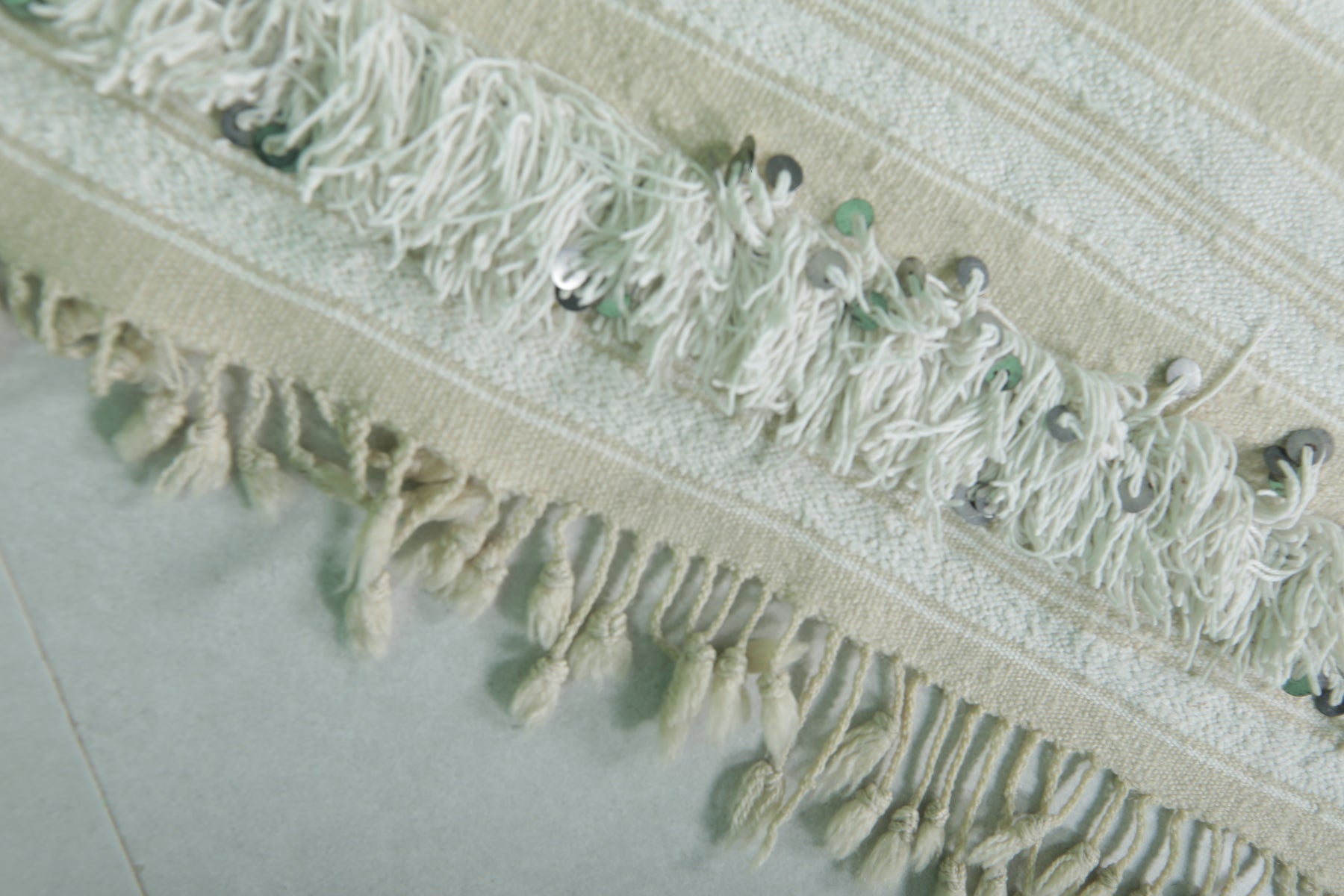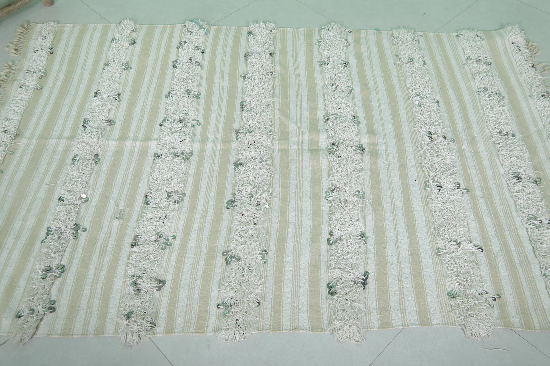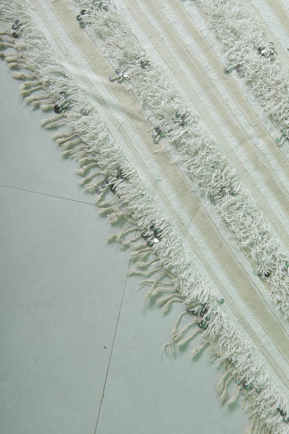 Add refined texture and heritage to your home with this Berber Wedding Blanket Rug, sized at 3.7 x 5.5 feet. Handwoven in Morocco, this exquisite piece features soft neutral tones, traditional Moroccan patterns, and shimmering sequin accents for a touch of elegance. Ideal as a decorative throw, bed cover, or cozy rug, it brings timeless beauty to any space.