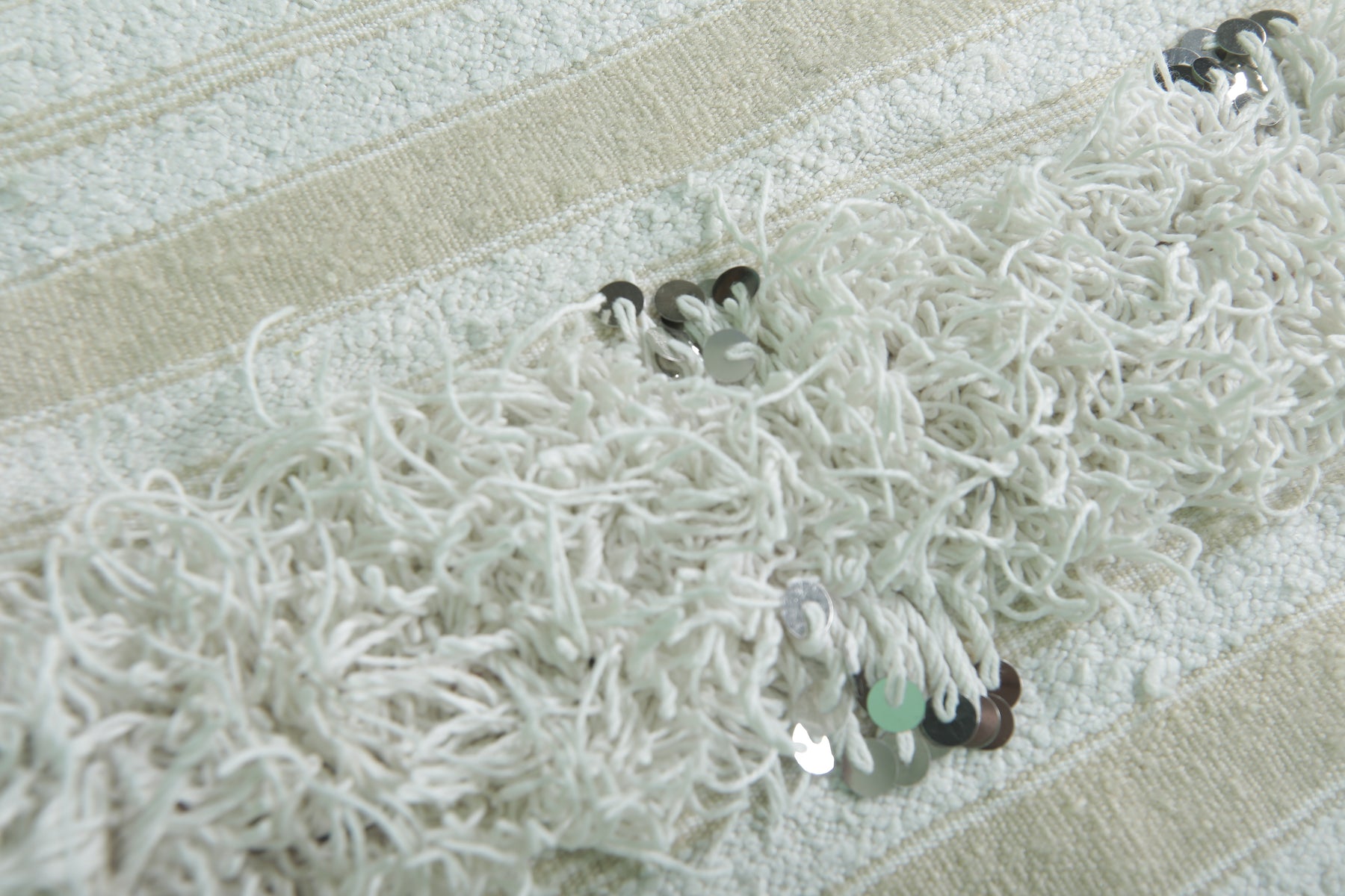 - Made from natural wool and cotton, accented with hand-applied metallic sequins.