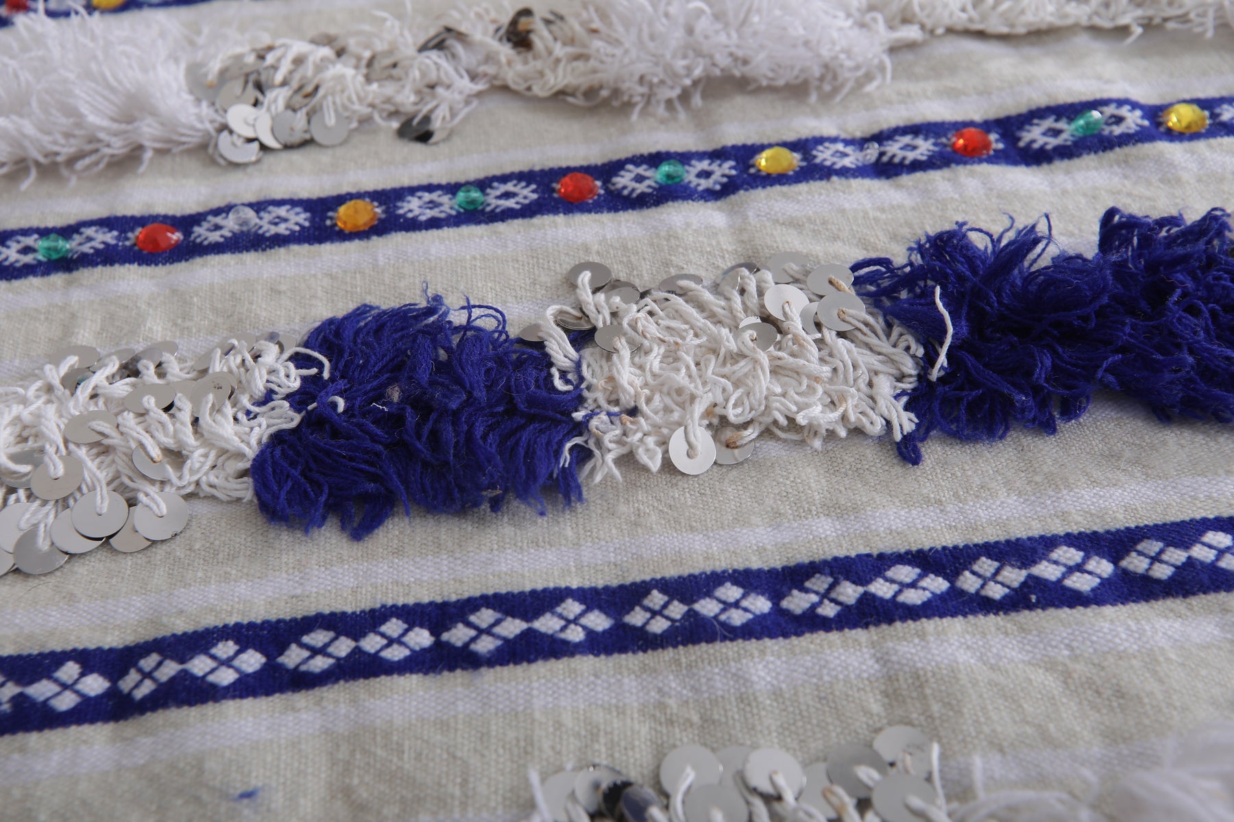 Add bold elegance and cultural flair with this Handwoven Berber Wedding Blue Blanket. Crafted in Morocco, this 3.5 FT x 5.2 FT piece features vibrant blue accents, traditional tribal patterns, and shimmering sequins on a soft wool base. Ideal as a throw, rug, or wall hanging, it brings rich texture and visual drama to any space.