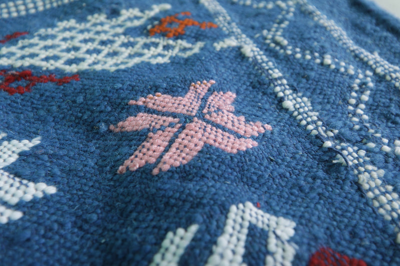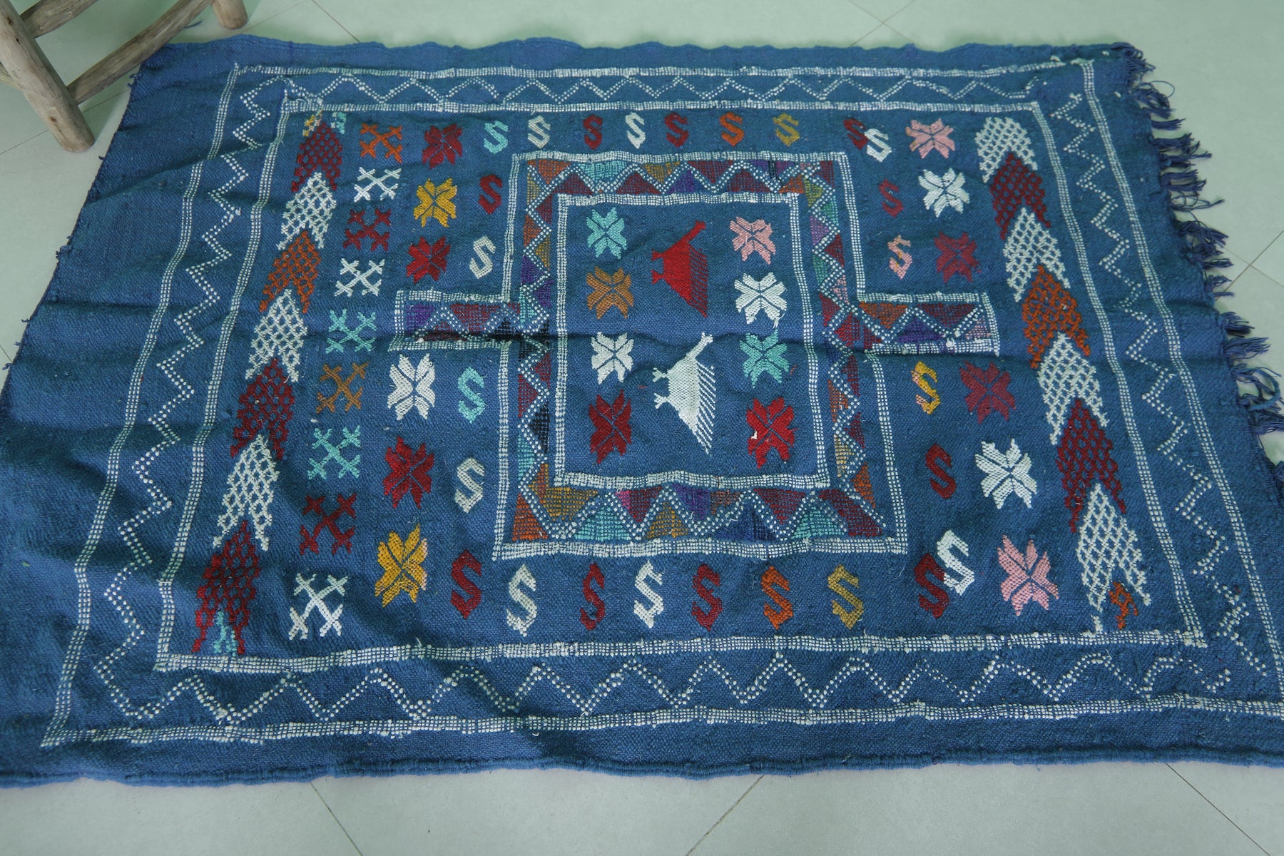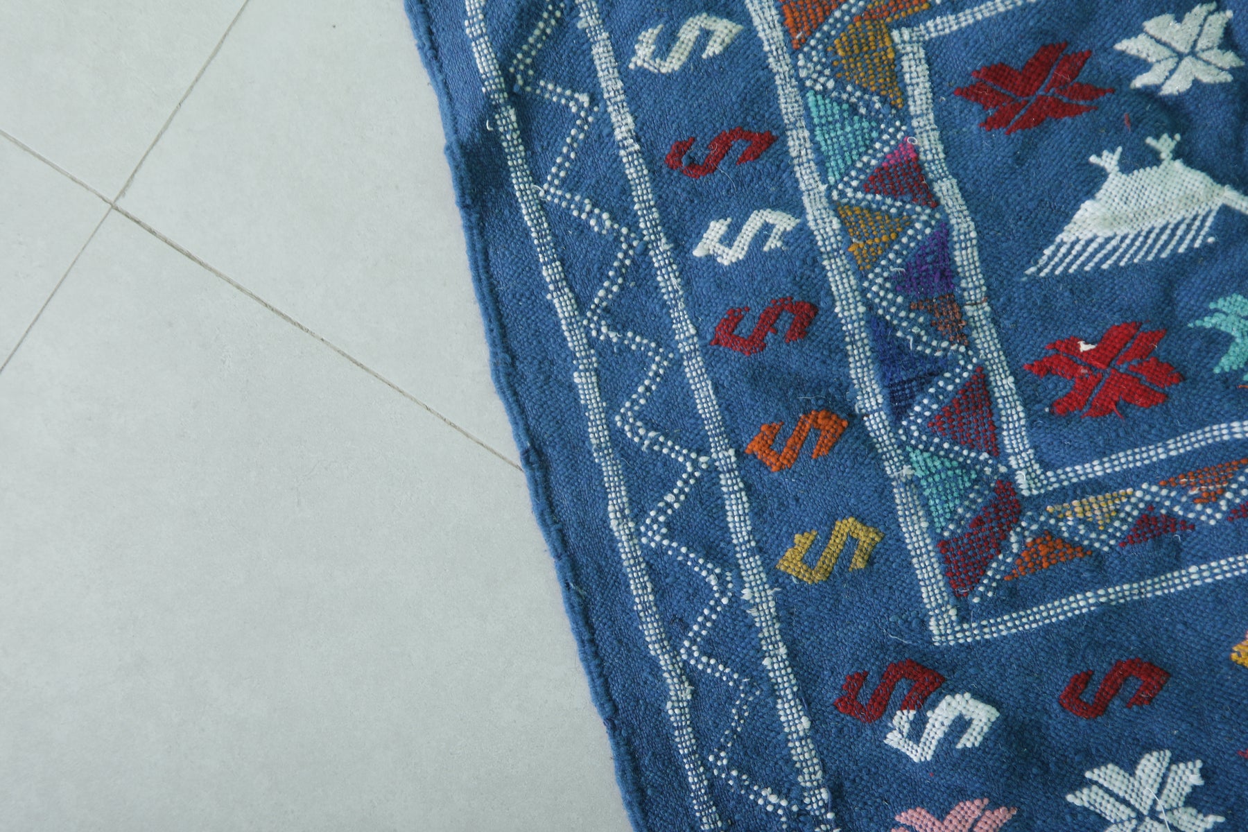This 3.2 x 4.7 feet Blue Kilim Rug features a bold indigo base adorned with vibrant handwoven geometric motifs and Berber symbols. Compact yet striking, it serves as a beautiful floor accent or decorative wall hanging, perfect for adding a touch of artisan character to your home.