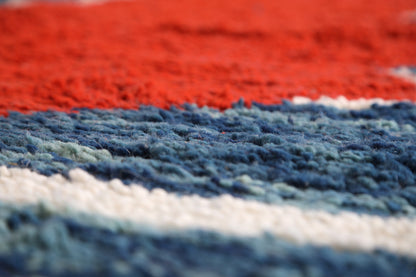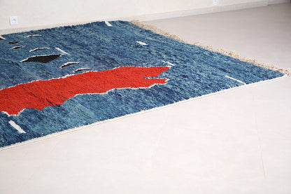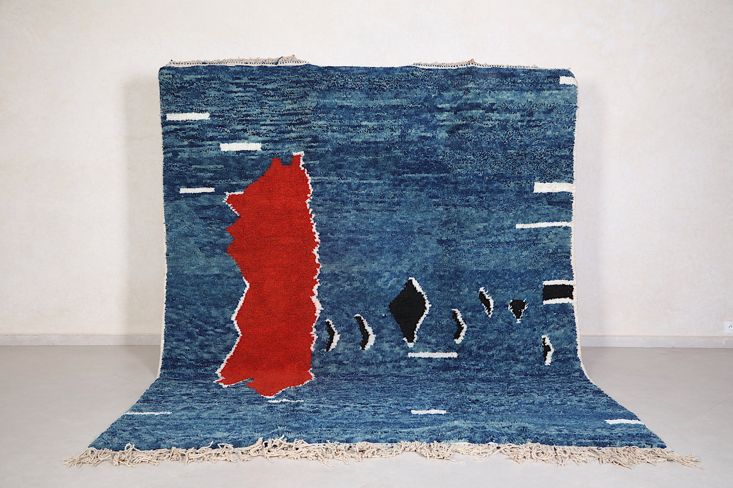 This 8.2 x 10.1 feet Blue Moroccan Beni Ourain Tribal Rug features a deep blue background accented with bold red and black abstract motifs, blending traditional craftsmanship with a striking modern aesthetic. Handwoven from 100% premium wool, it offers a plush, soft, and durable texture that enhances any space. Perfect for large living rooms, bedrooms, or statement interiors, this unique rug adds warmth, elegance, and Moroccan artistry while complementing both contemporary and bohemian décor styles.
