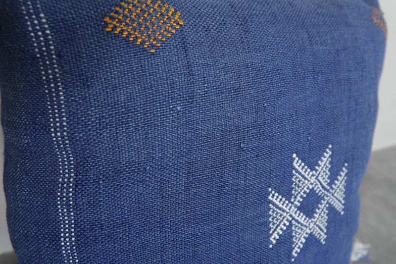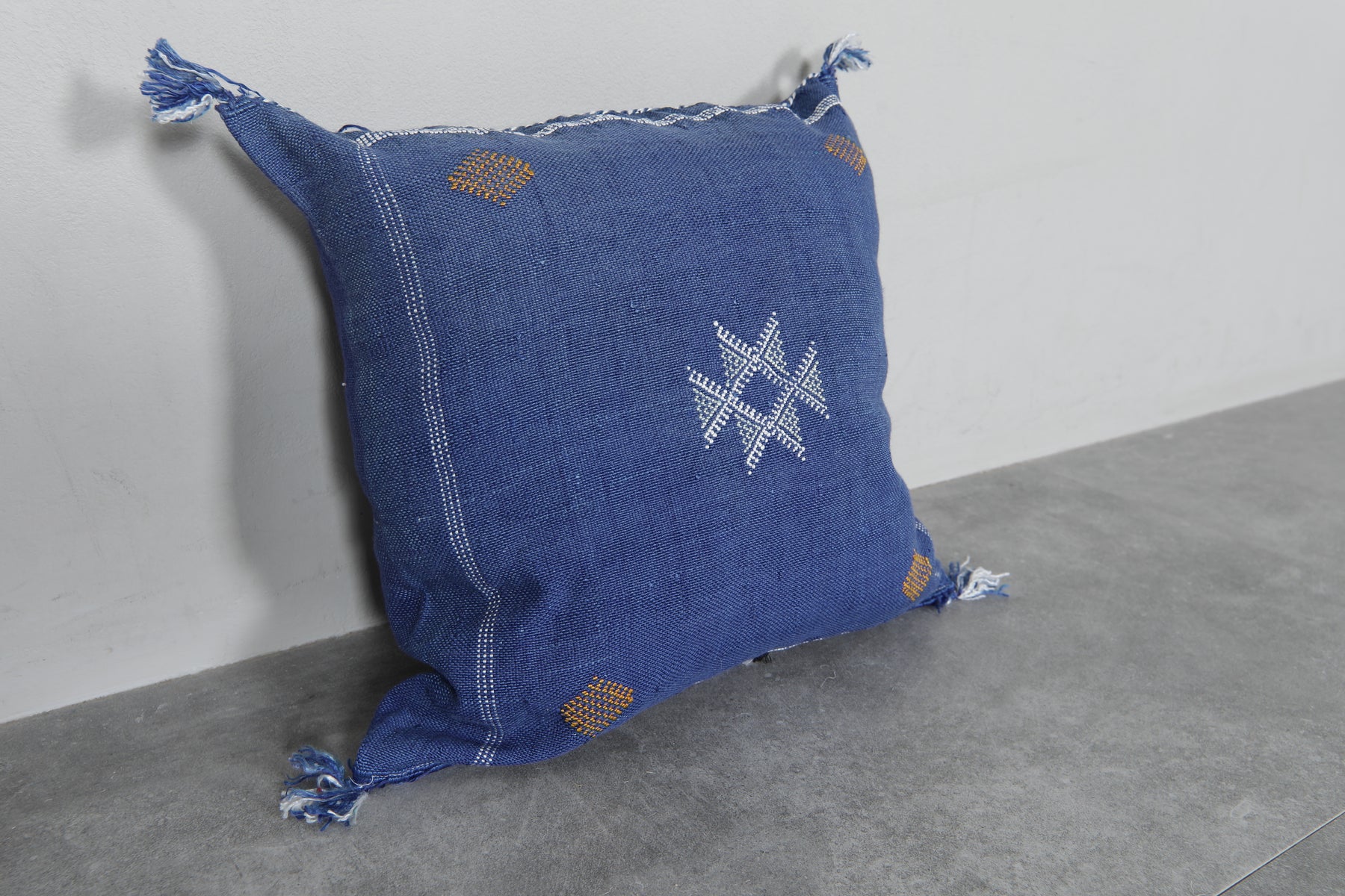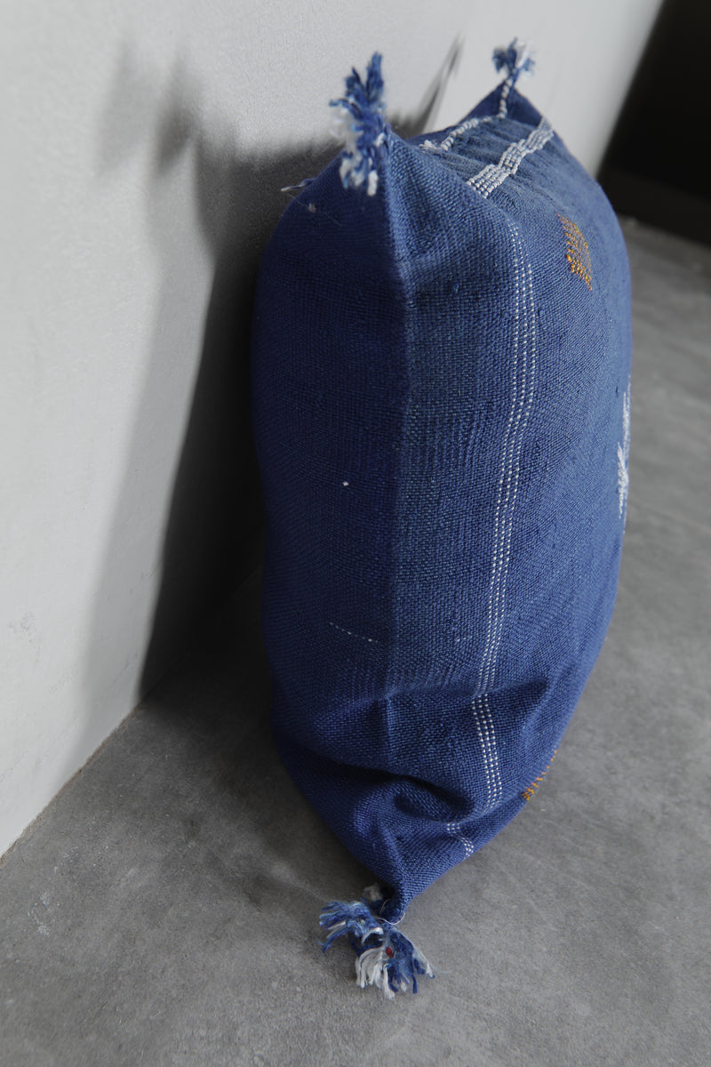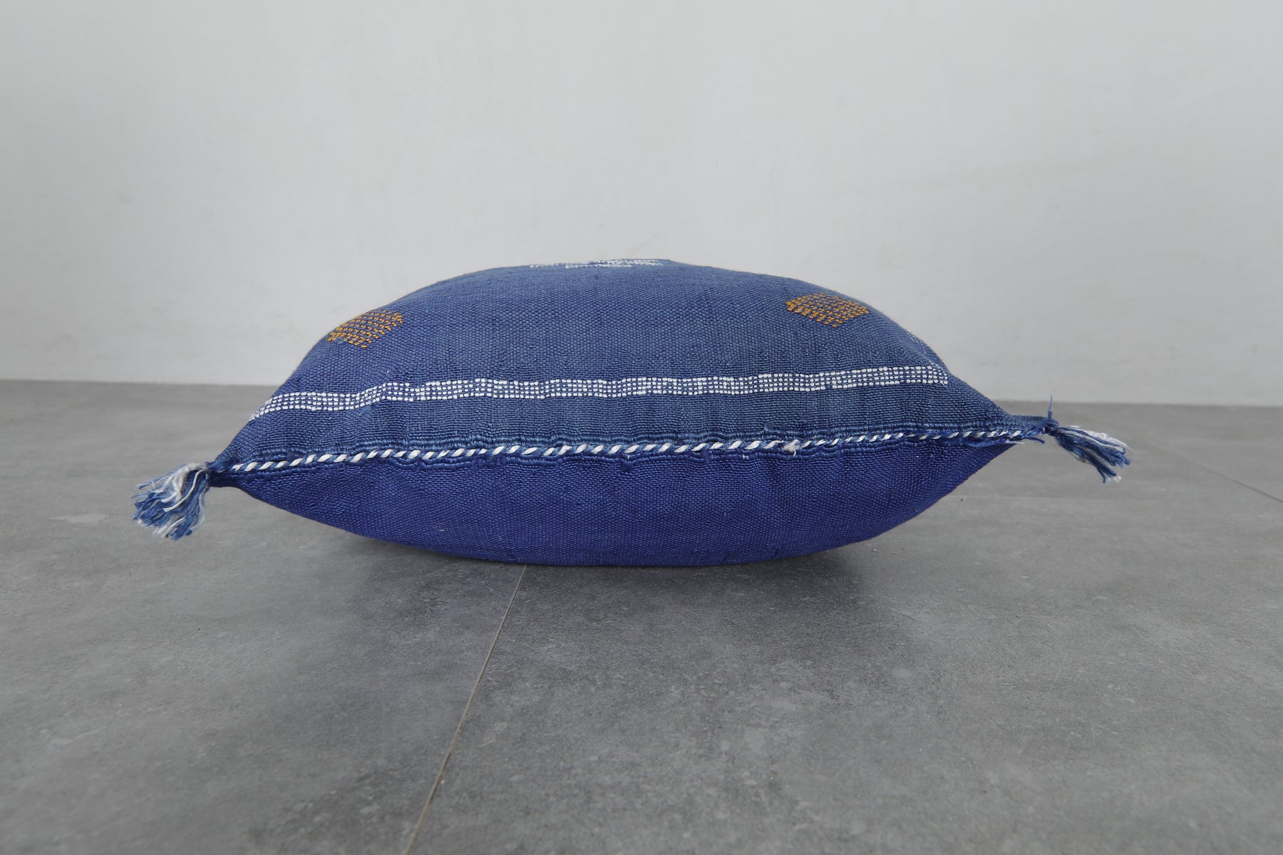 Add a serene touch to your home with this blue Moroccan sabra pillow, measuring 18x18.8 inches. Handwoven from luxurious cactus silk, it features intricate white and orange embroidery with traditional motifs. Perfect for adding elegance and texture to boho or modern interiors.