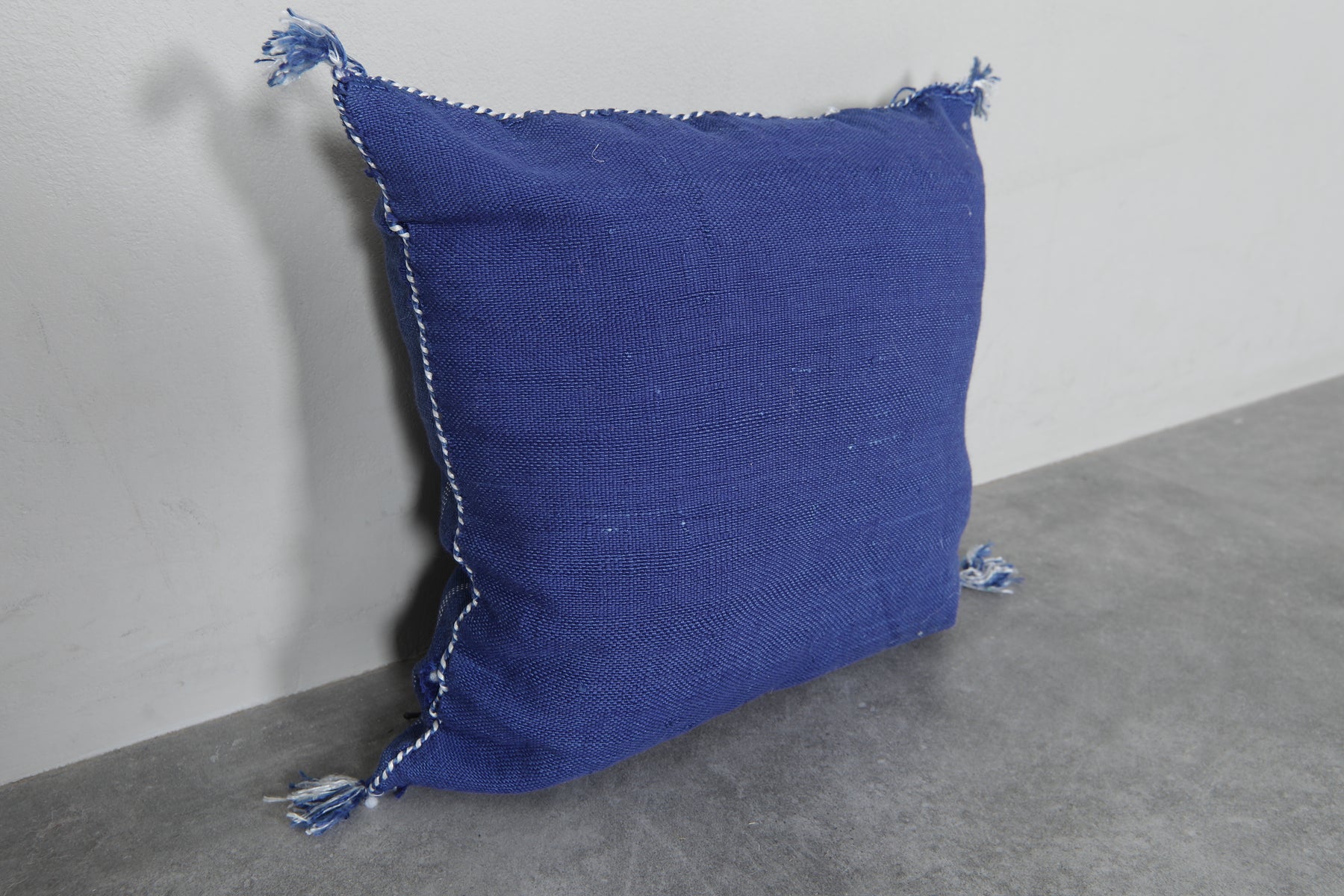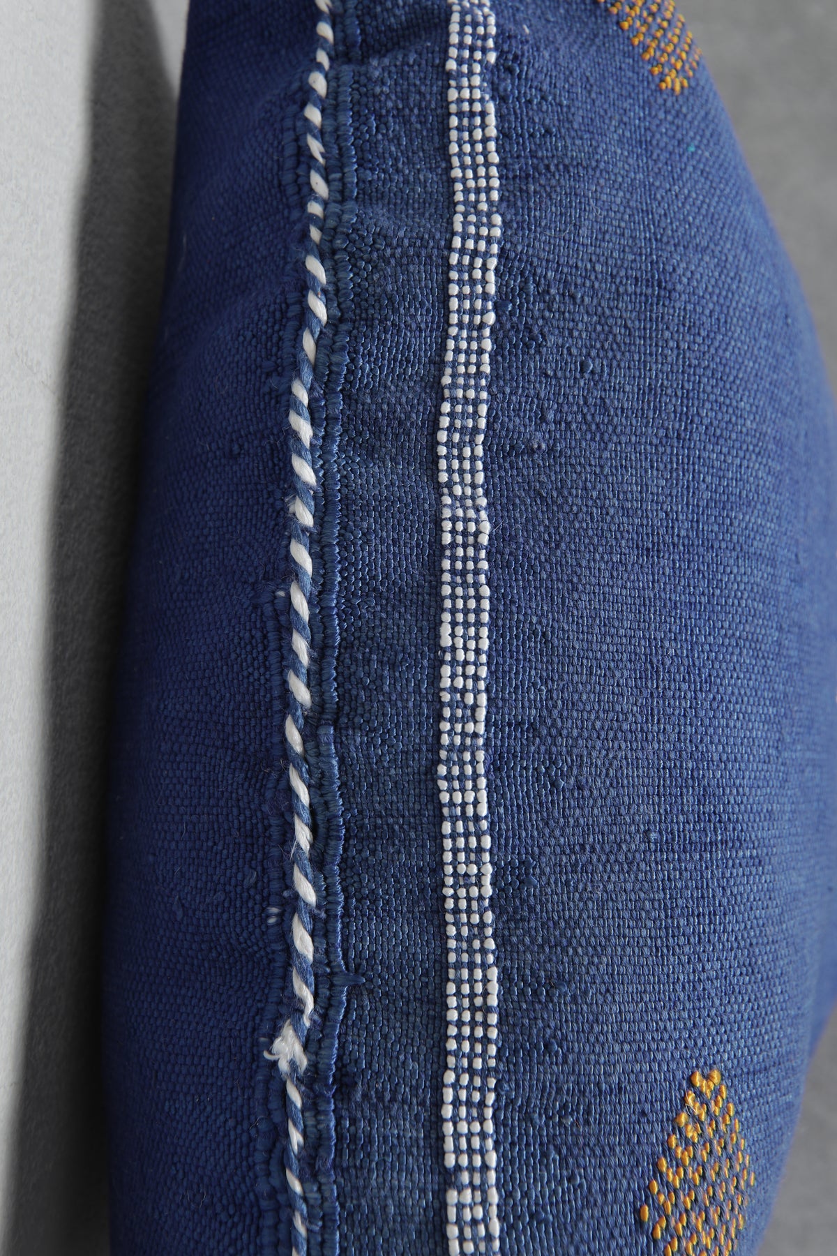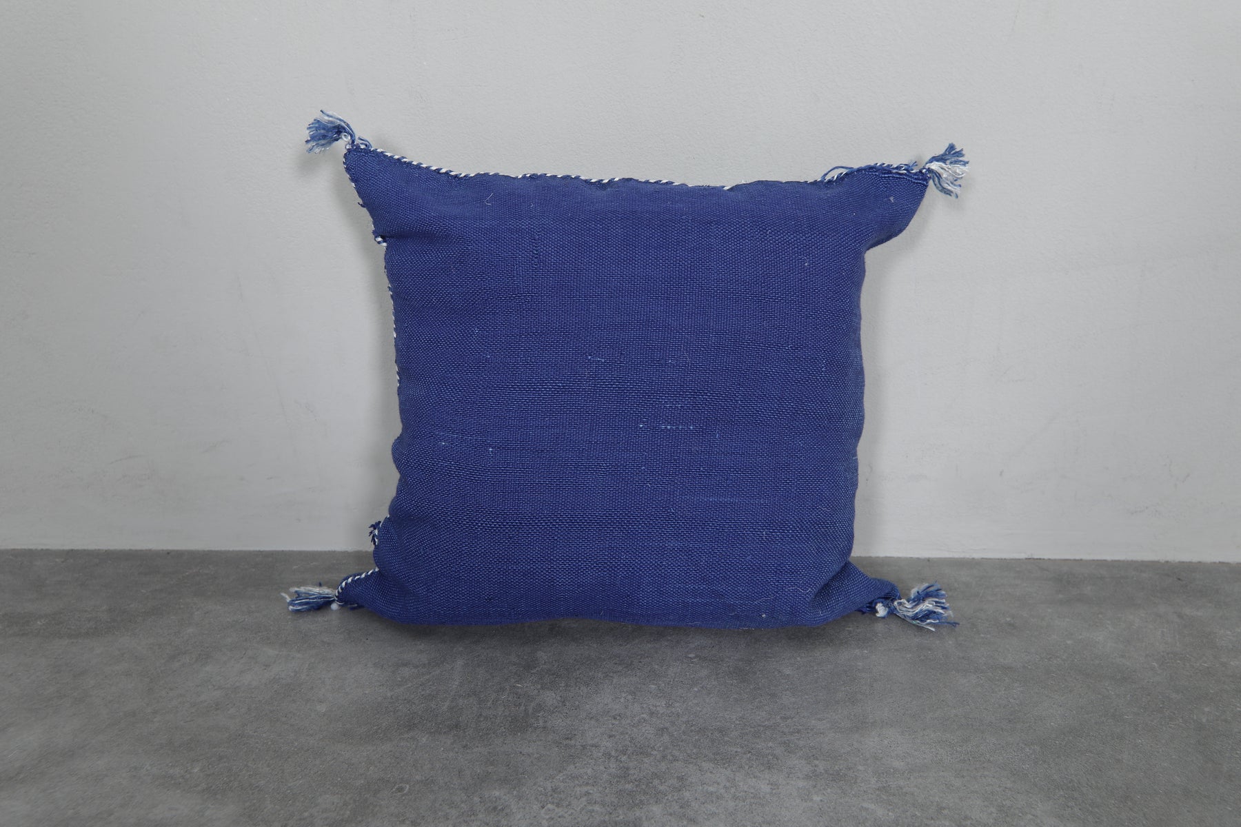 Add a serene touch to your home with this blue Moroccan sabra pillow, measuring 18x18.8 inches. Handwoven from luxurious cactus silk, it features intricate white and orange embroidery with traditional motifs. Perfect for adding elegance and texture to boho or modern interiors.