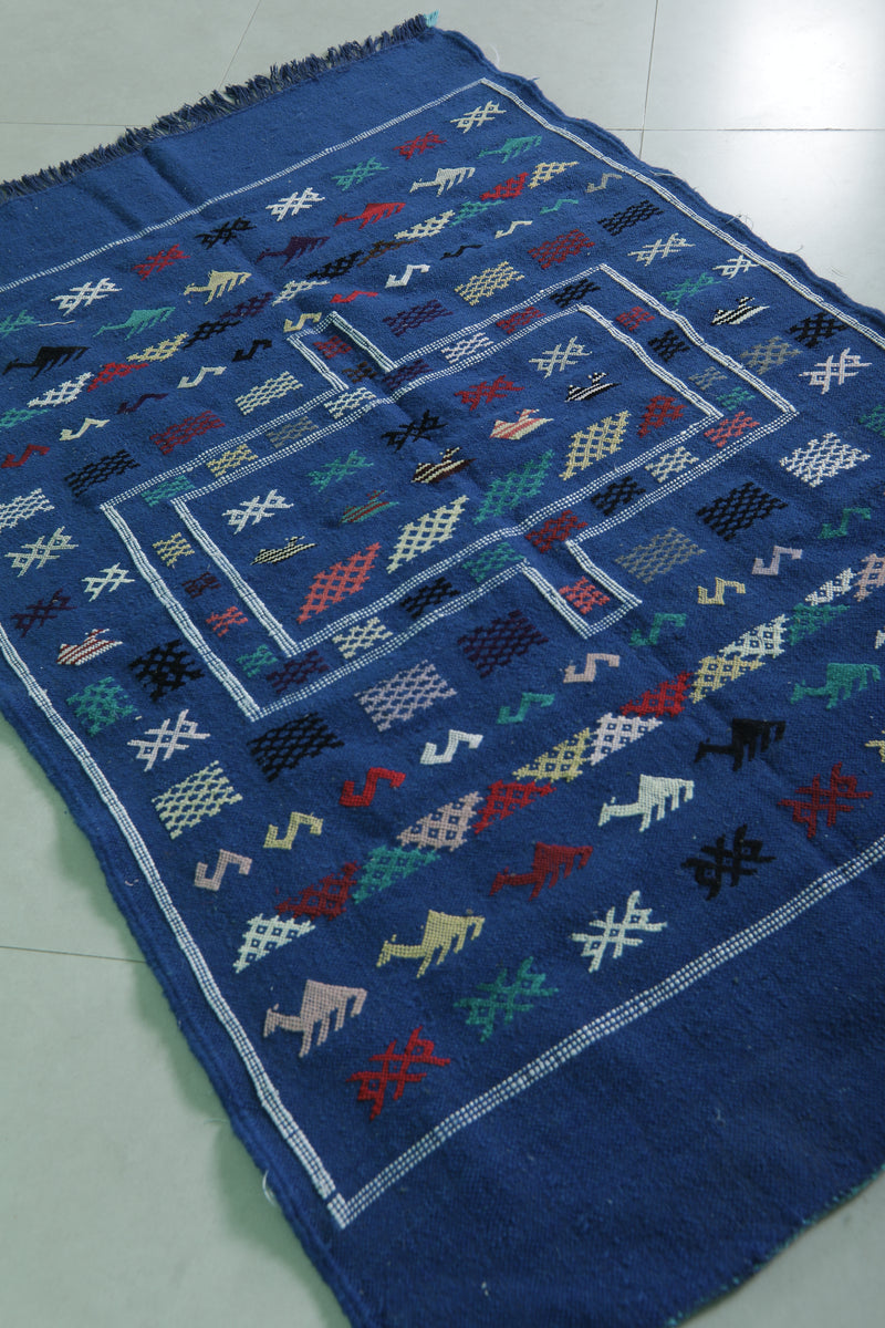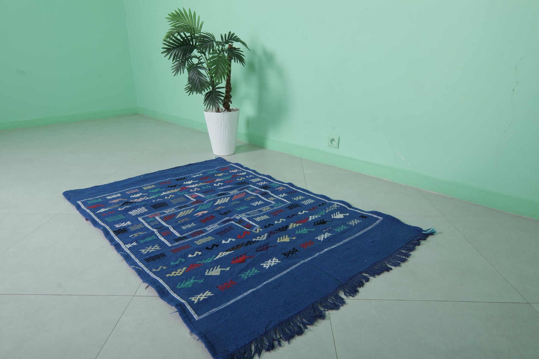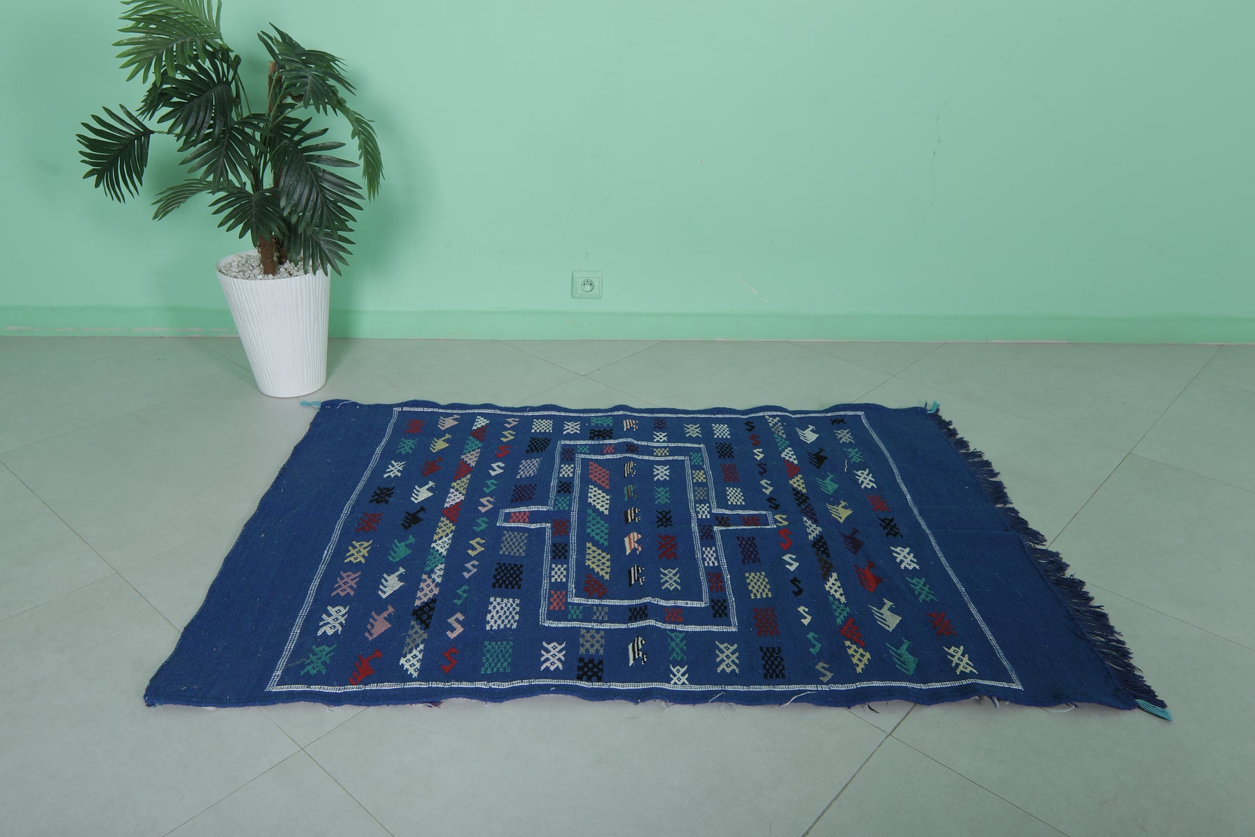 Blue Vintage Moroccan Handwoven Kilim - 3.2 FT X 4.8 FT | Artisan Carpet - Handwoven Kilim