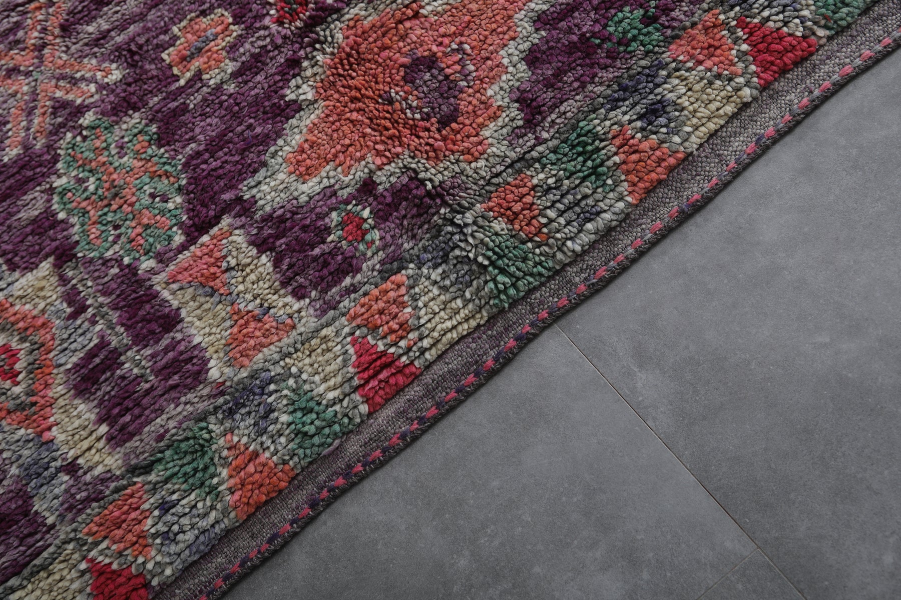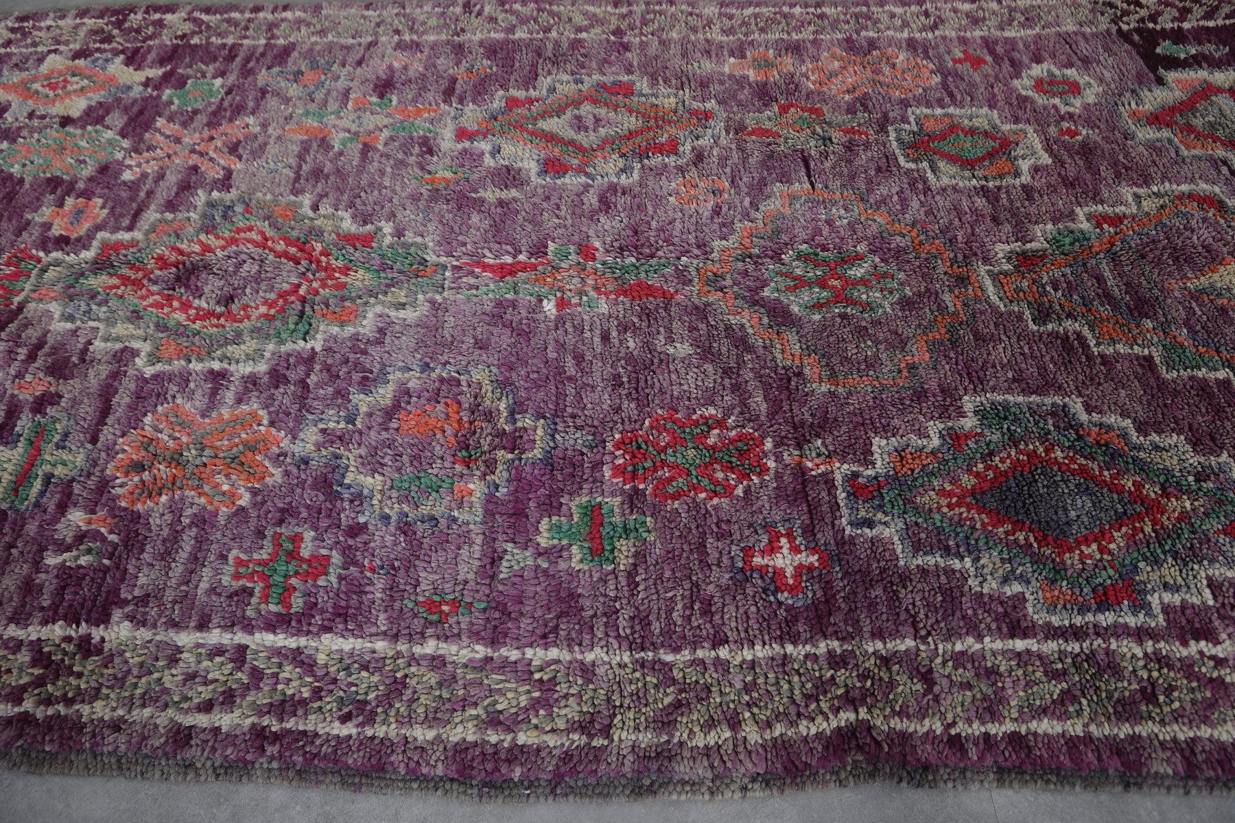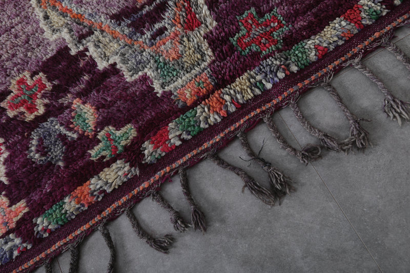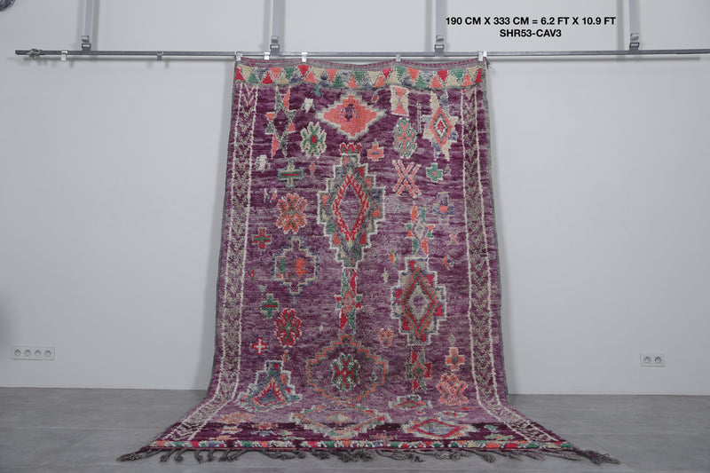 Transform your space with this stunning Boujaad Moroccan rug, measuring 6.2 FT x 10.9 FT. This handwoven wool rug showcases intricate traditional patterns, including colorful geometric medallions, diamonds, and floral motifs. The vibrant hues of deep purple, green, red, and soft pink are beautifully blended, creating a captivating vintage look. Each symbol tells a cultural story, while the plush texture provides warmth and luxury underfoot. Perfect for living rooms, bedrooms, or statement spaces, this unique Moroccan rug adds an artisanal touch of timeless elegance and charm to any decor.