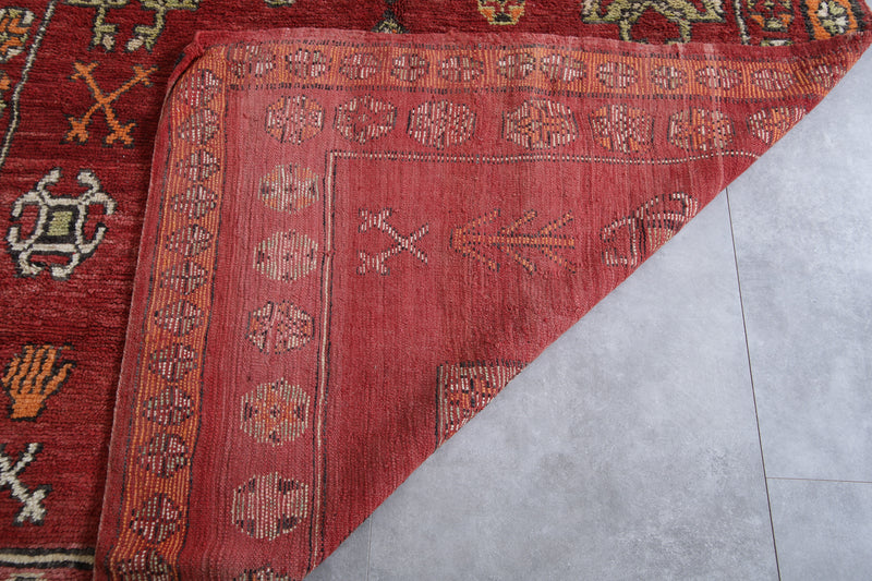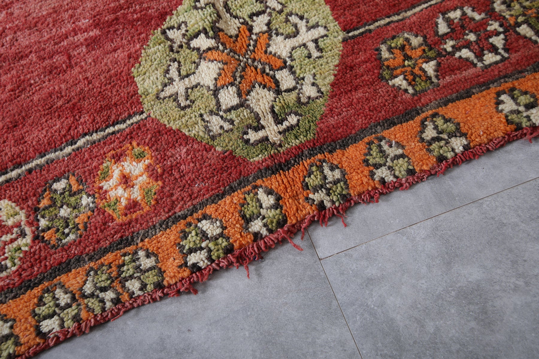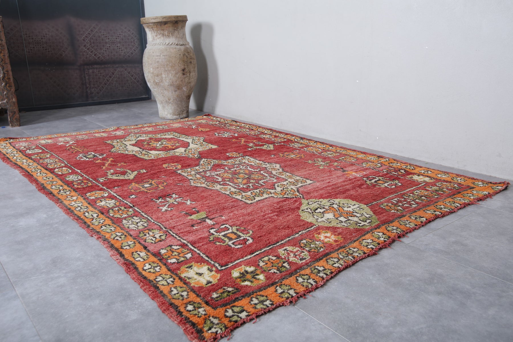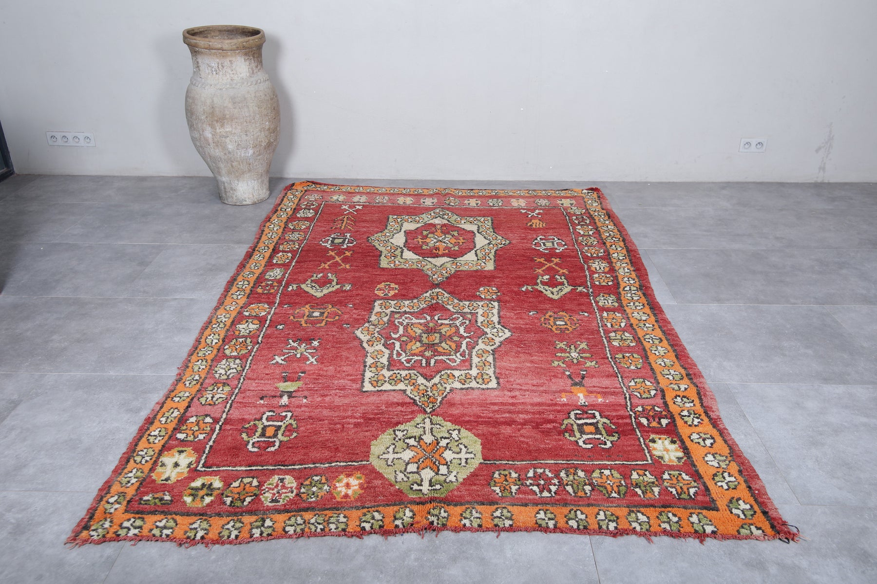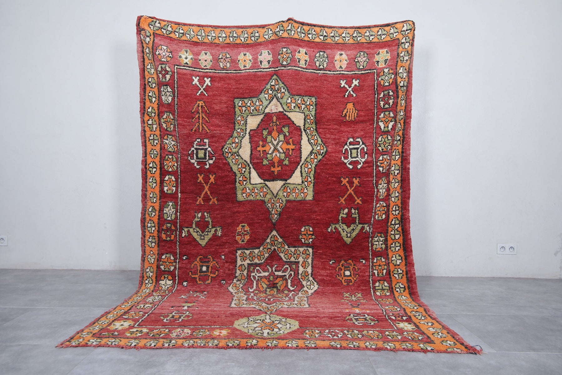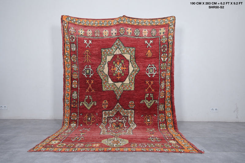 Elevate your space with this Boujaad Moroccan rug, a stunning 6.2 FT x 9.2 FT handmade masterpiece. Featuring a vibrant red background, this wool carpet showcases detailed geometric motifs, including central hexagonal medallions and intricate tribal symbols. The border is adorned with lively orange and green patterns that create a striking contrast. Its bold, traditional design and rich colors make it a perfect statement piece for living rooms, dining areas, or bedrooms. Infuse warmth, culture, and artisanal charm into your decor with this exquisite Moroccan creation.