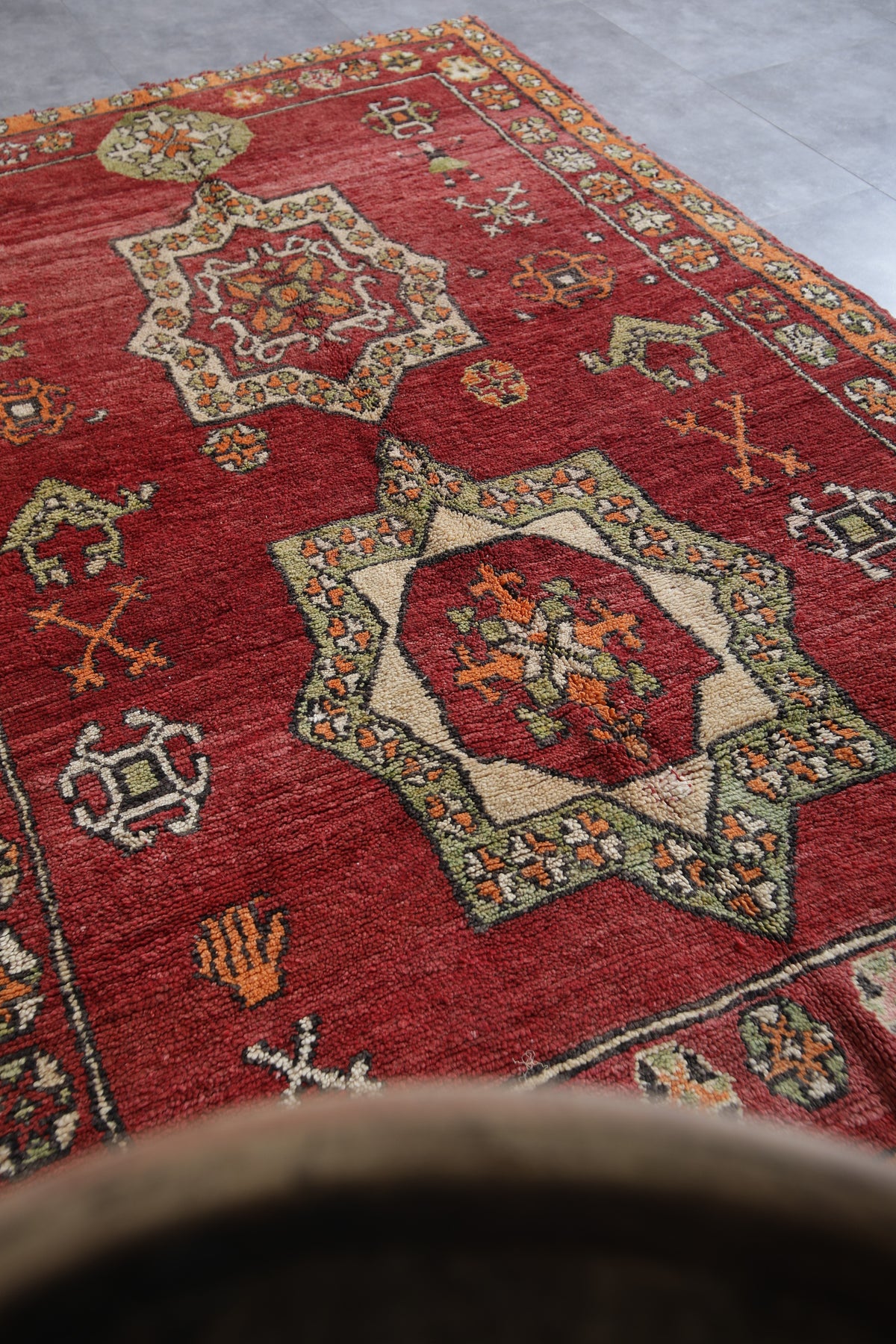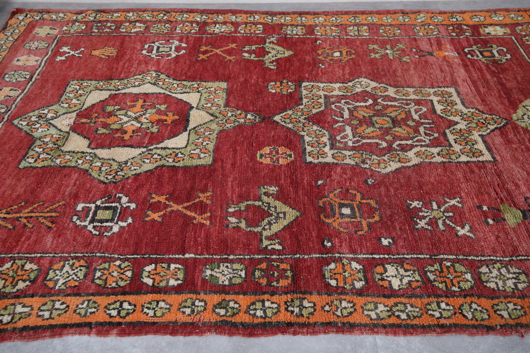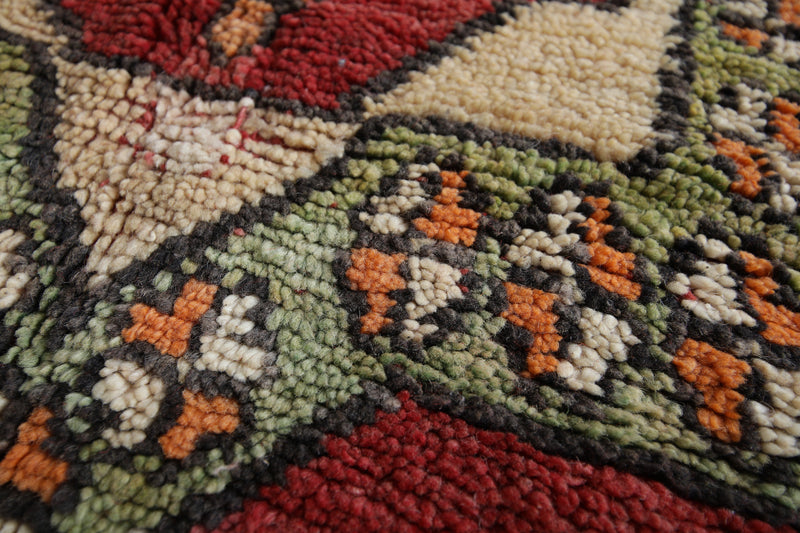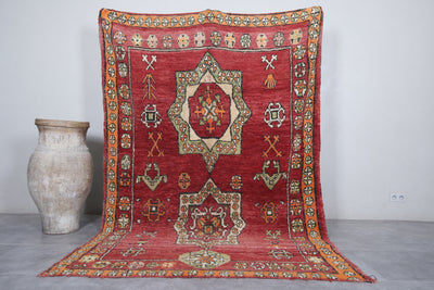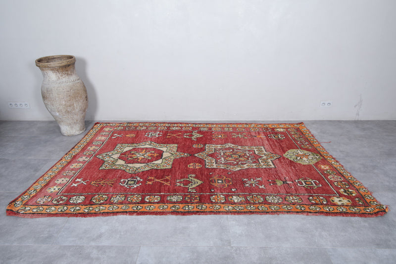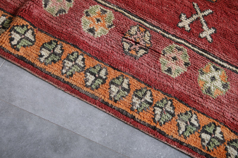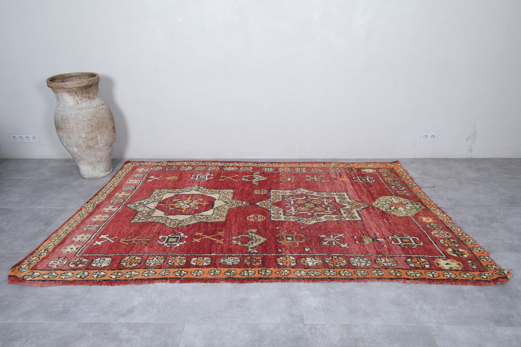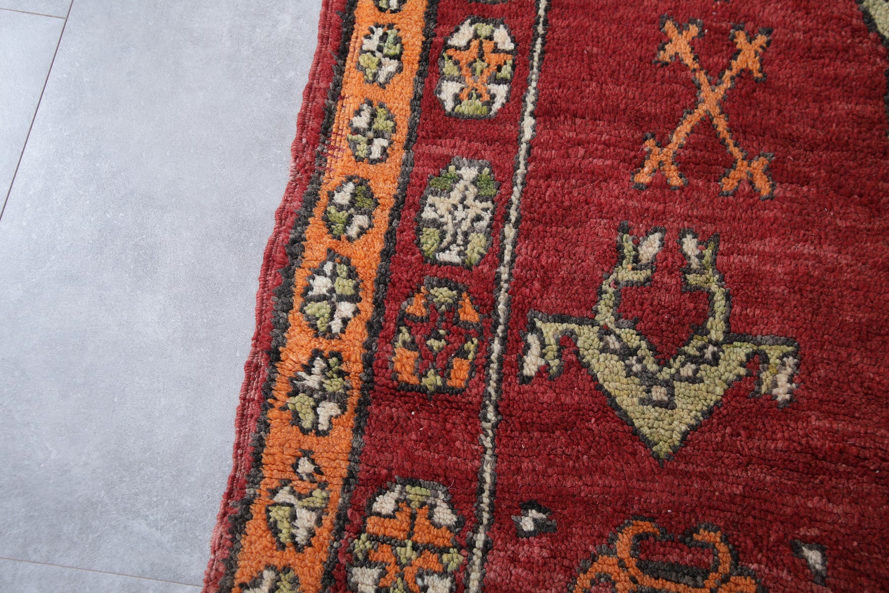 Elevate your space with this Boujaad Moroccan rug, a stunning 6.2 FT x 9.2 FT handmade masterpiece. Featuring a vibrant red background, this wool carpet showcases detailed geometric motifs, including central hexagonal medallions and intricate tribal symbols. The border is adorned with lively orange and green patterns that create a striking contrast. Its bold, traditional design and rich colors make it a perfect statement piece for living rooms, dining areas, or bedrooms. Infuse warmth, culture, and artisanal charm into your decor with this exquisite Moroccan creation.