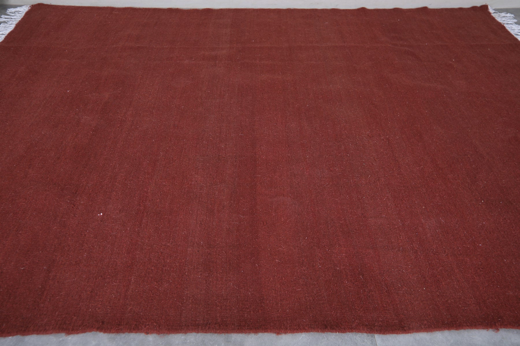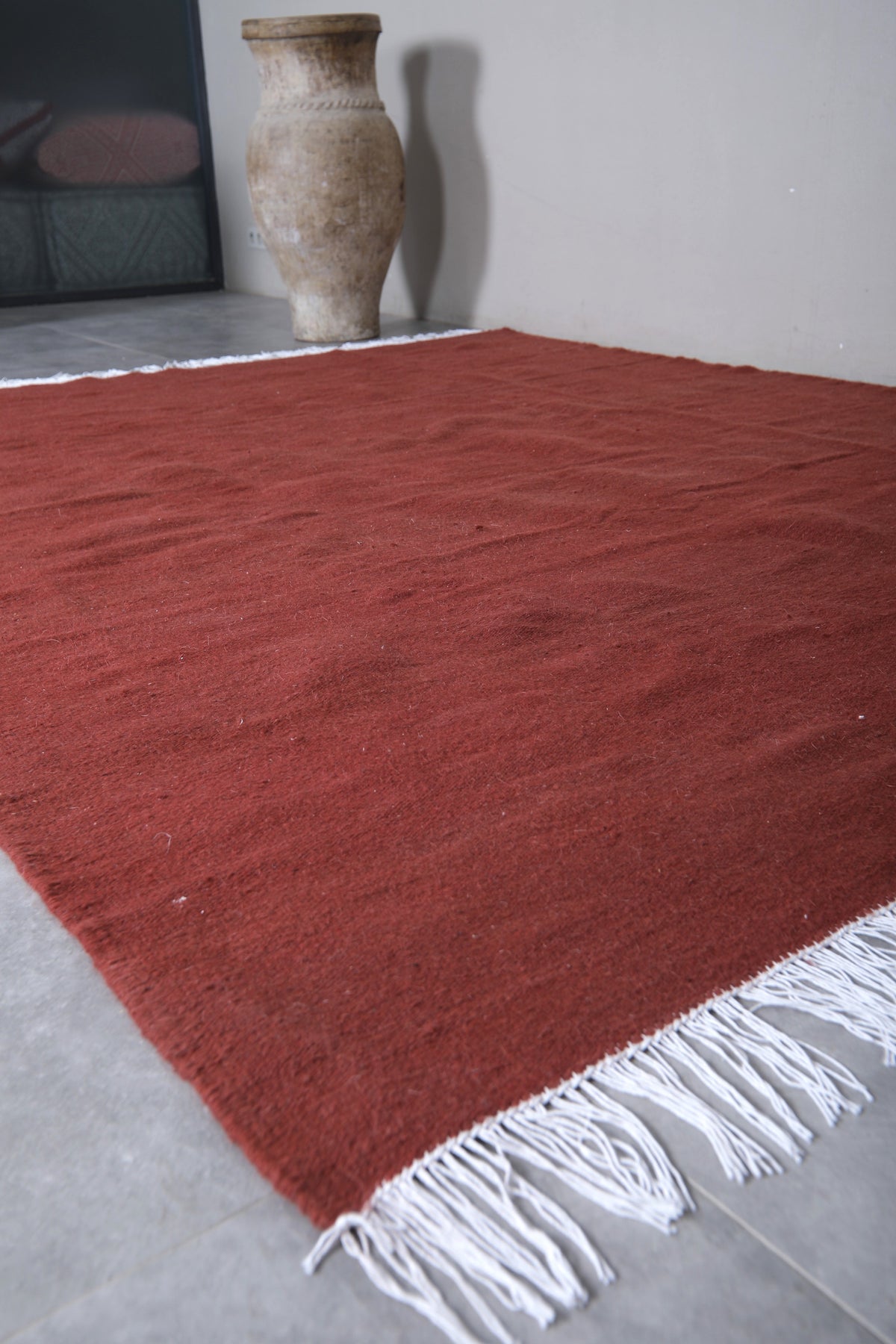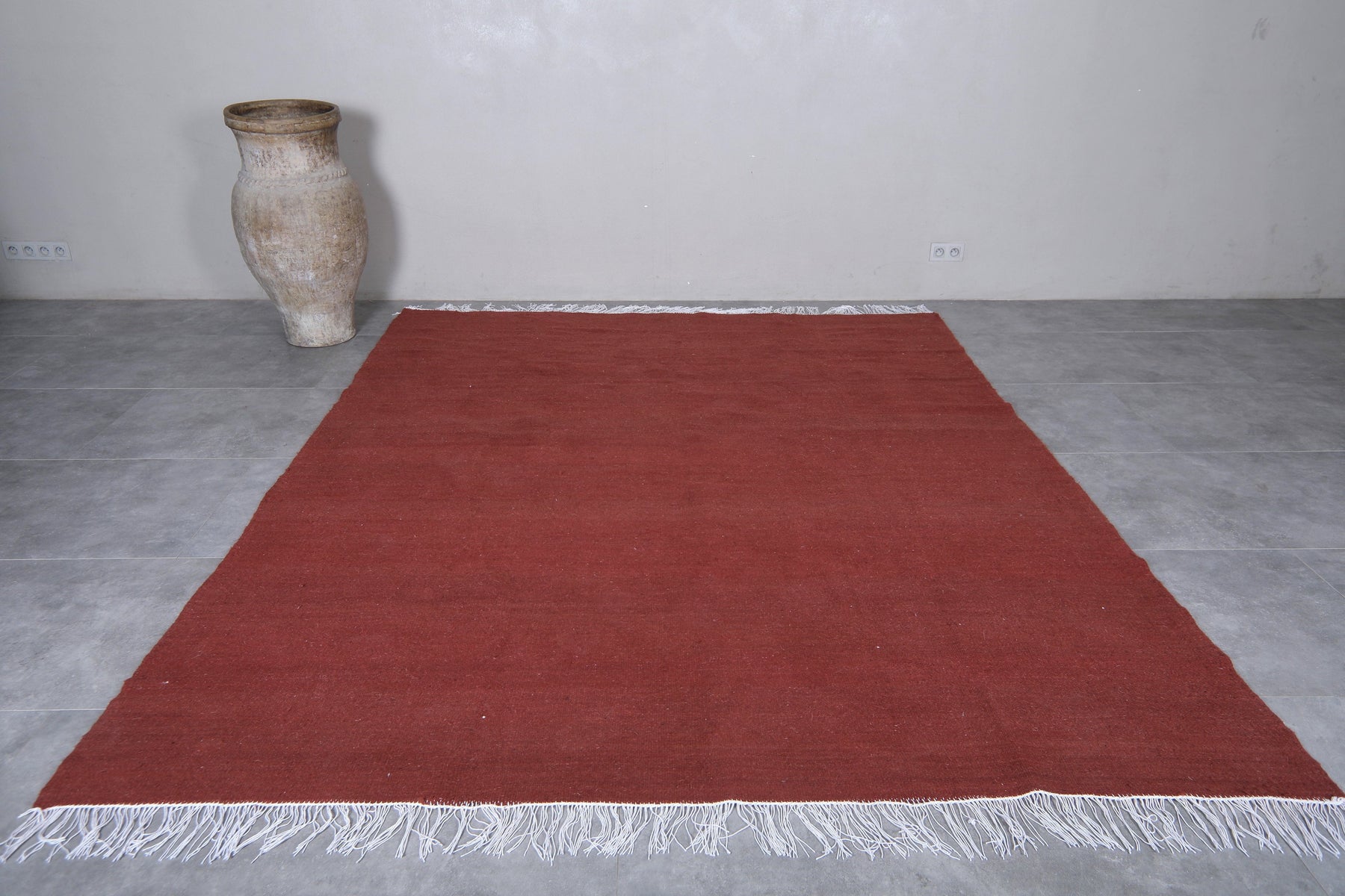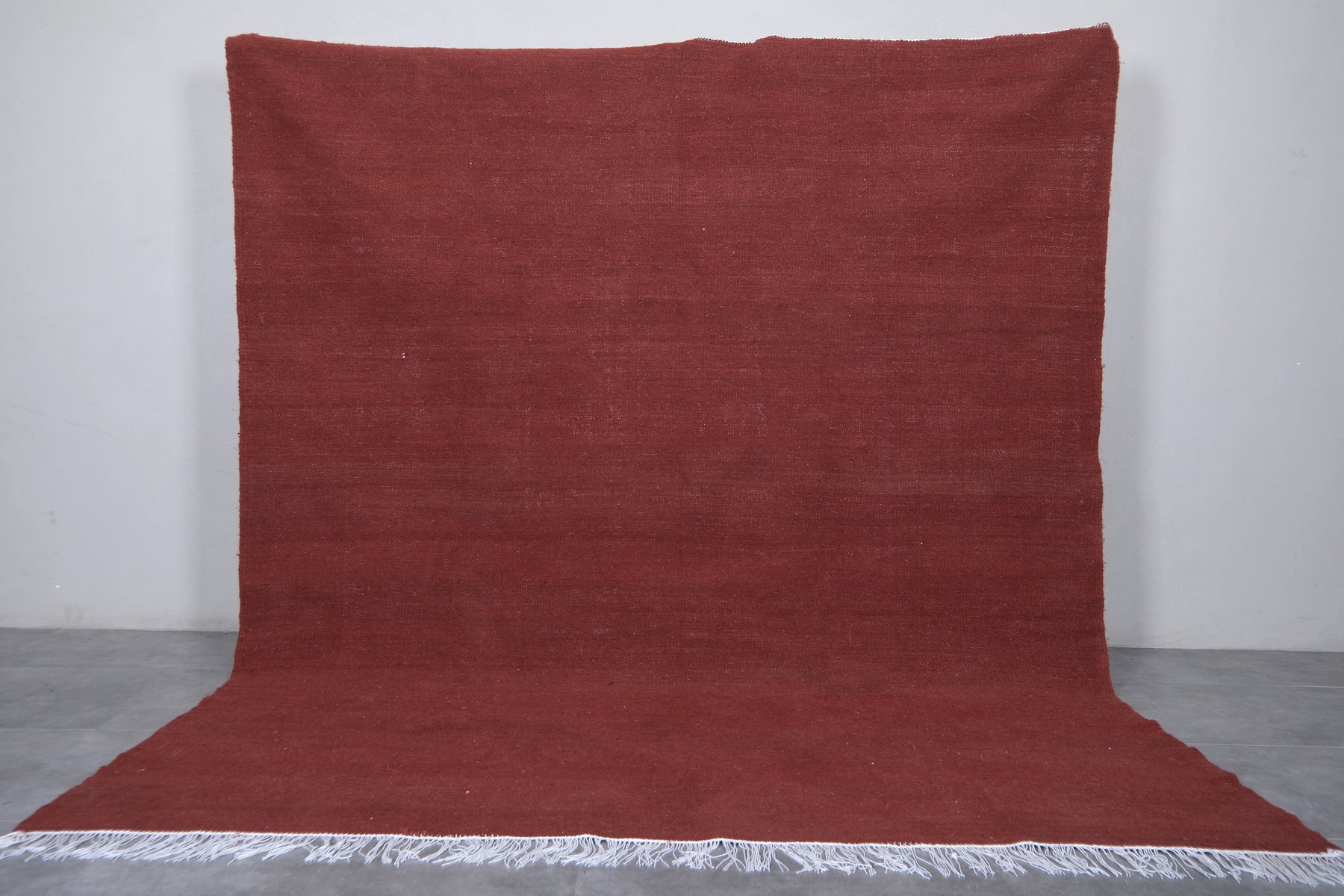 This rich brick red Moroccan flatwoven wool rug boasts a solid, warm red‑brown field that adds depth and character to any space. Handcrafted by skilled artisans in Morocco, its flat‑weave construction makes it perfect for living rooms, dining areas, or open‑plan spaces. The minimalist single‑color design offers versatile styling—pair it with modern, bohemian, or rustic interiors. Crafted from high‑quality wool, this durable rug brings both comfort and understated elegance to your home. Available in custom sizes to match your unique floorplan and décor needs.