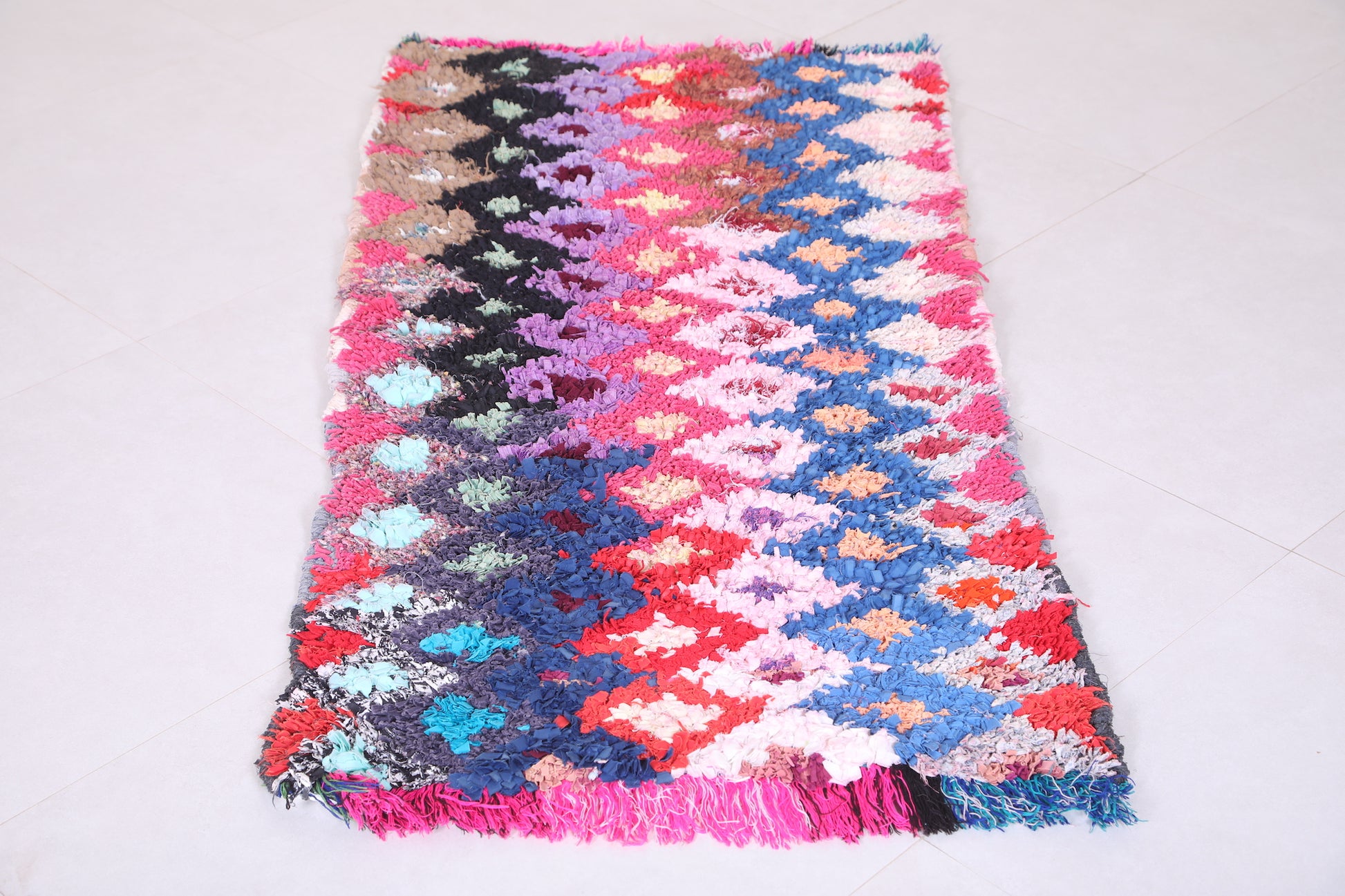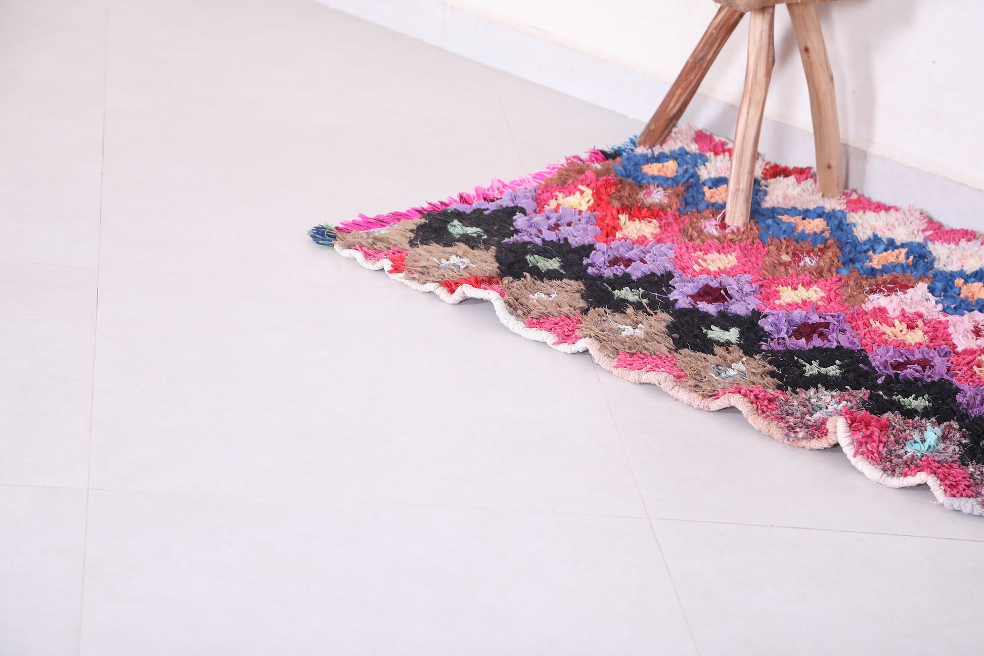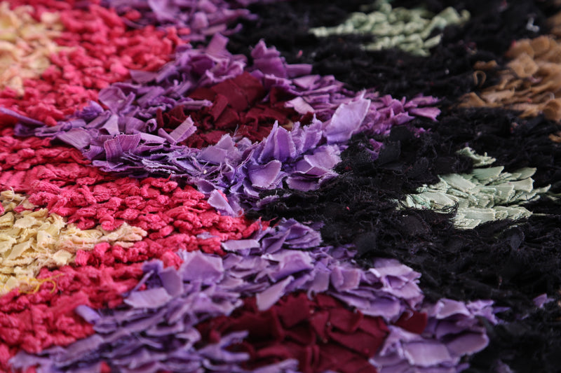 • Handwoven in Morocco using Boucherouite rug techniques