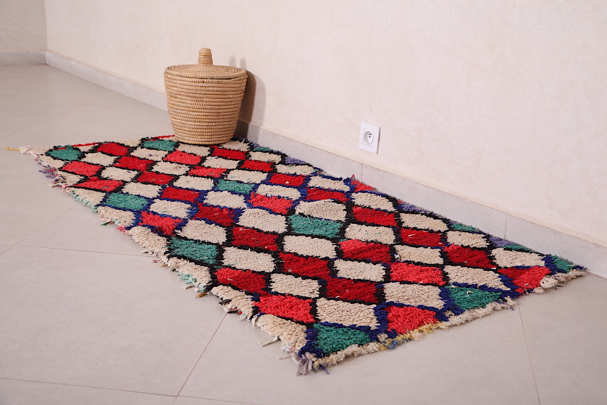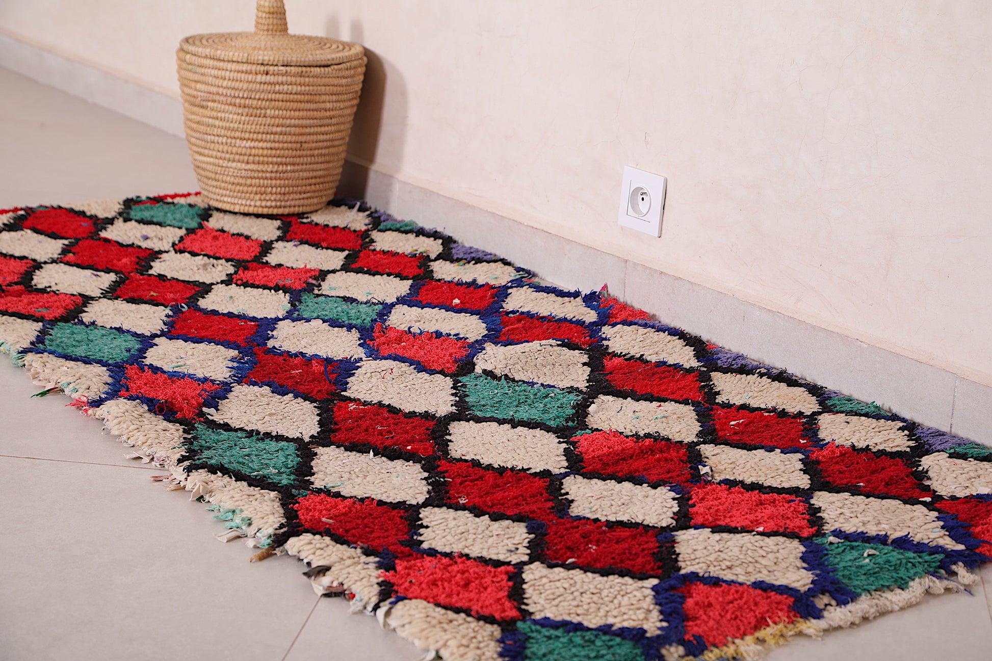 Add a burst of color and cultural elegance with this Colorful Handmade Moroccan Trellis Rug, sized at 2.6 x 5.8 feet. Lovingly handwoven in Morocco, this eye-catching piece features a trellis pattern of interlocking diamonds in vivid hues of green, red, blue, pink, and black, all set against a soft ivory background. Its plush shag texture adds warmth and comfort, making it ideal for hallways, bedrooms, or any space in need of a playful, artisan touch.