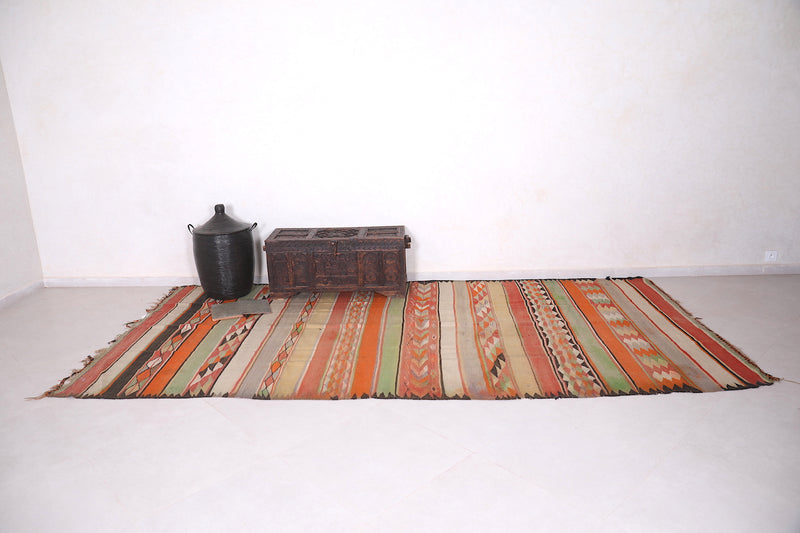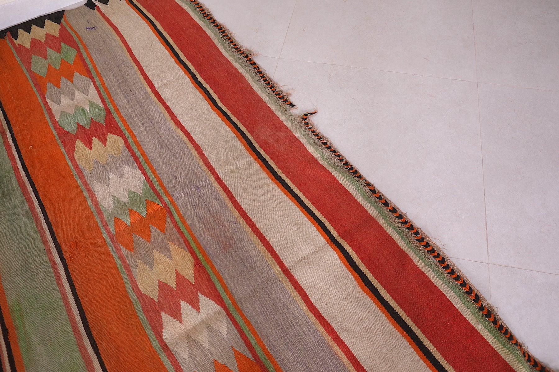 This 6.2 x 12.3 feet Colorful Handwoven Kilim Rug is a vibrant masterpiece, featuring bold geometric patterns in warm earthy tones of orange, green, and beige. Handcrafted with traditional artistry, this rug adds charm and sophistication to larger living rooms, dining spaces, or creative areas.