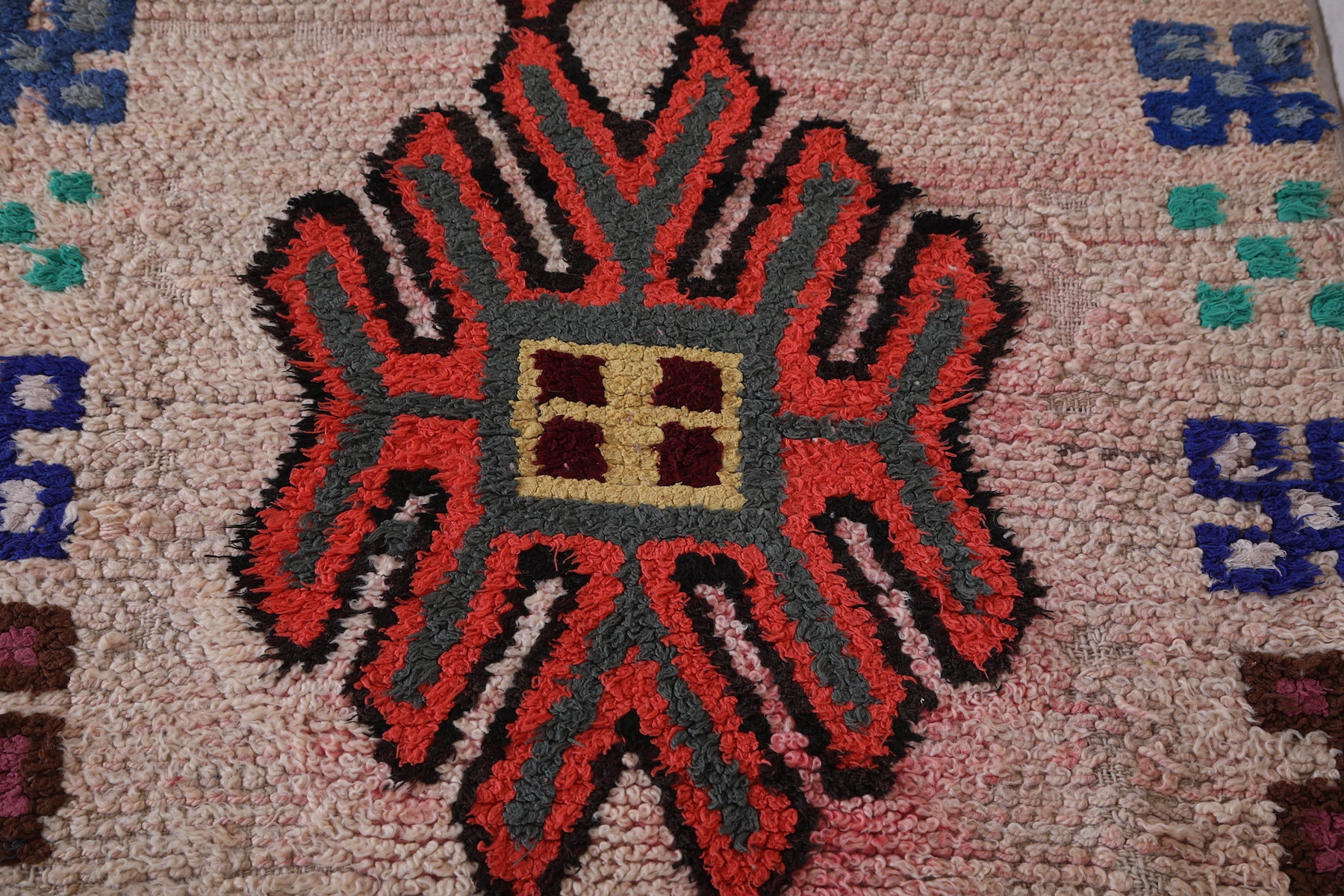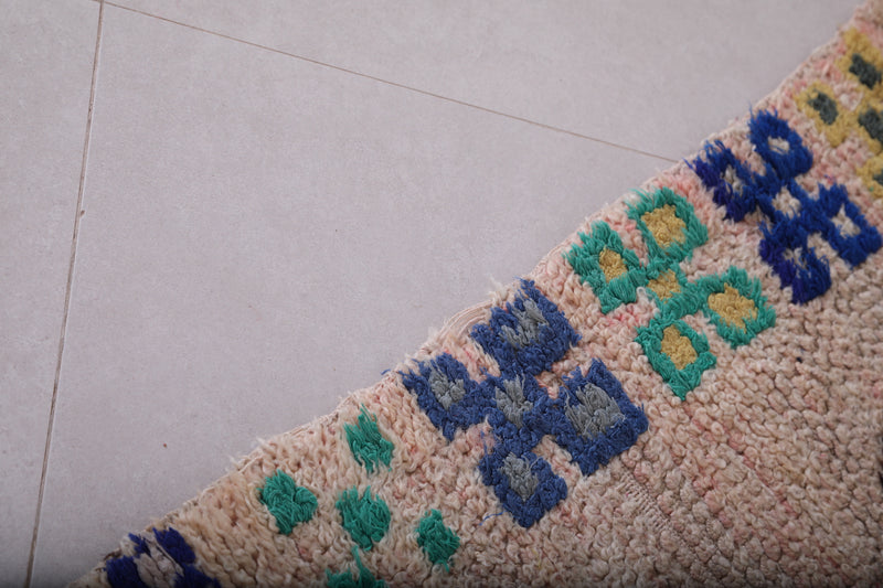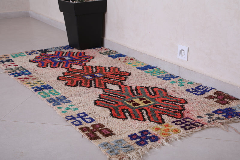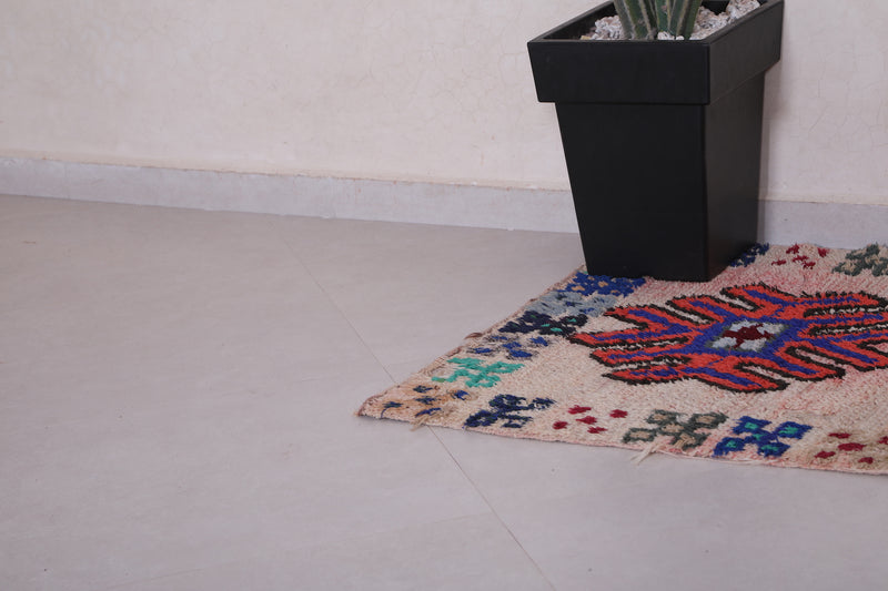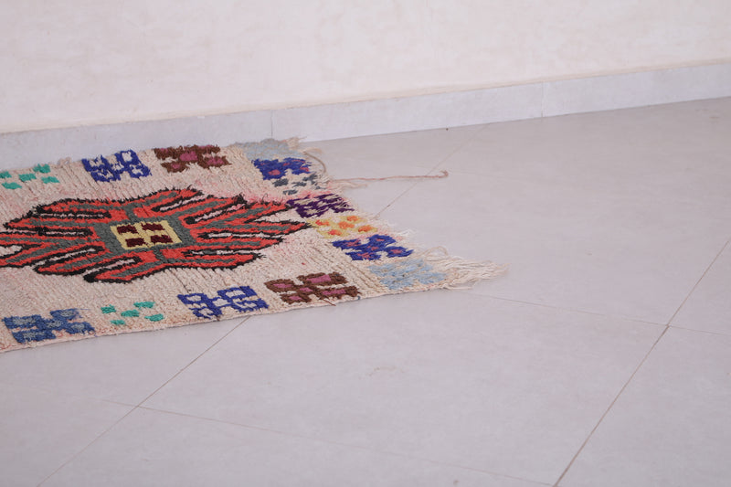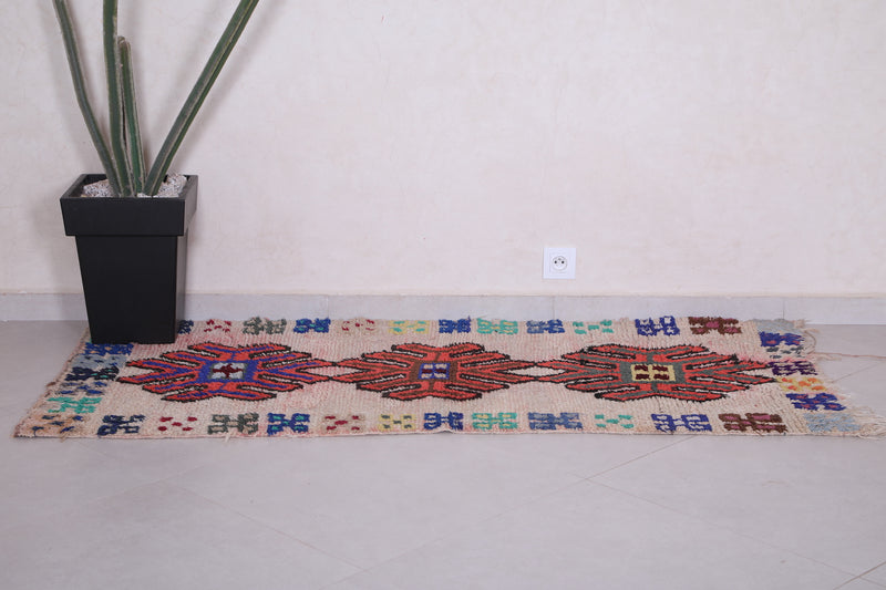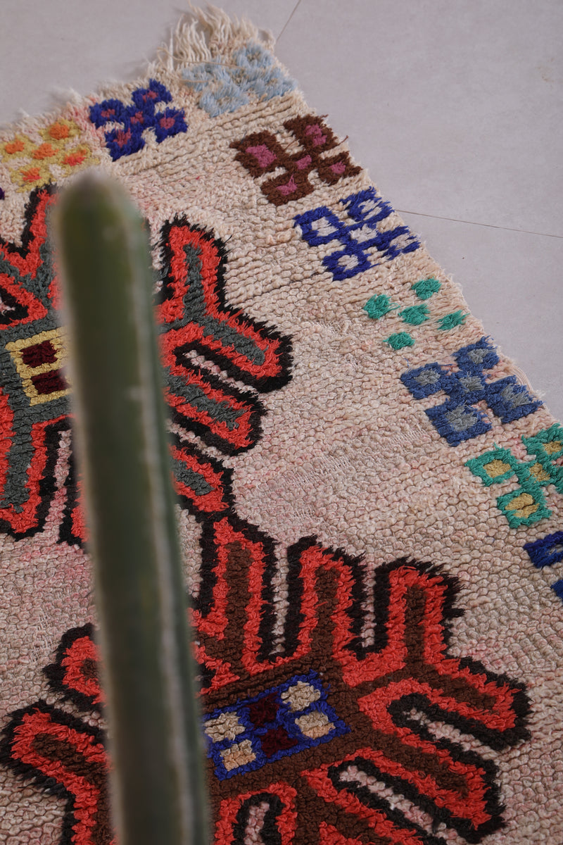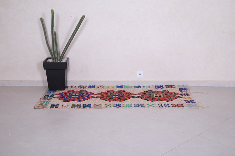 Energize your space with this Colorful Moroccan Berber Runner Rug (2.7 x 5.9 FT), featuring bold tribal motifs in rich reds, blues, purples, and greens set against a creamy background.