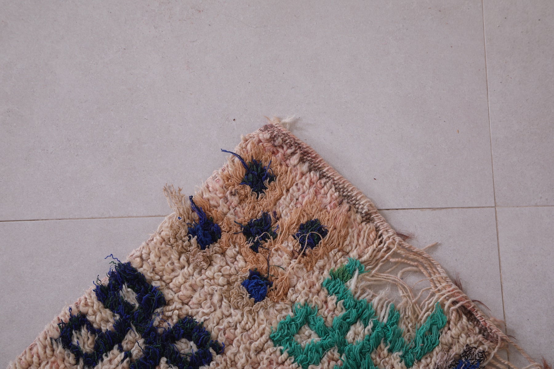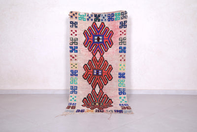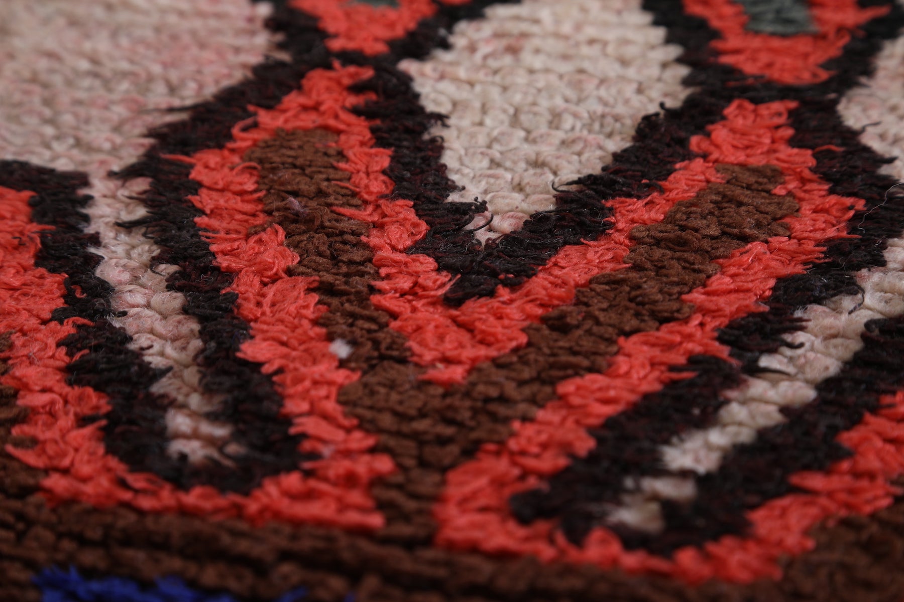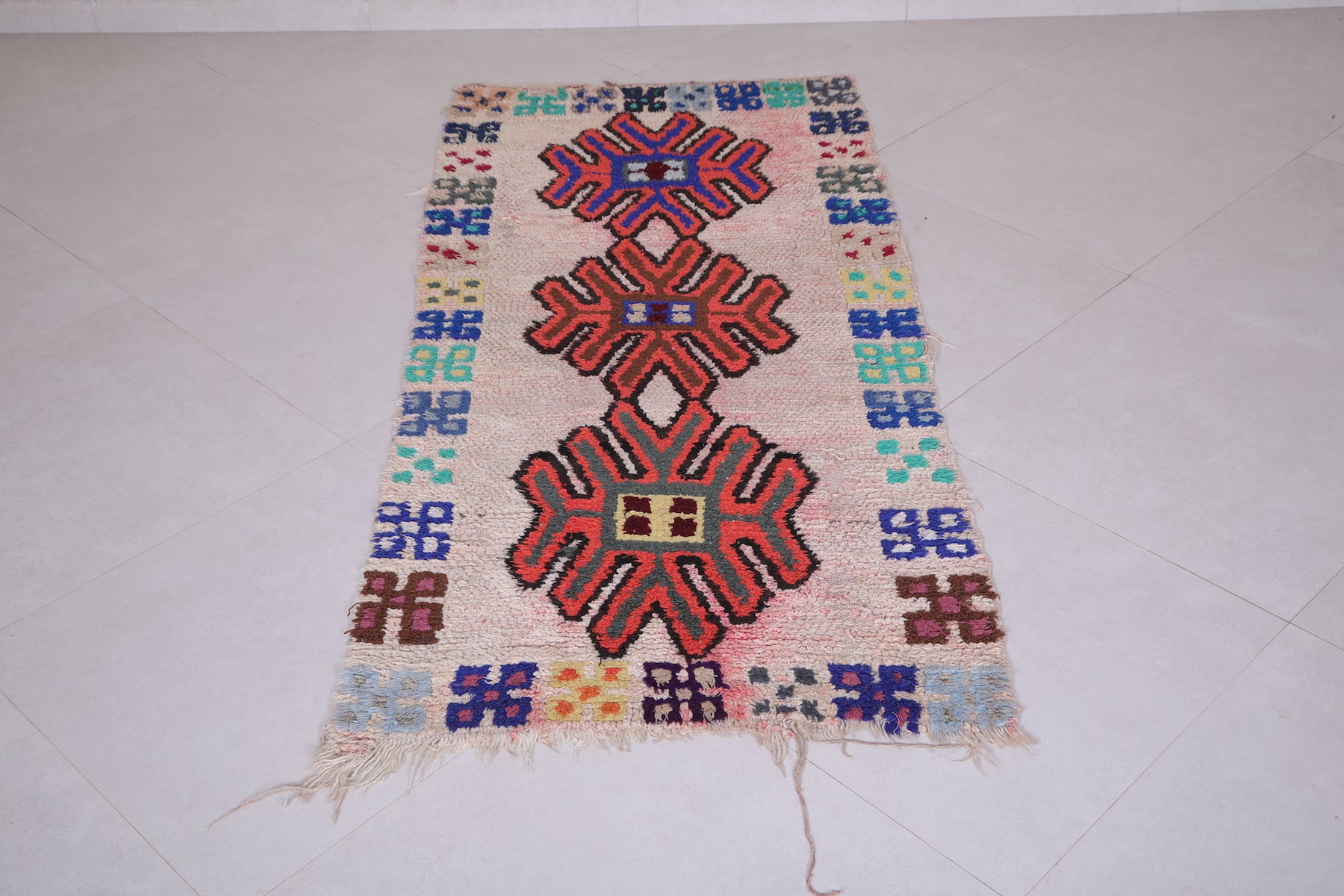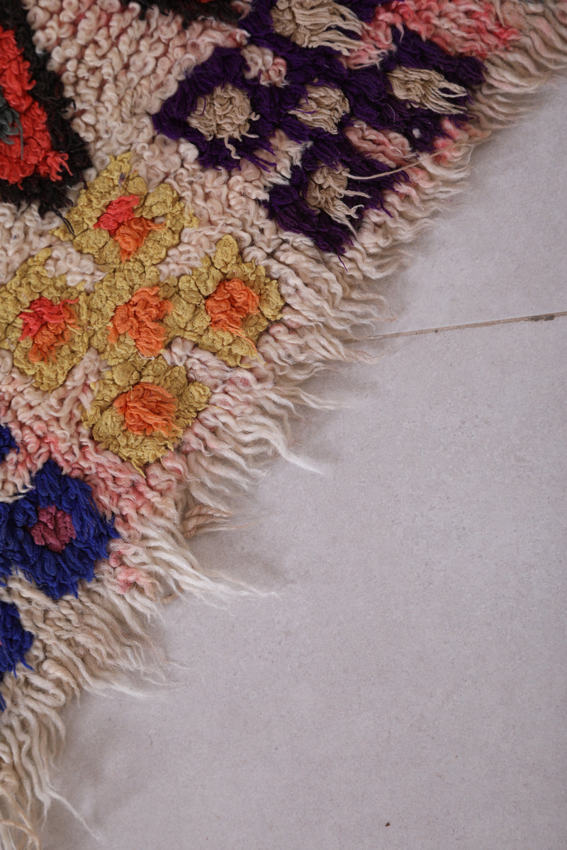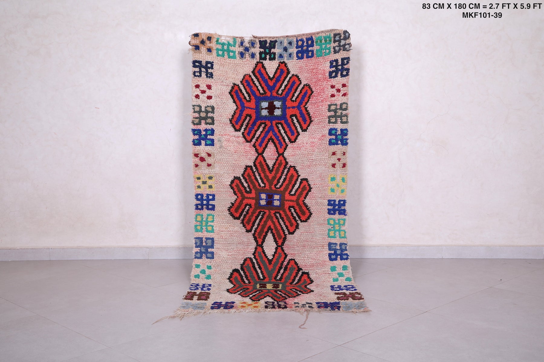 Energize your space with this Colorful Moroccan Berber Runner Rug (2.7 x 5.9 FT), featuring bold tribal motifs in rich reds, blues, purples, and greens set against a creamy background.