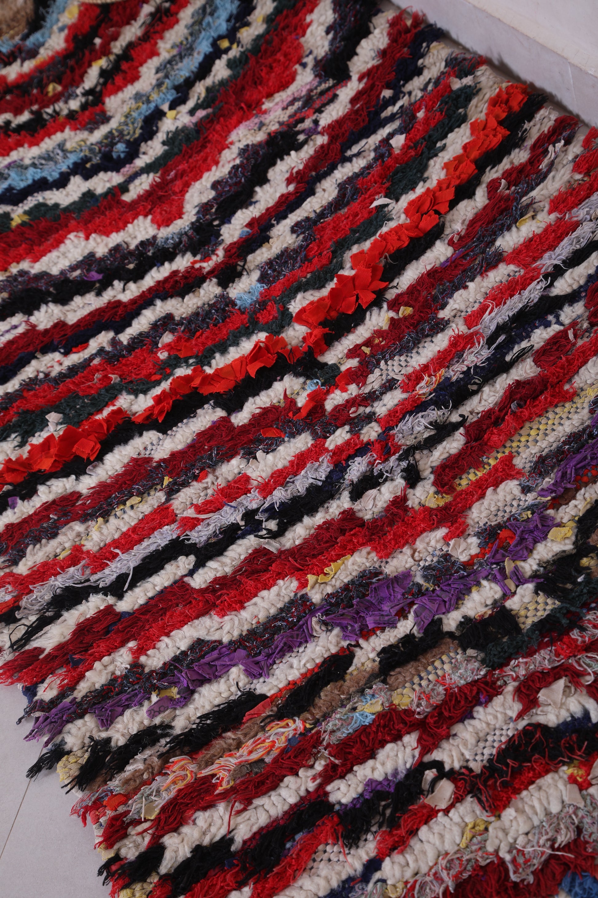 Add a vibrant, handcrafted touch to your home with this Colorful Moroccan Hallway Rug, sized at 2.5 x 5.4 feet. Handwoven in Morocco, this bold runner features dynamic V-shaped chevron stripes in a palette of red, black, cream, blue, and purple. The shaggy texture brings warmth and softness, making it a cozy yet artistic addition to any hallway, entry, or creative space. Its rhythmic pattern and rich color story make it a standout piece full of Moroccan soul.