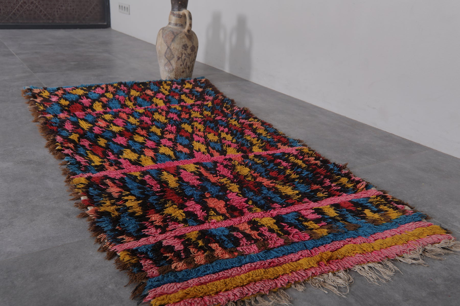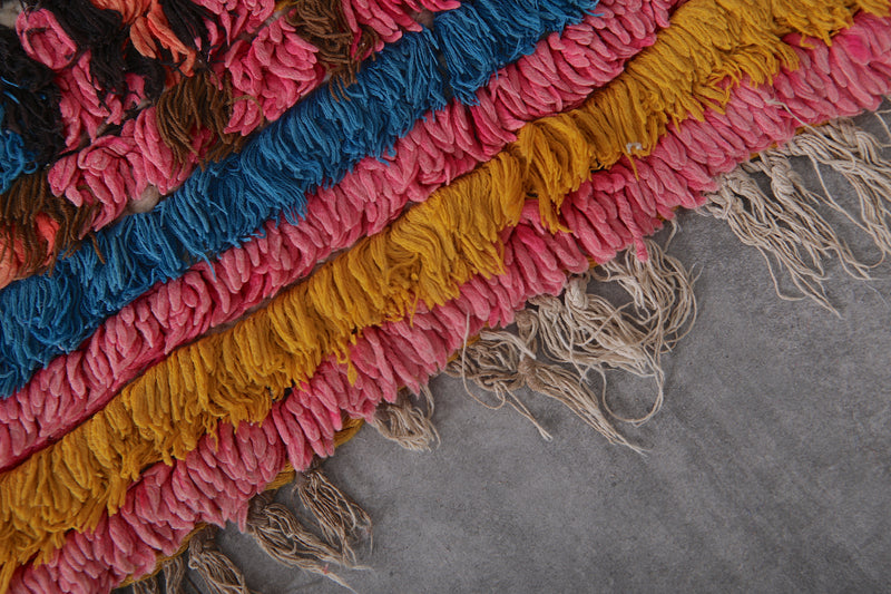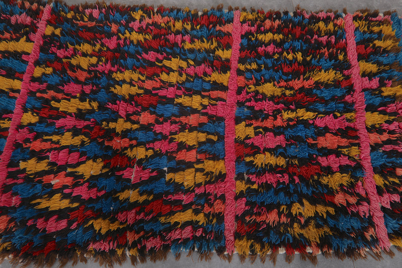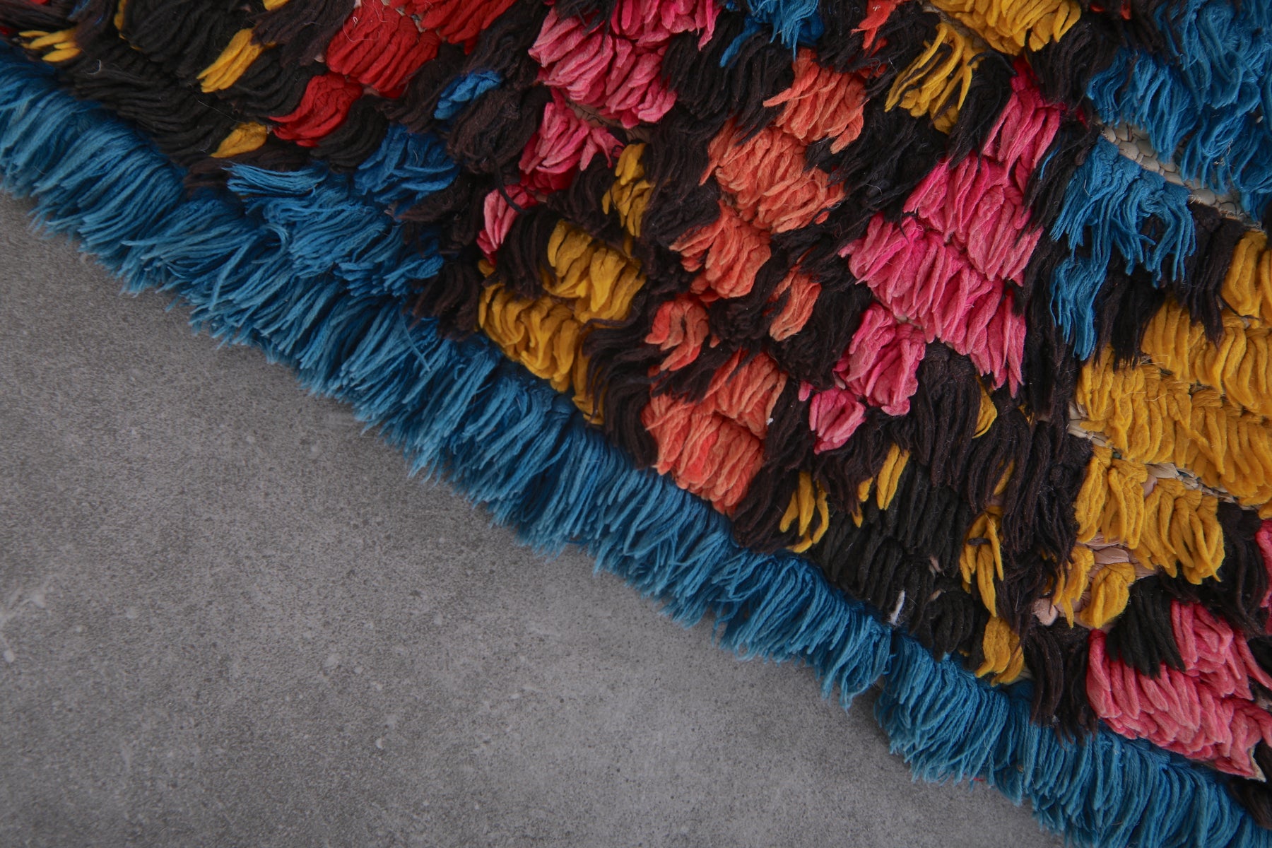 Bring bold character to your entryway with this colorful Moroccan hallway rug, handwoven from Berber wool and recycled textiles. Measuring 2.6 x 5.7 FT, its vivid geometric design in pink, blue, yellow, and black adds energy and texture to hallways, boho corners, or eclectic interiors.