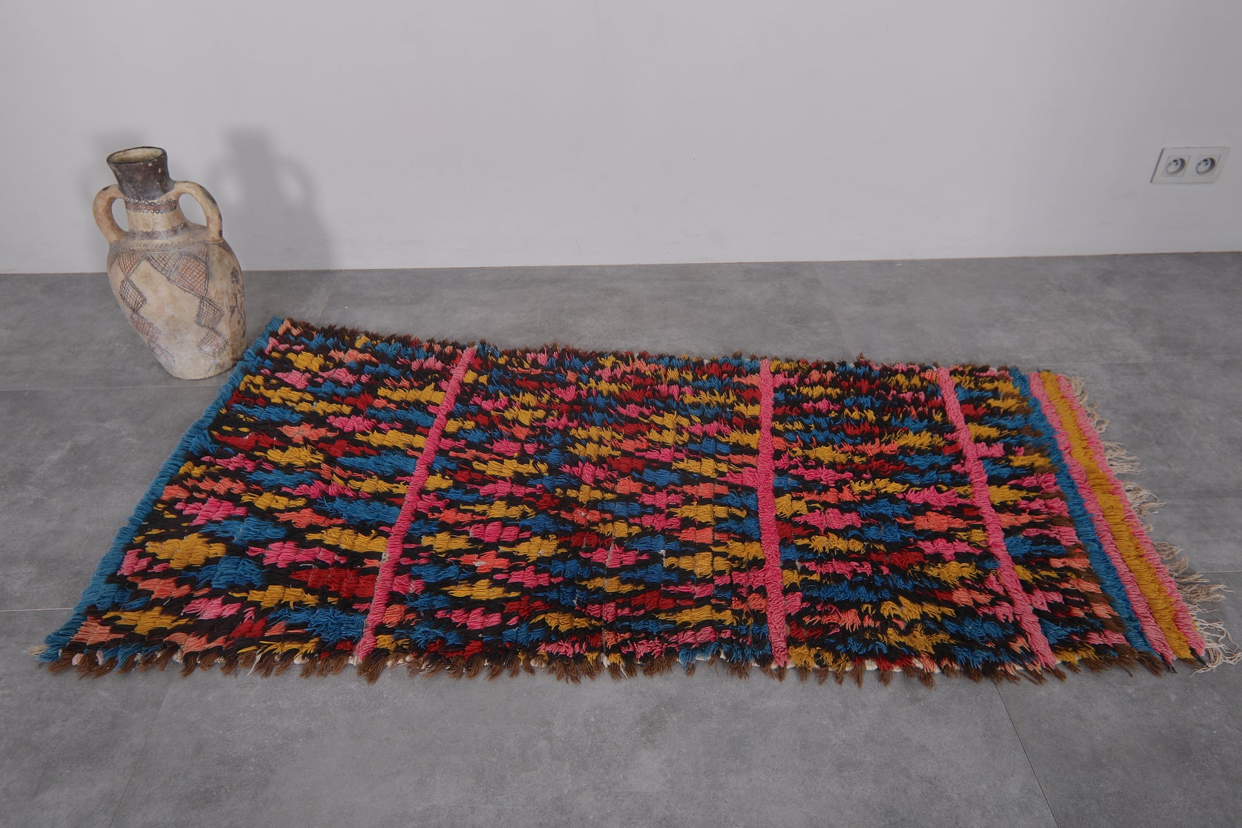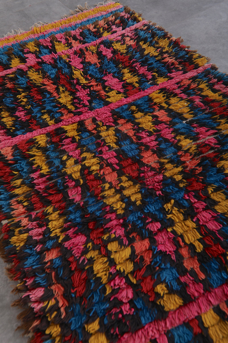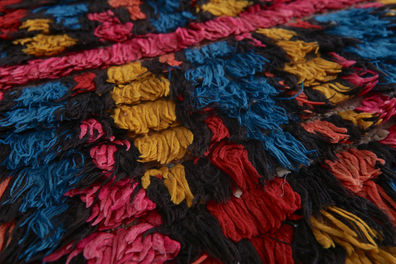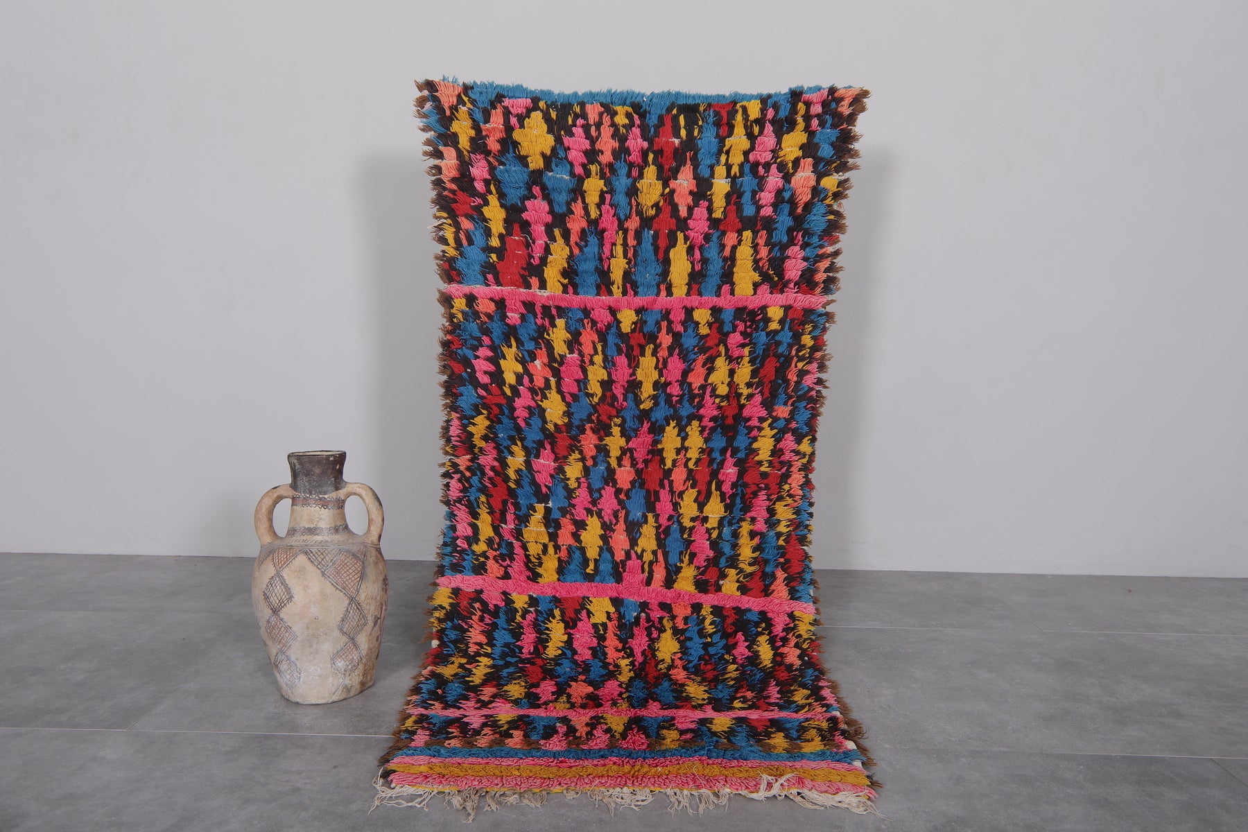 Bring bold character to your entryway with this colorful Moroccan hallway rug, handwoven from Berber wool and recycled textiles. Measuring 2.6 x 5.7 FT, its vivid geometric design in pink, blue, yellow, and black adds energy and texture to hallways, boho corners, or eclectic interiors.