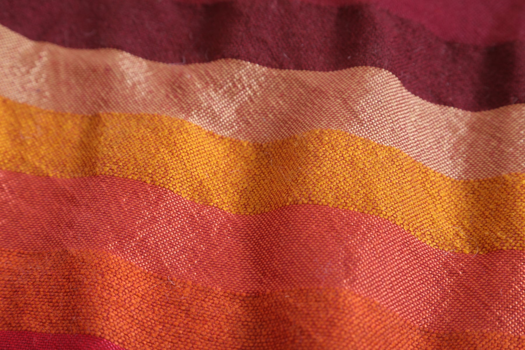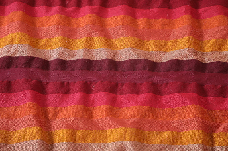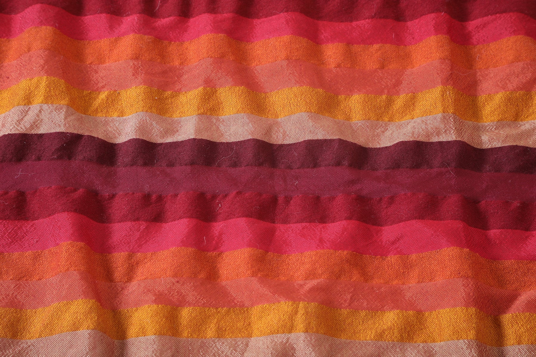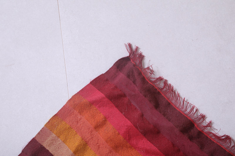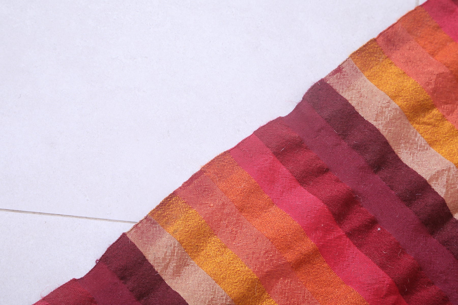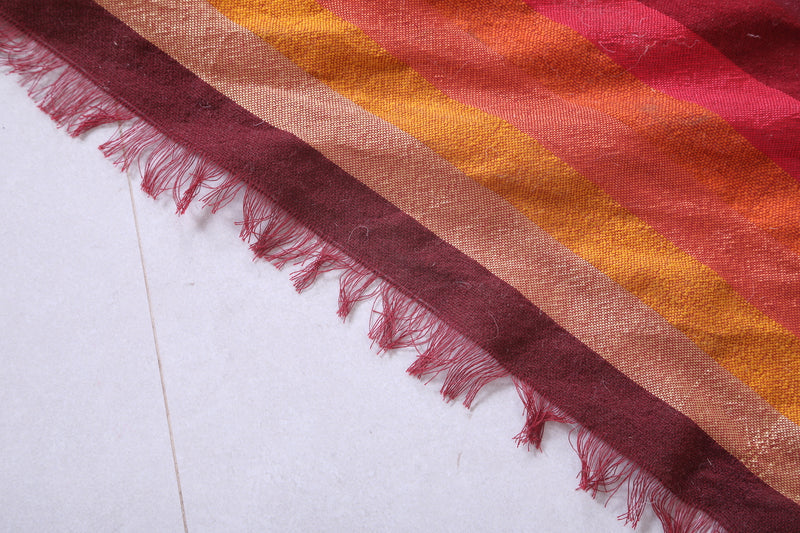 This 5.6 x 9.4 feet Colorful Moroccan Handwoven Fabric radiates warmth and vibrancy with its rich red, orange, and yellow striped patterns. A stunning example of traditional Moroccan artistry, this textile brings a touch of cultural elegance to any space, making it perfect as a throw, curtain, or decorative wall hanging.