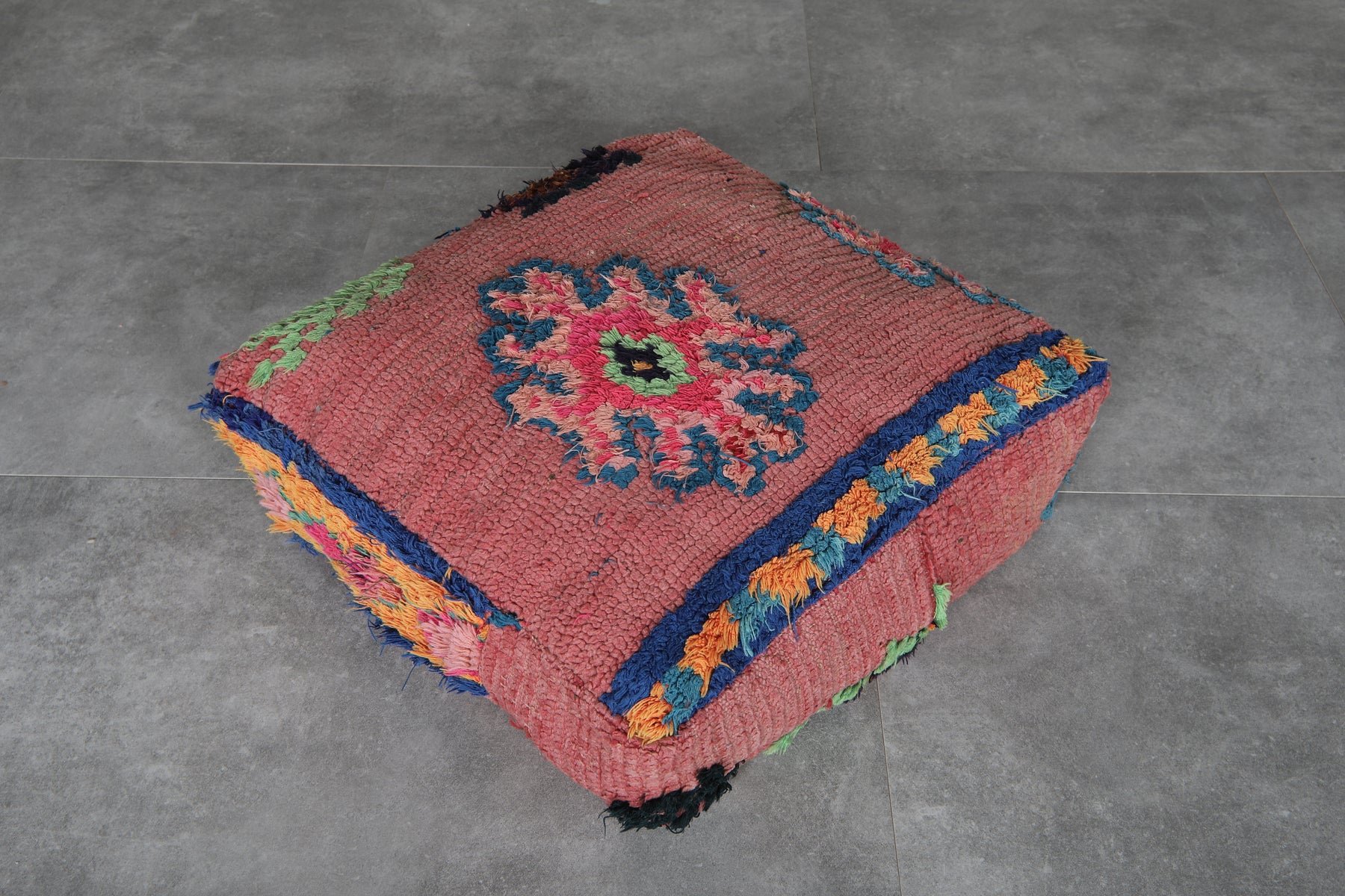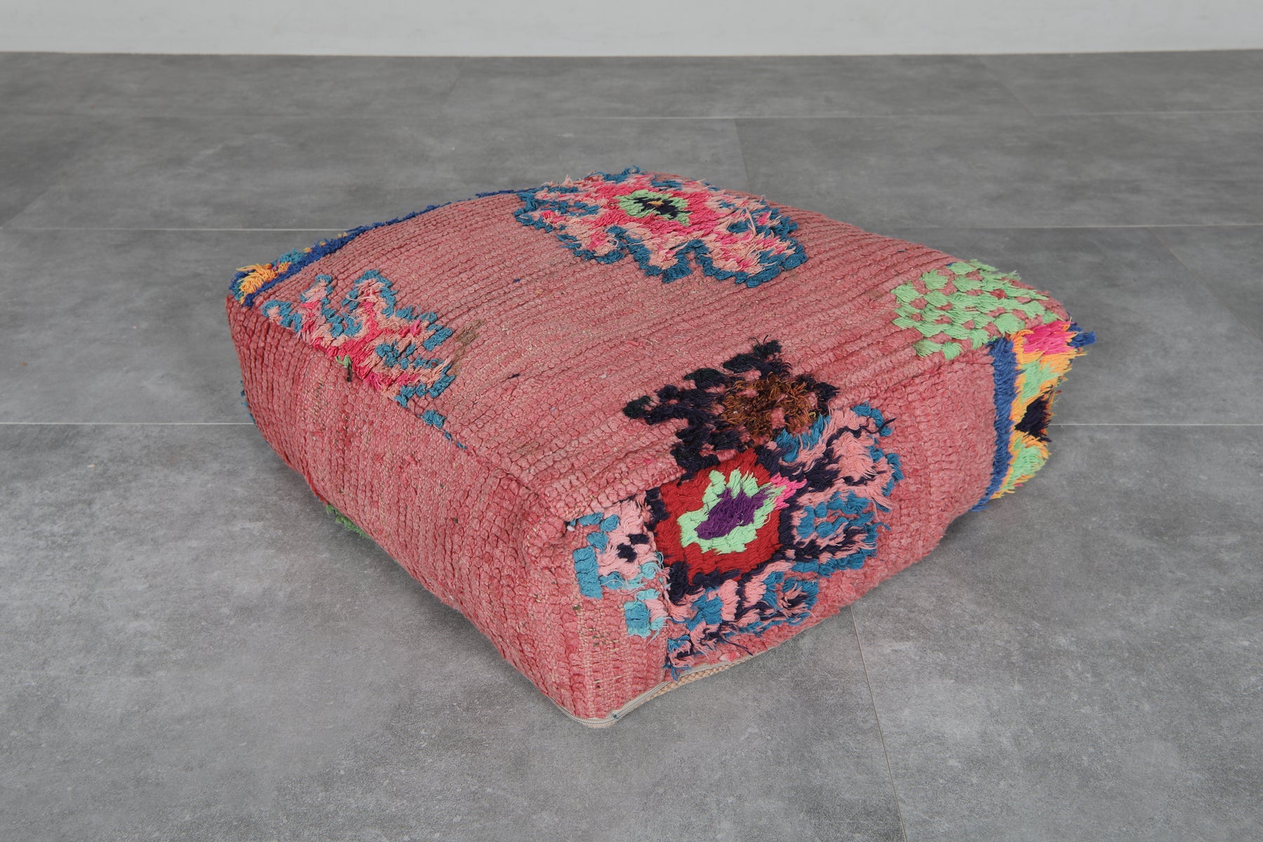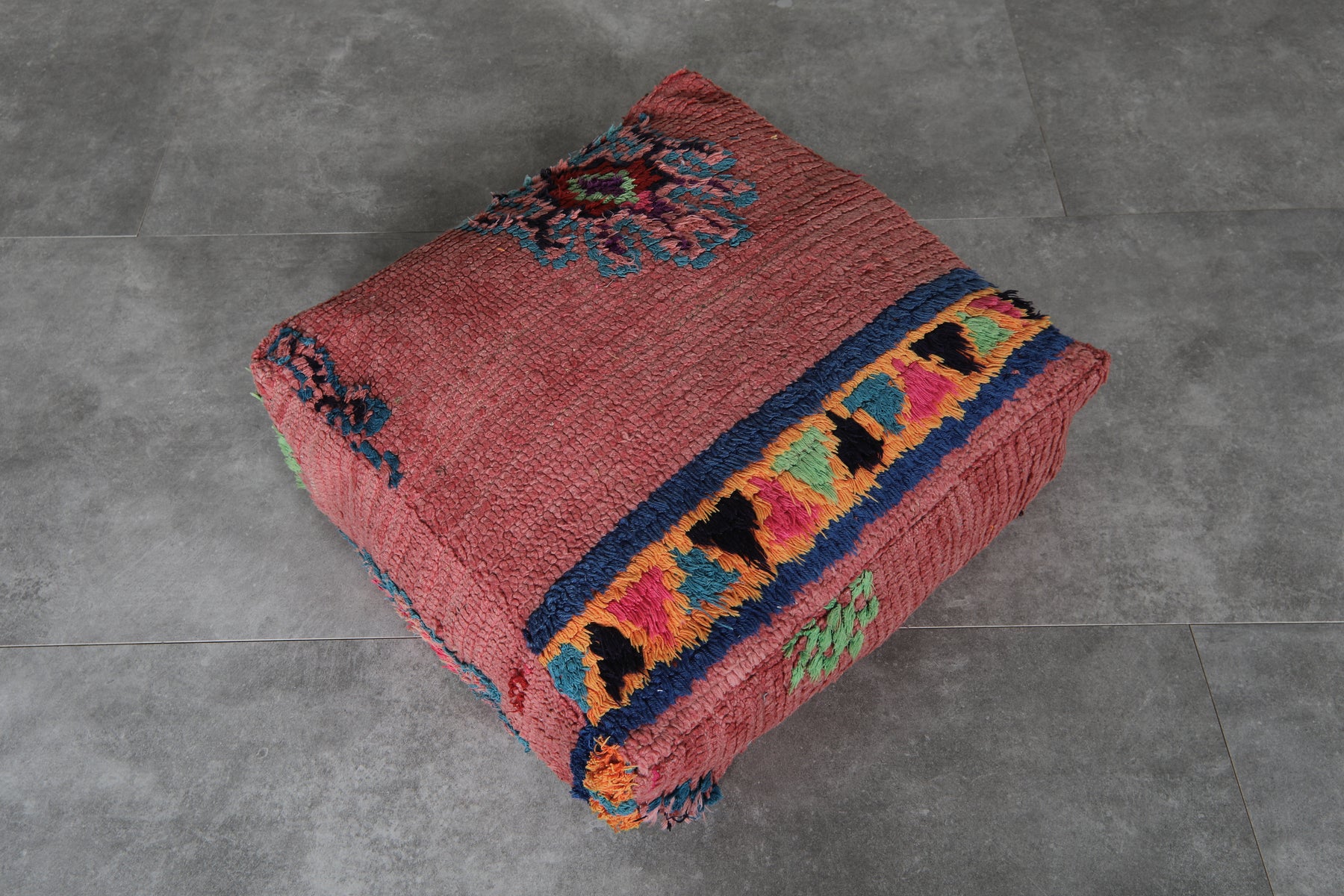 Add a burst of vibrant energy to your home with this set of pink Moroccan poufs, featuring bold floral and tribal patterns. Each 24x24” pouf is crafted from repurposed vintage wool rugs, making them perfect as boho seating, footrests, or decorative accents.