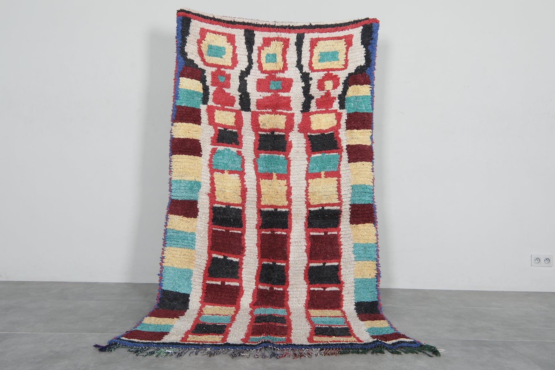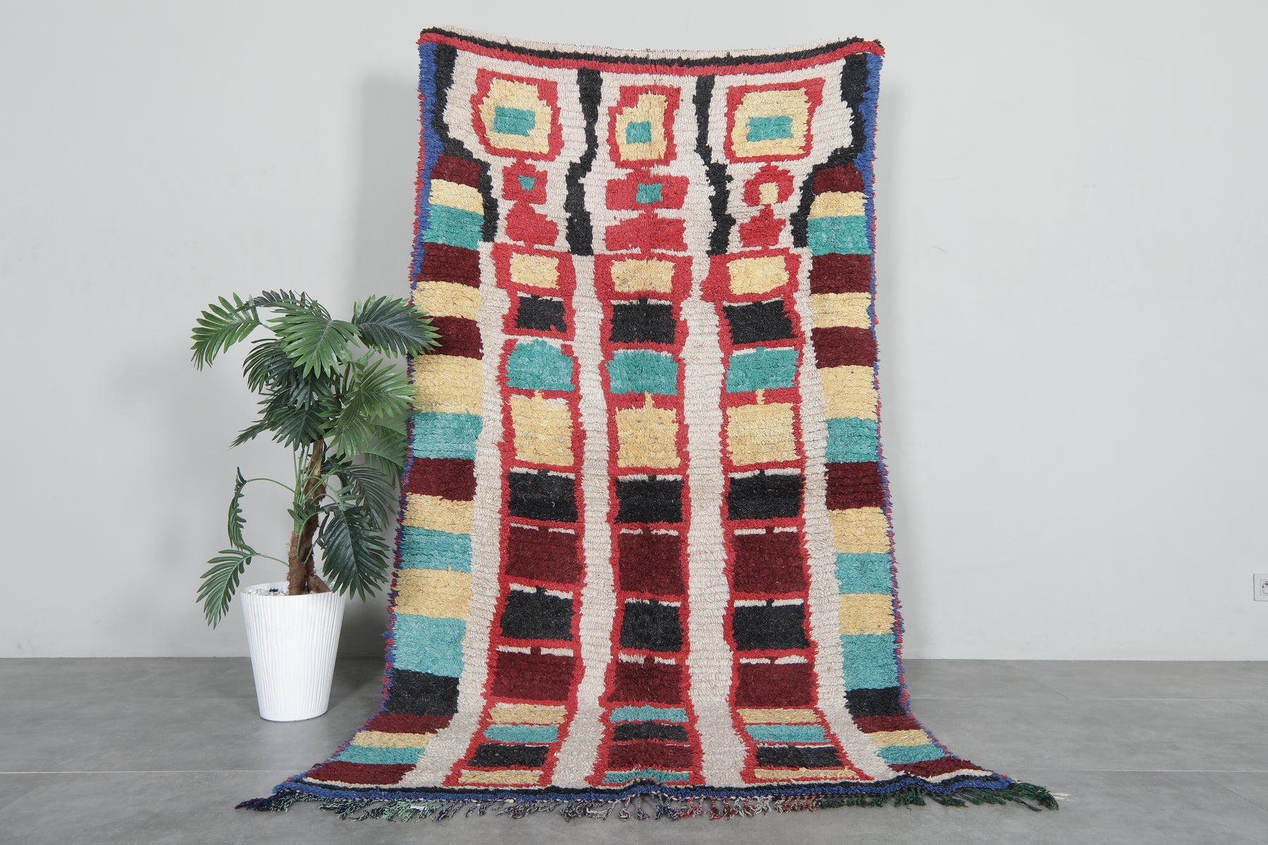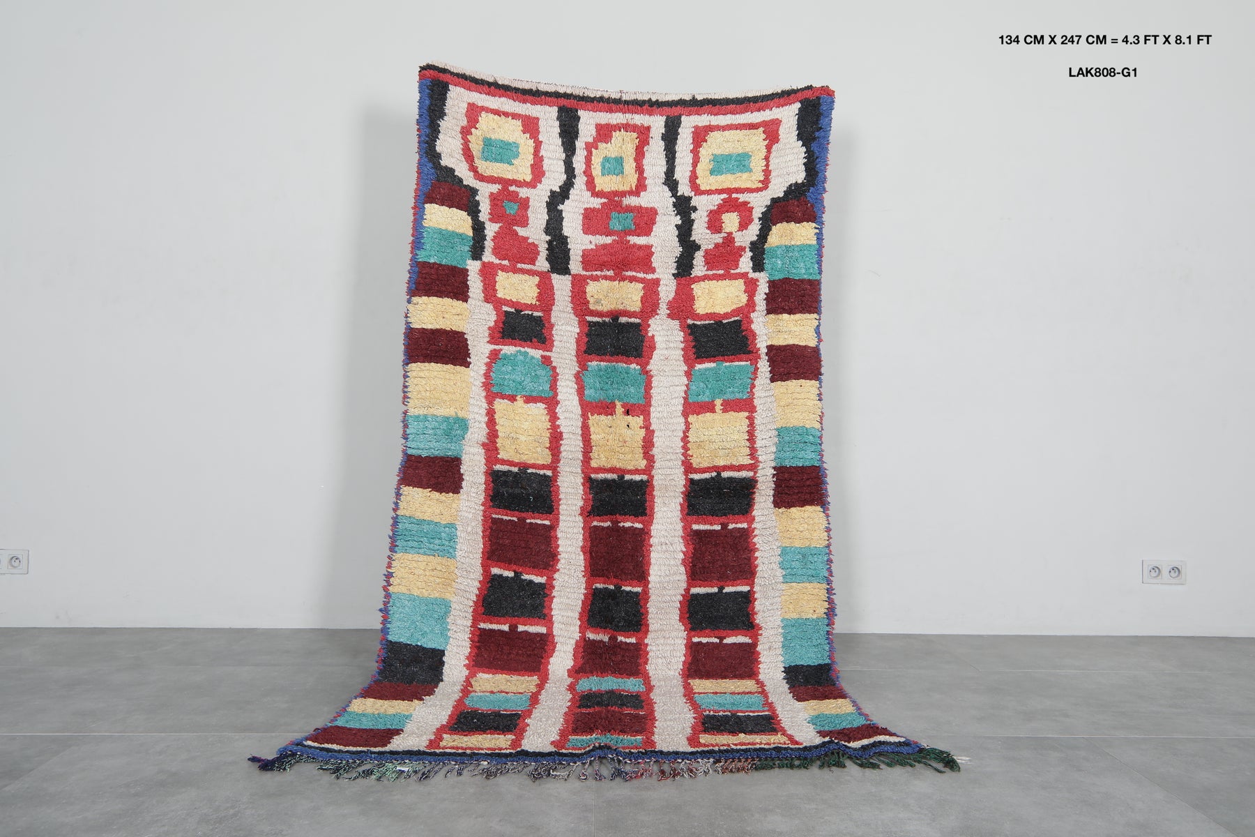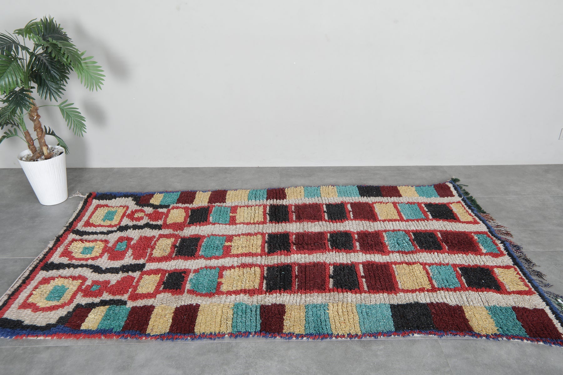 Add vibrancy and style to your space with our Colorful Moroccan Rug. Handcrafted from soft wool, this Azilal rug boasts a minimalist design and vibrant colors, making it the perfect addition to any boho decor. Available in a versatile size of 4.3 x 8.1 feet, this rug is both functional and beautiful.
