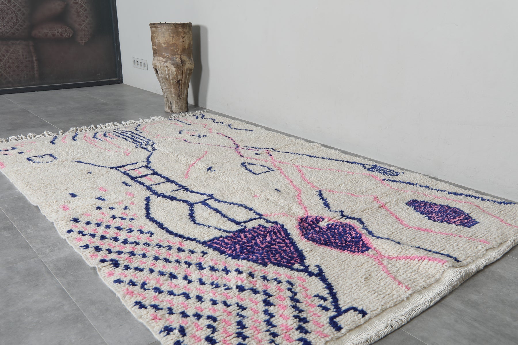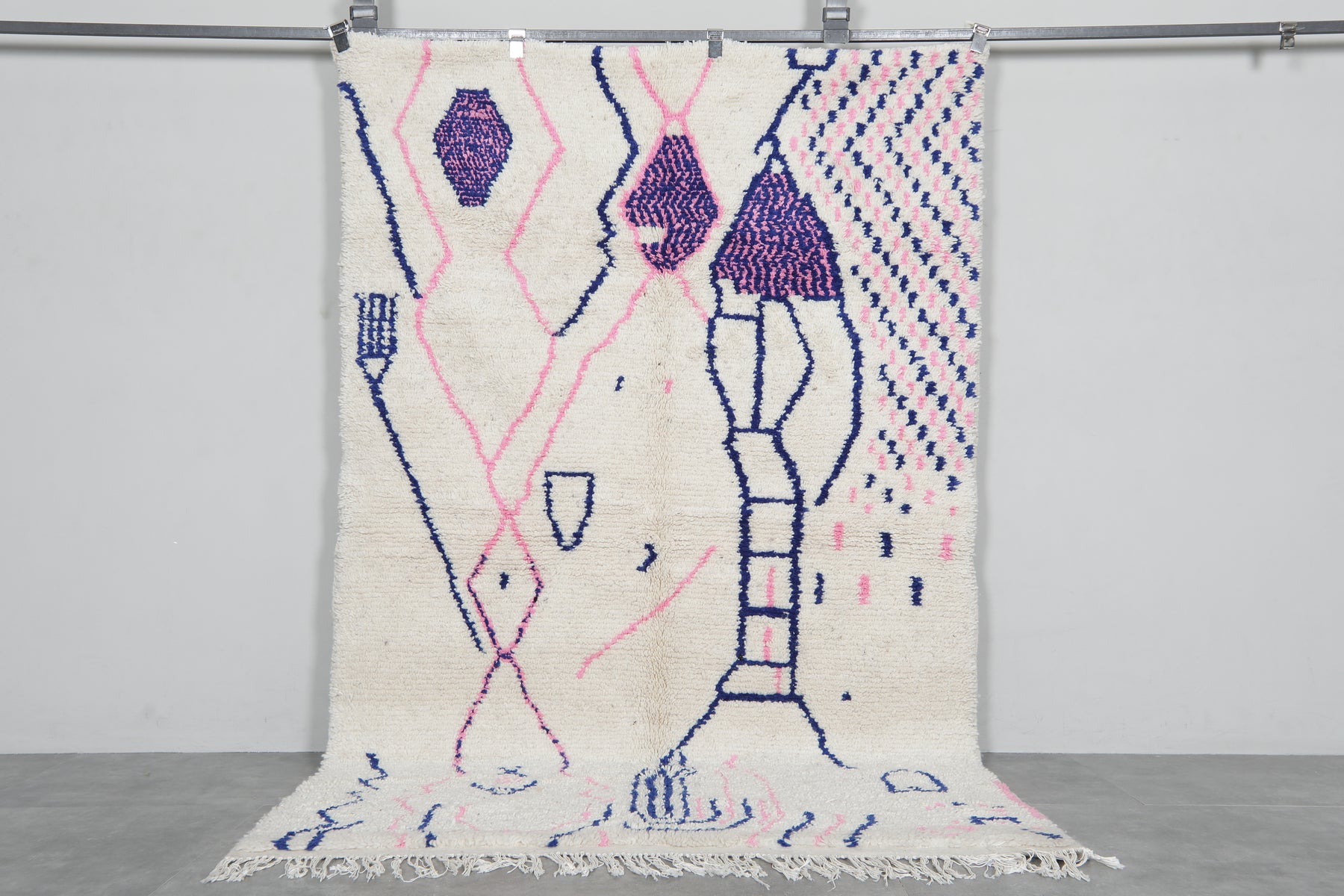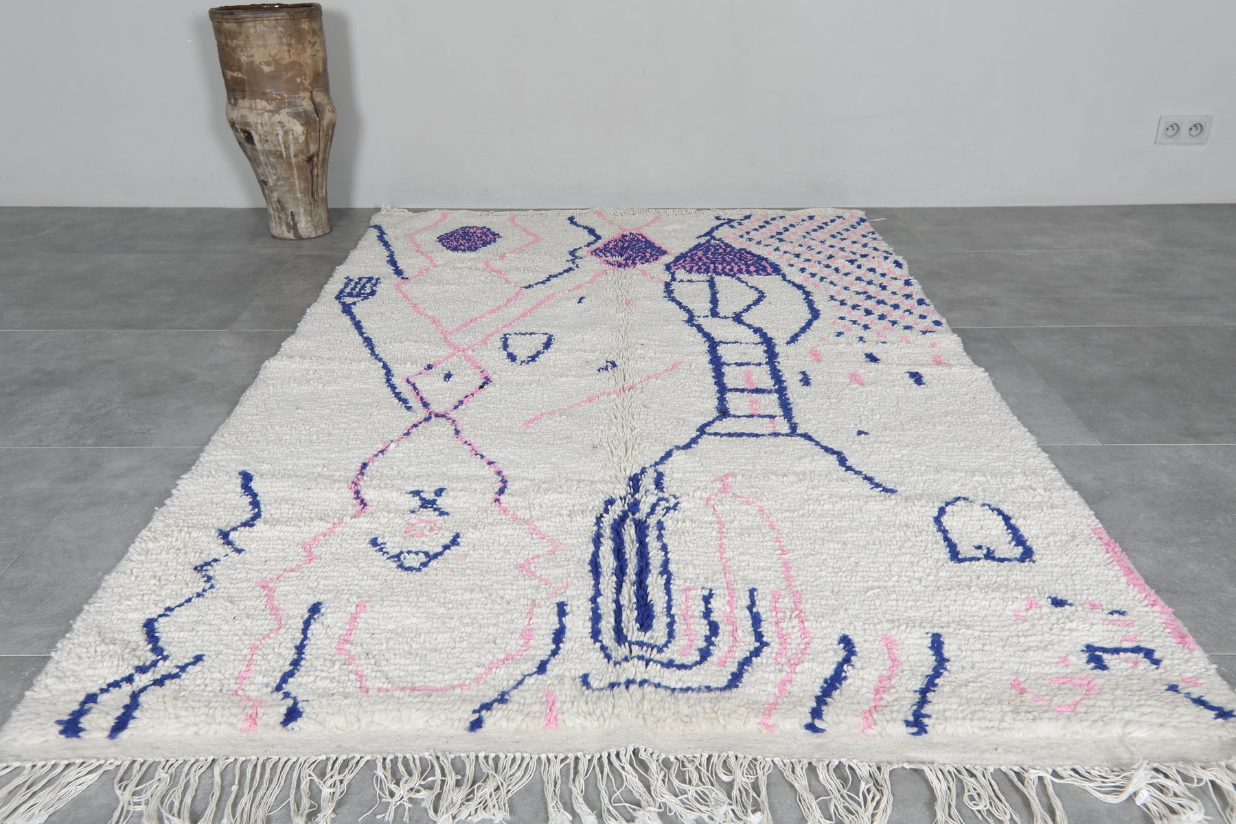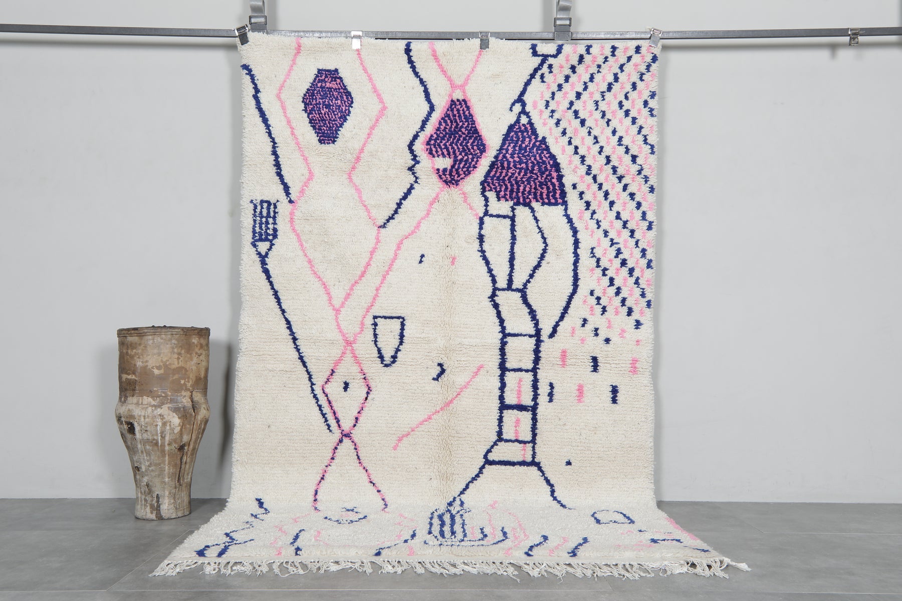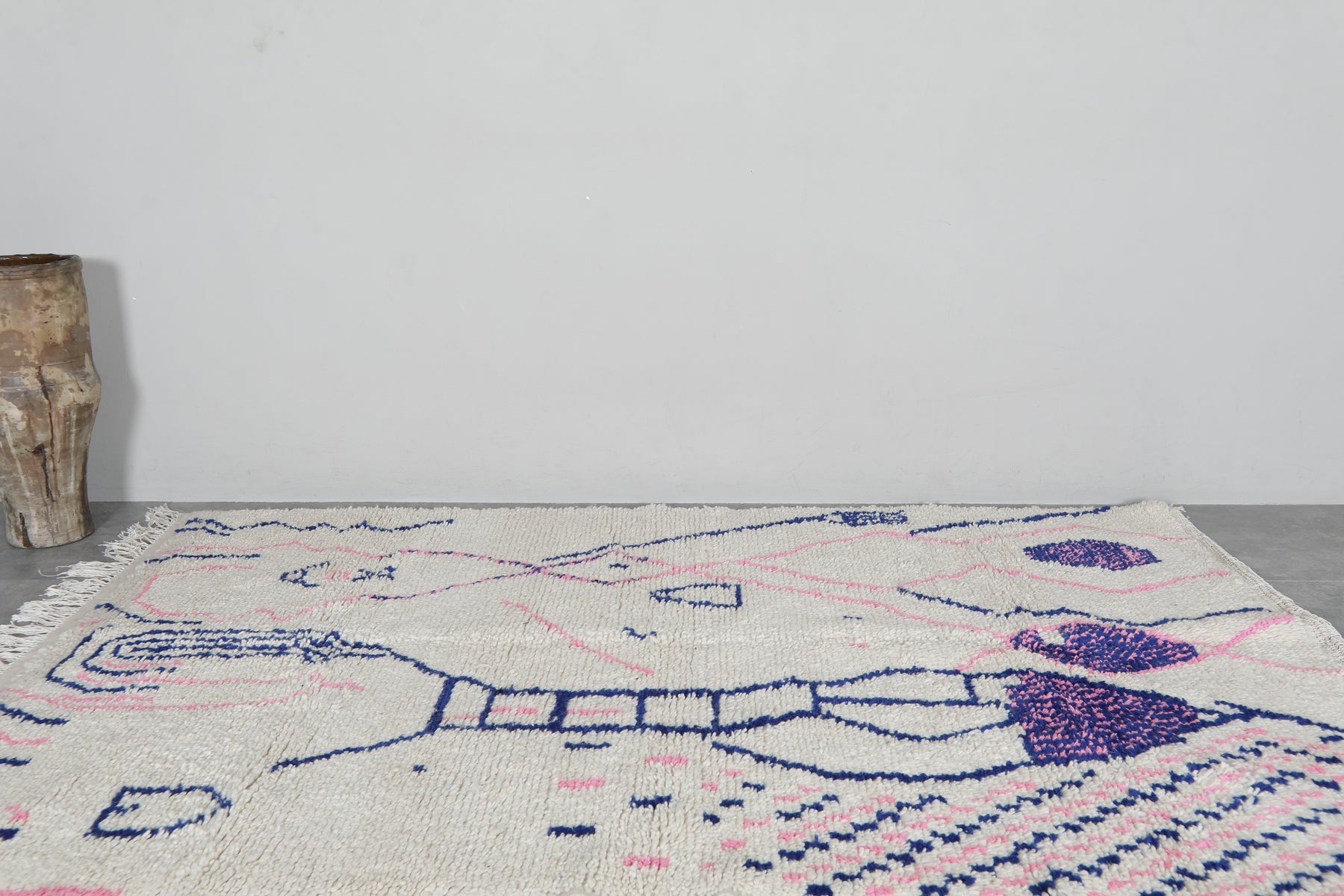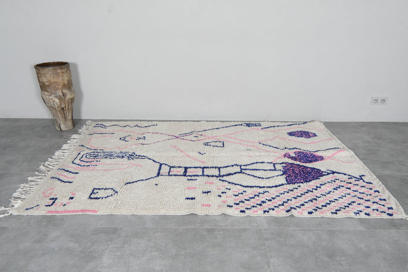 Infuse your home with artistic charm using this Colorful Moroccan rug, measuring 4.9 FT x 7.9 FT. Handwoven with precision by skilled artisans, this unique piece features abstract geometric patterns in bold hues of blue and purple against a soft, neutral background. Its high-quality wool construction ensures durability while adding warmth and character to any space.