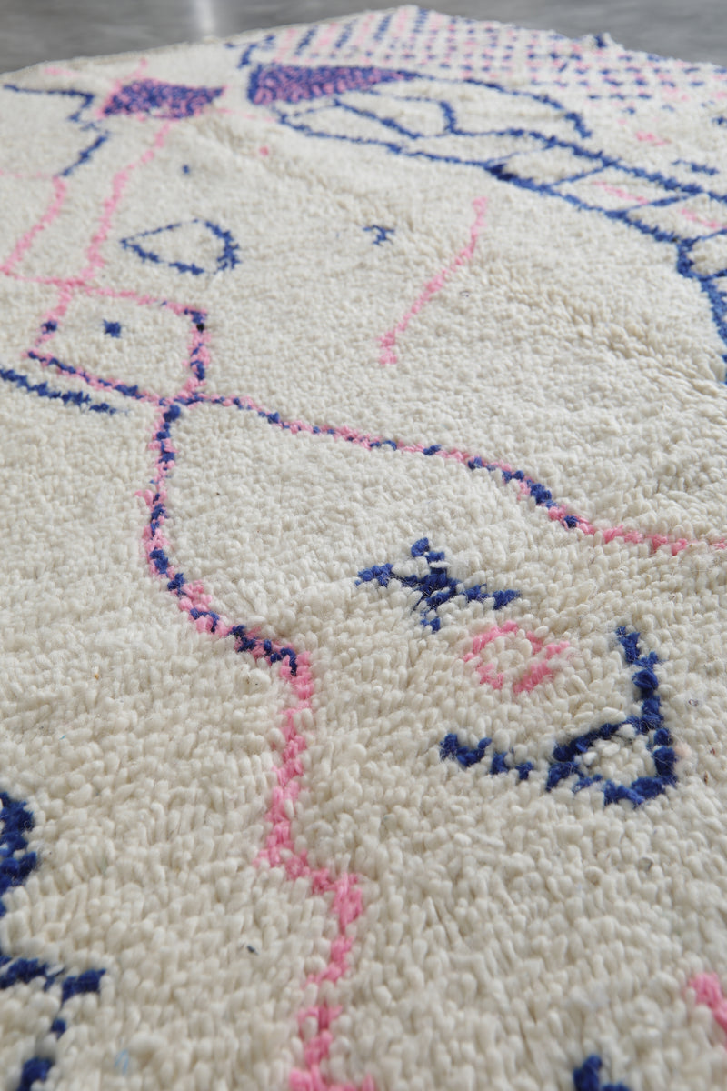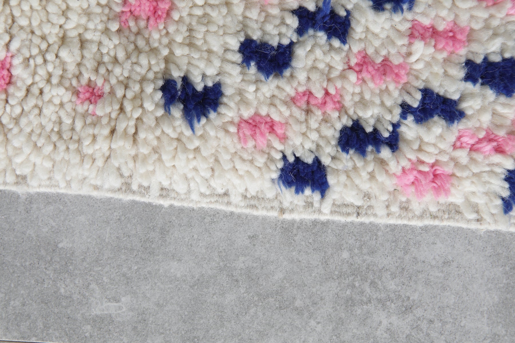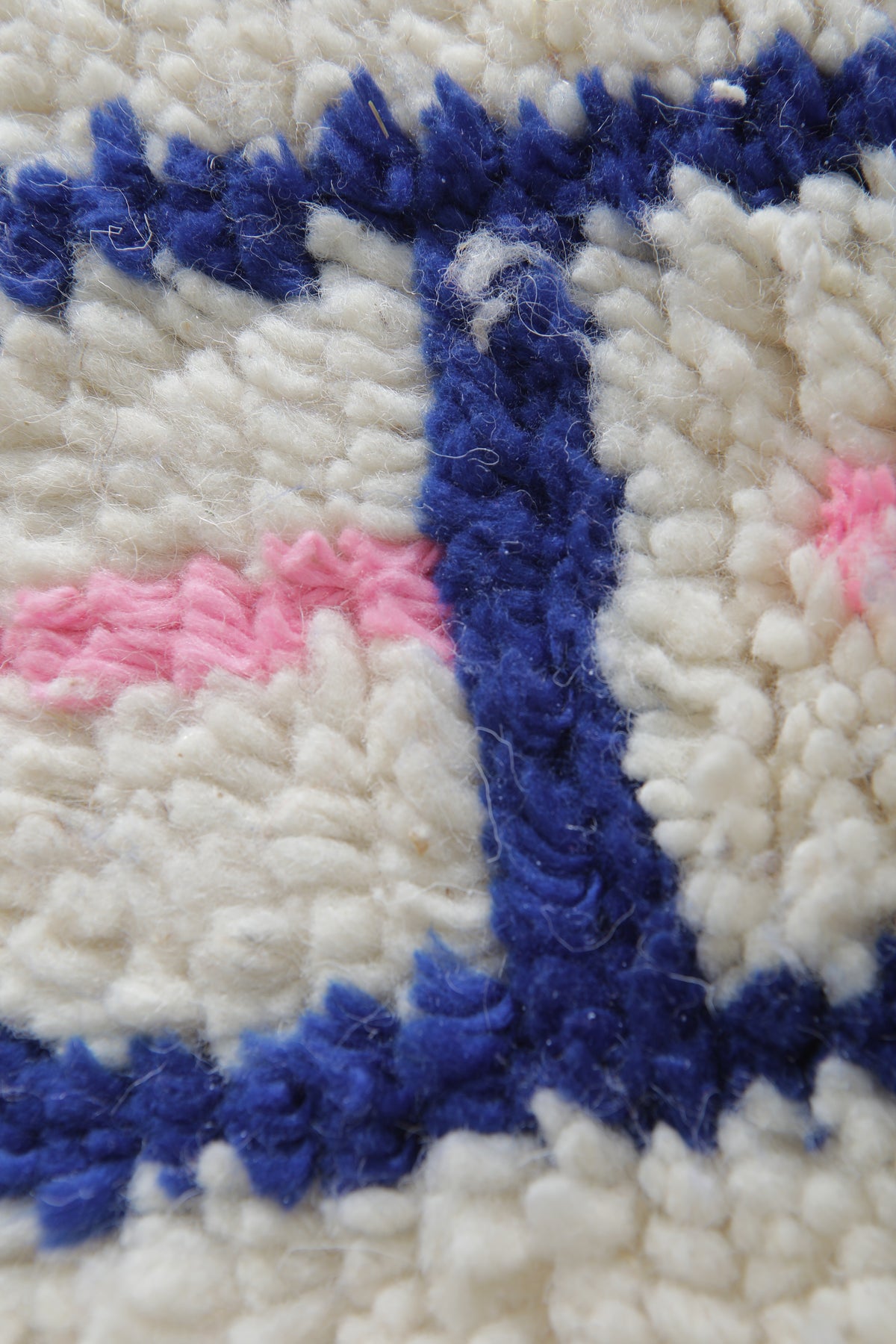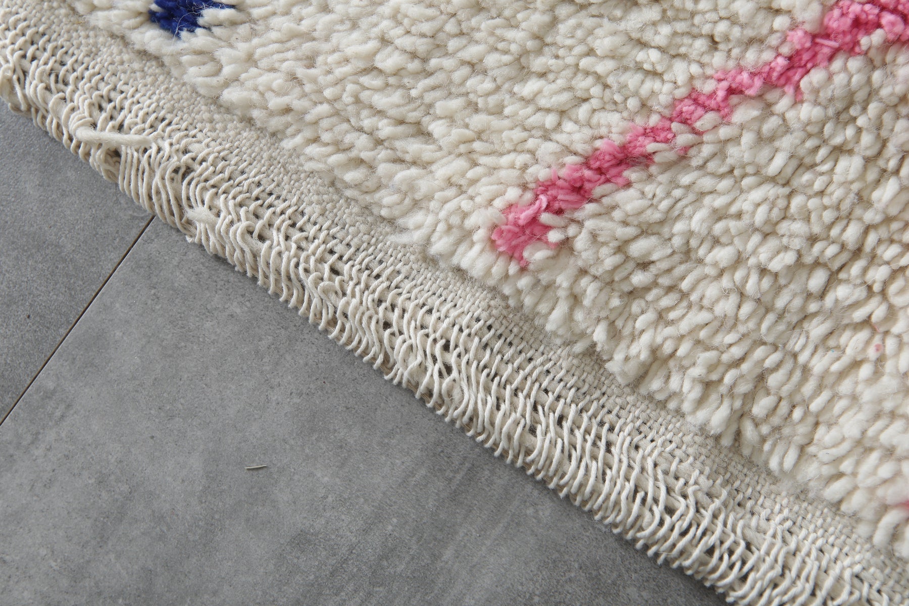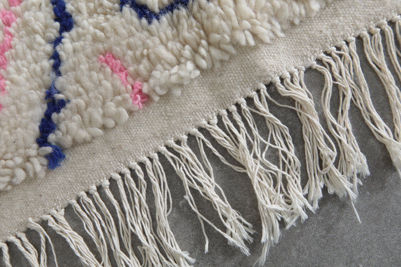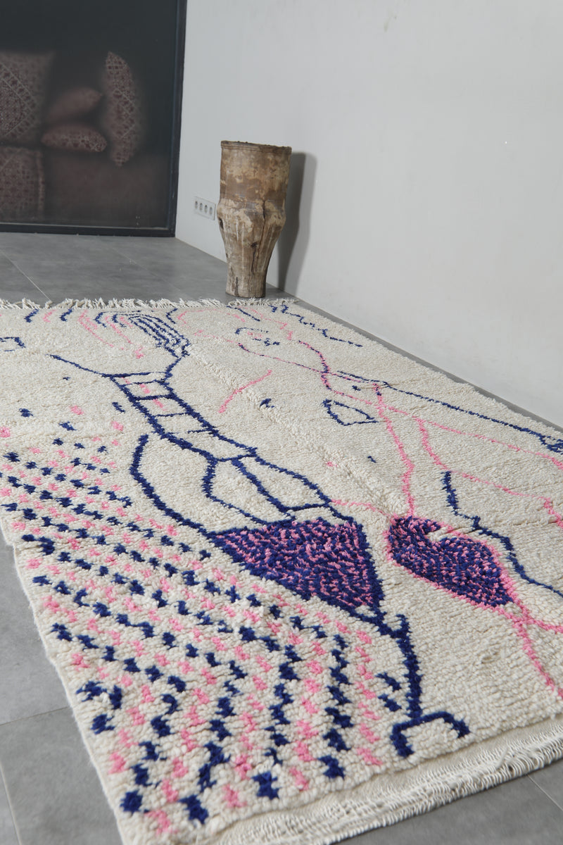 Infuse your home with artistic charm using this Colorful Moroccan rug, measuring 4.9 FT x 7.9 FT. Handwoven with precision by skilled artisans, this unique piece features abstract geometric patterns in bold hues of blue and purple against a soft, neutral background. Its high-quality wool construction ensures durability while adding warmth and character to any space.