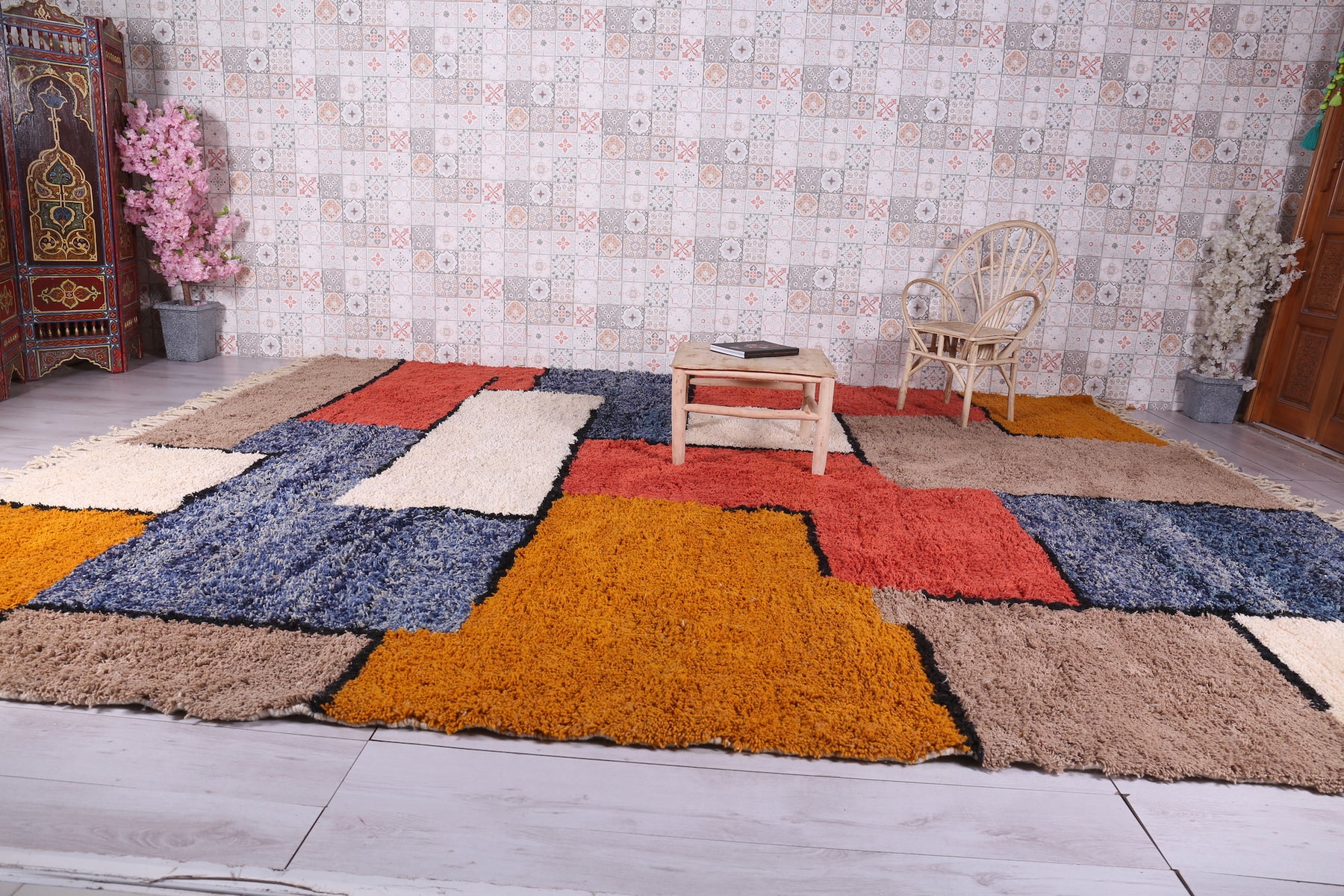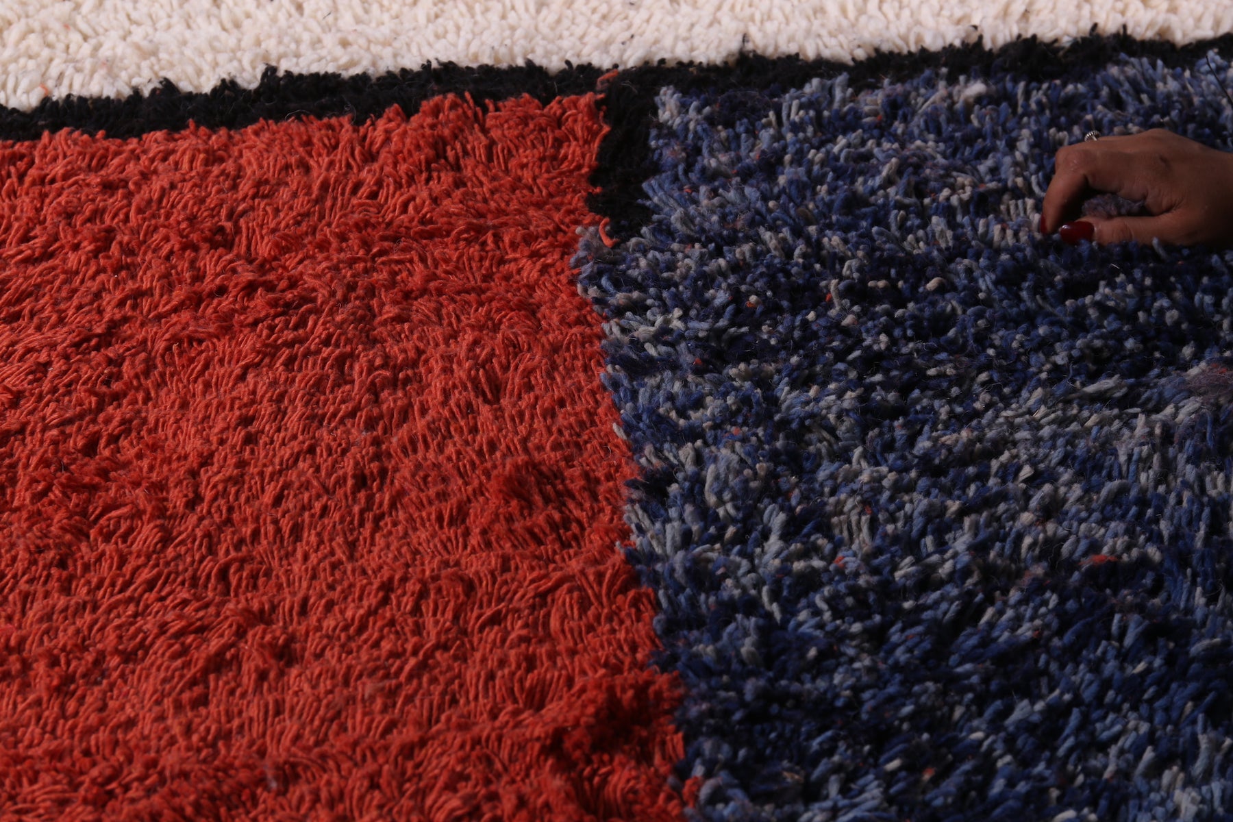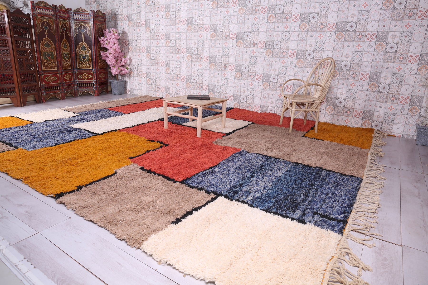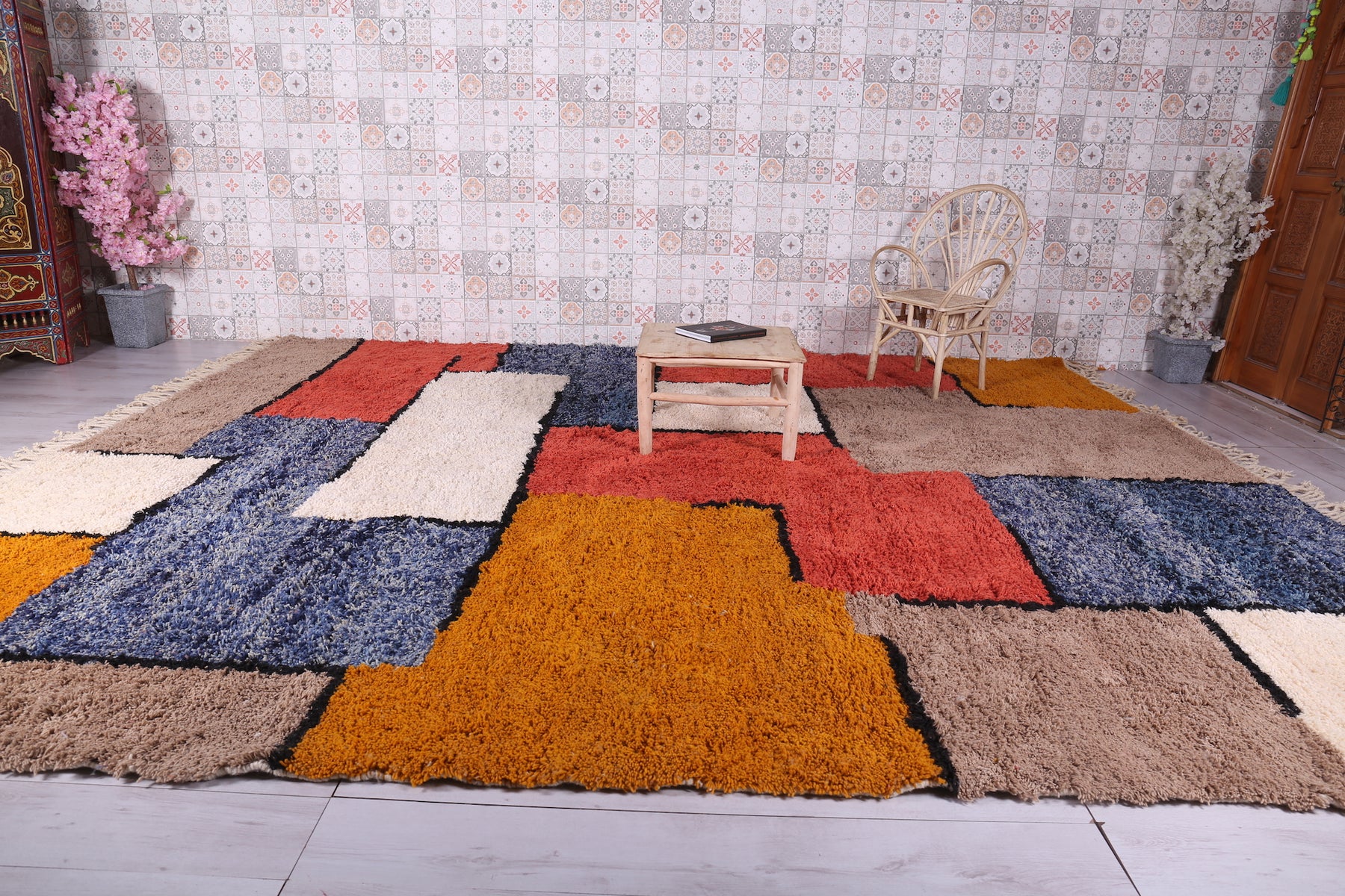 Make a bold statement in your home with this stunning, handwoven Moroccan rug, designed for those who love vibrant, artistic décor. The patchwork of earthy tones, deep blues, warm reds, and creamy whites creates a modern yet timeless look, perfect for any space that needs a touch of character and coziness.