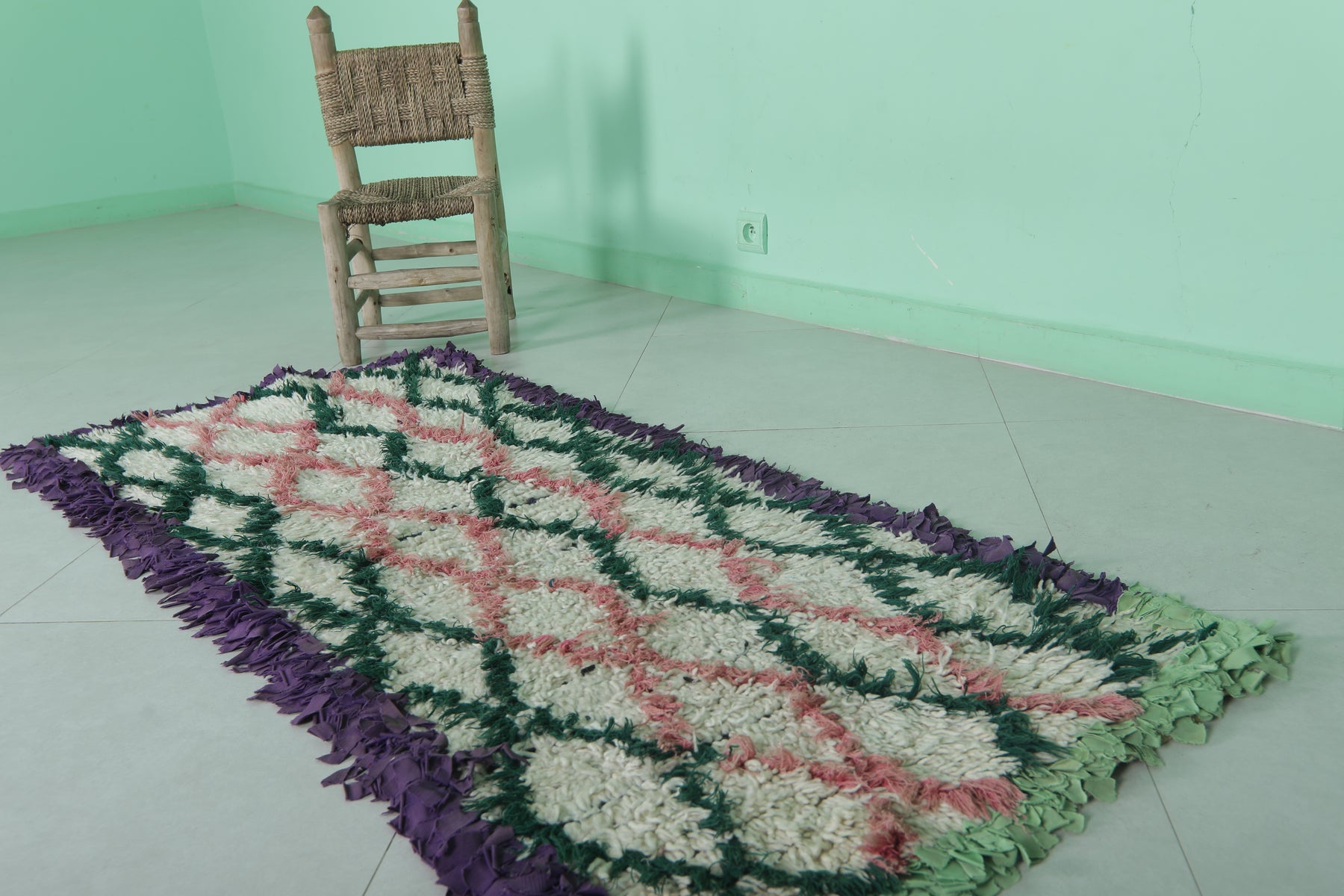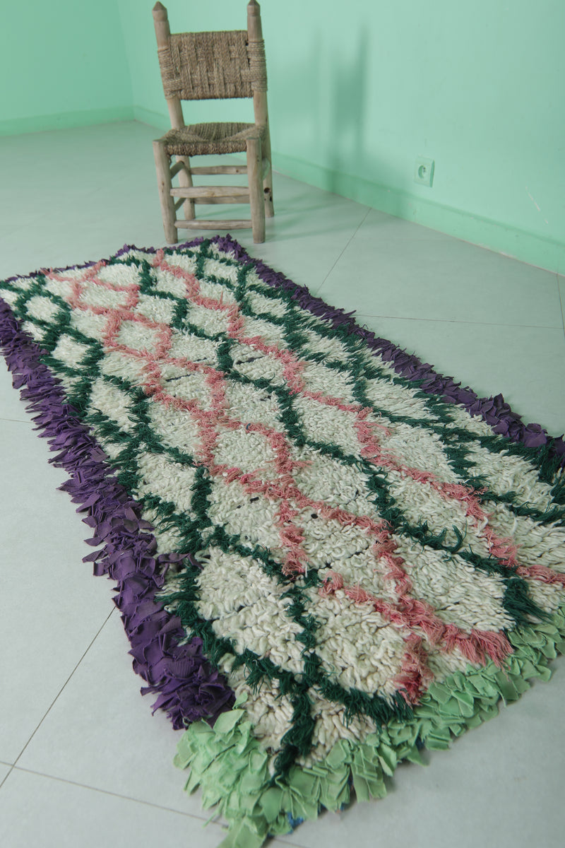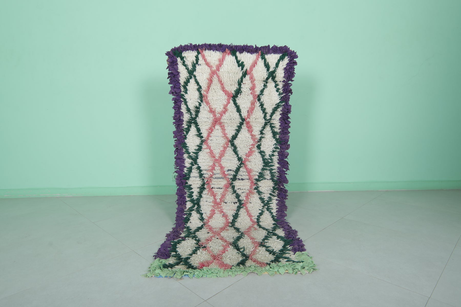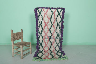 Liven up your space with this Colorful Moroccan Rug Runner (2.3 x 5.6 FT), featuring vibrant diamond latticework in pink and green framed by a bold purple border.