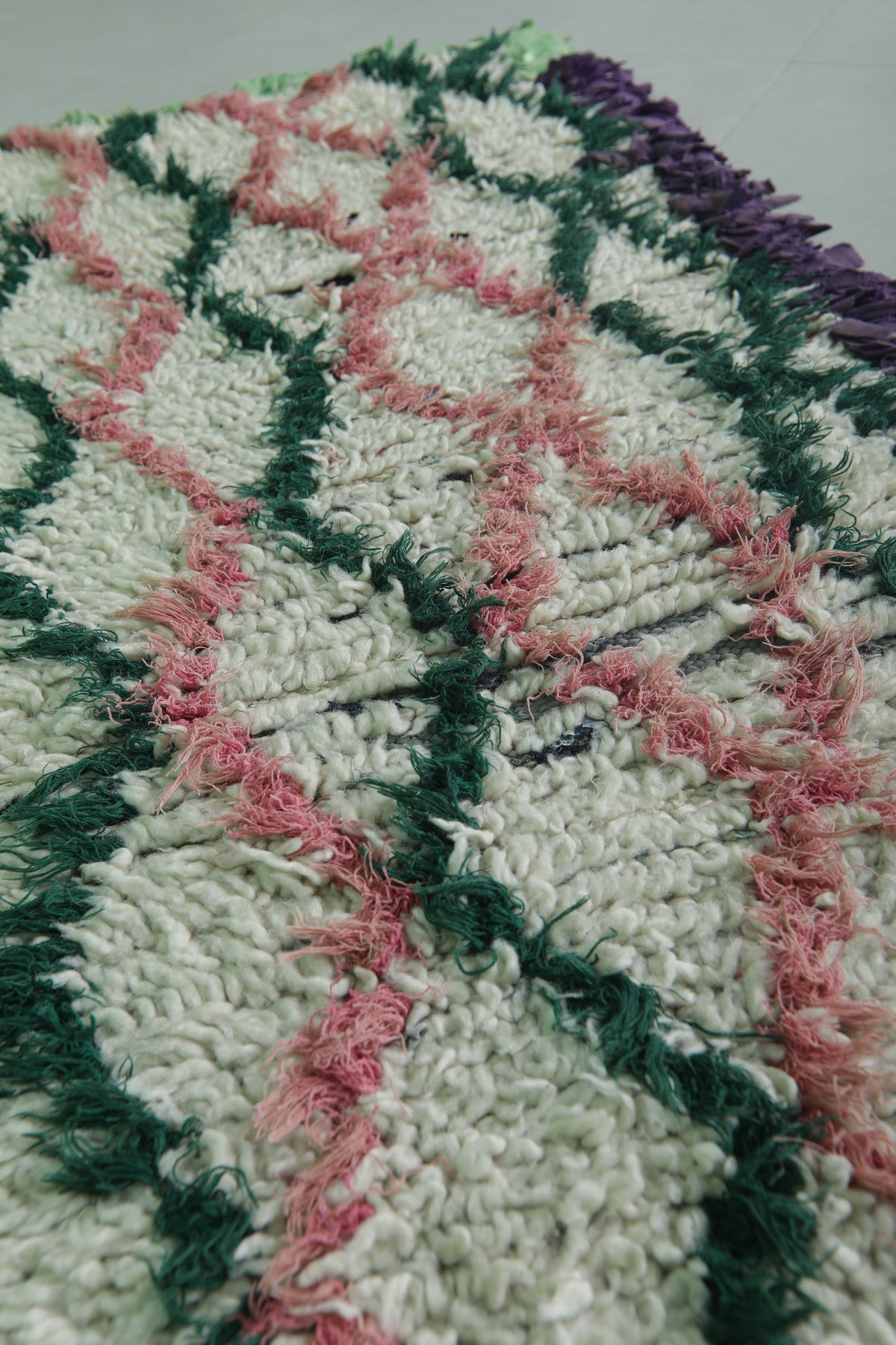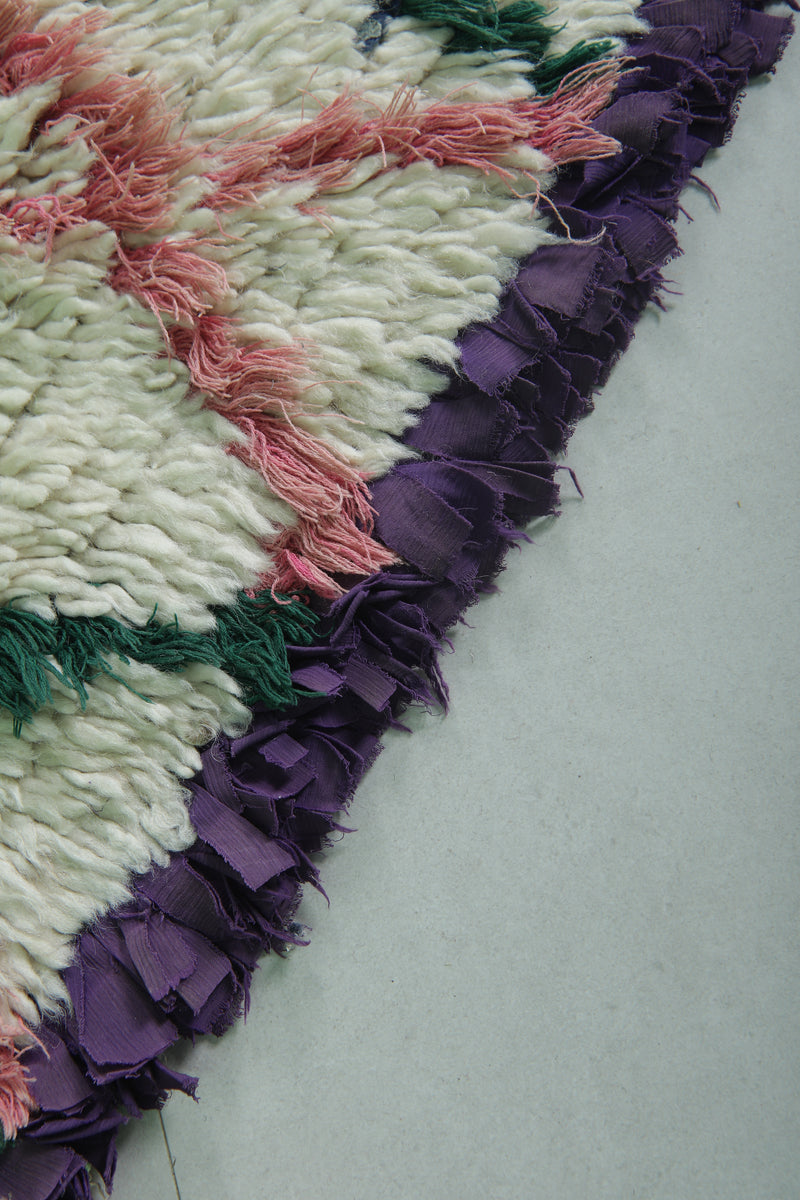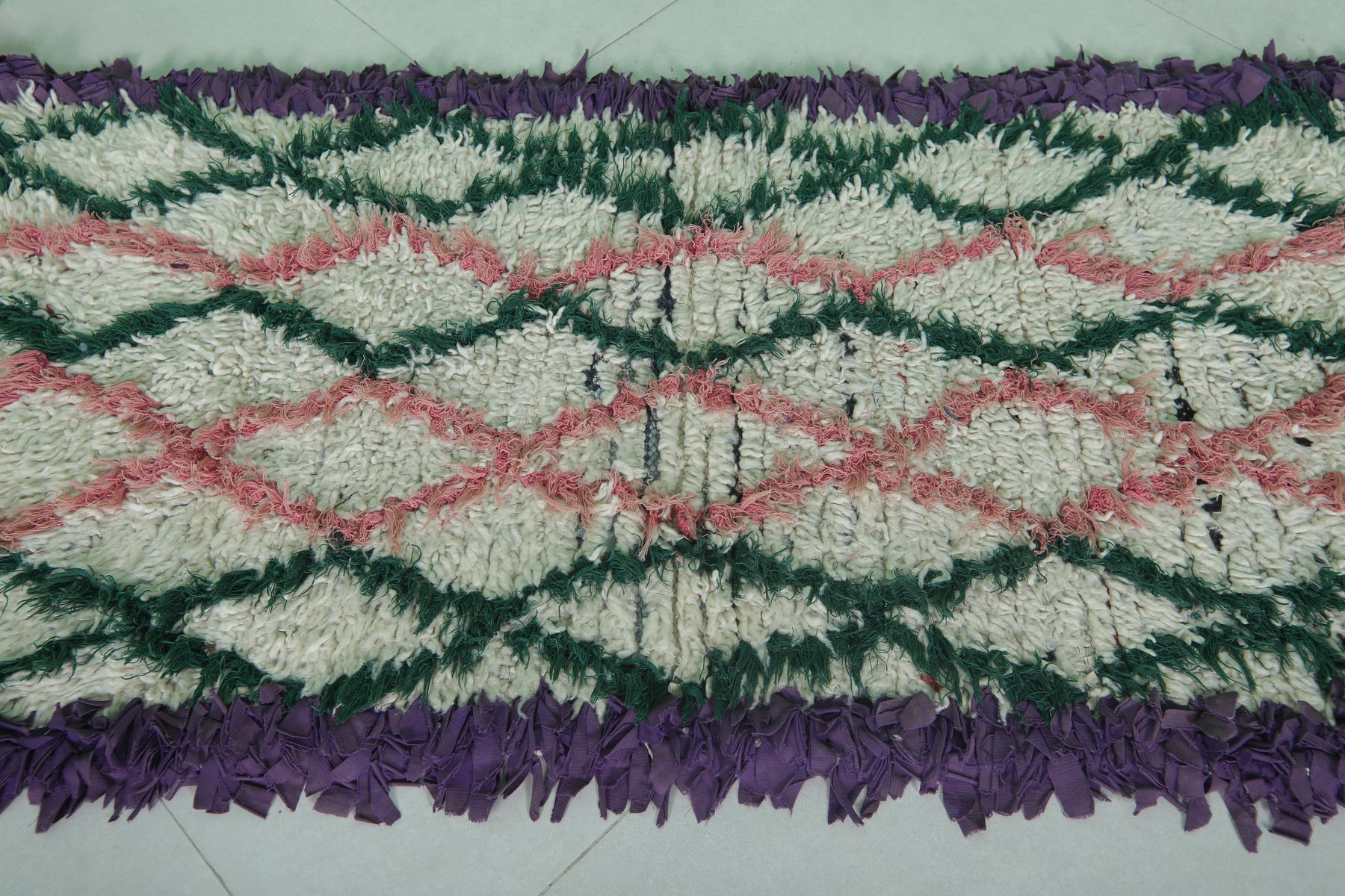 Liven up your space with this Colorful Moroccan Rug Runner (2.3 x 5.6 FT), featuring vibrant diamond latticework in pink and green framed by a bold purple border.