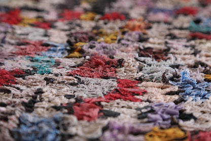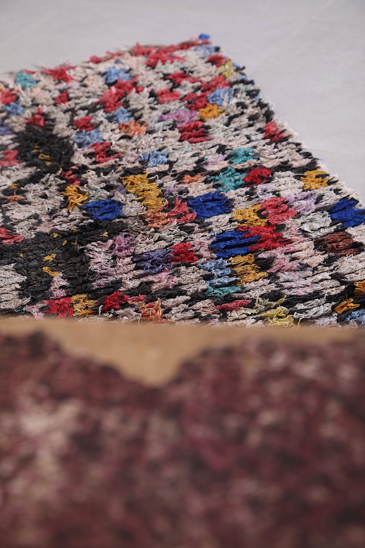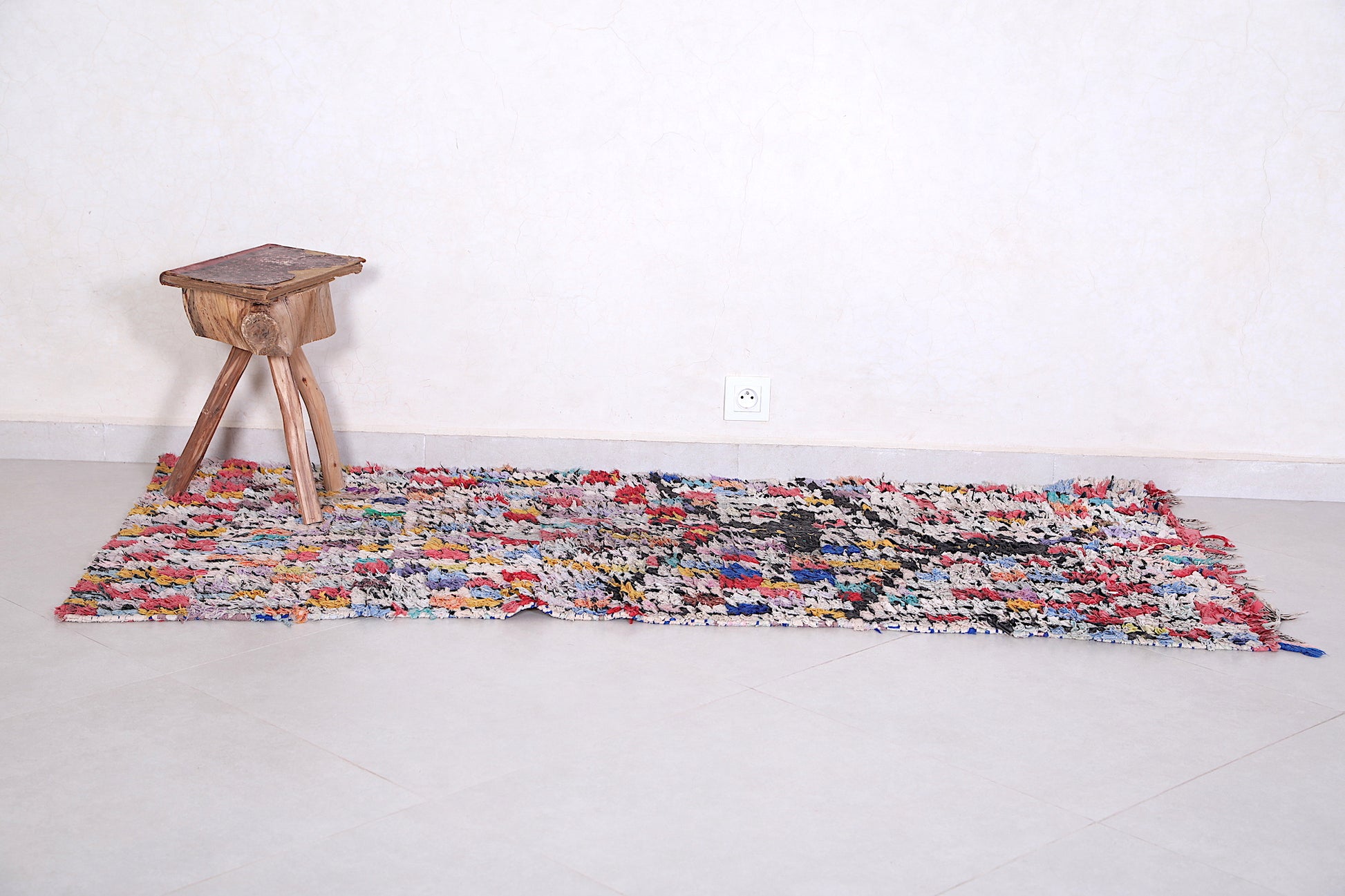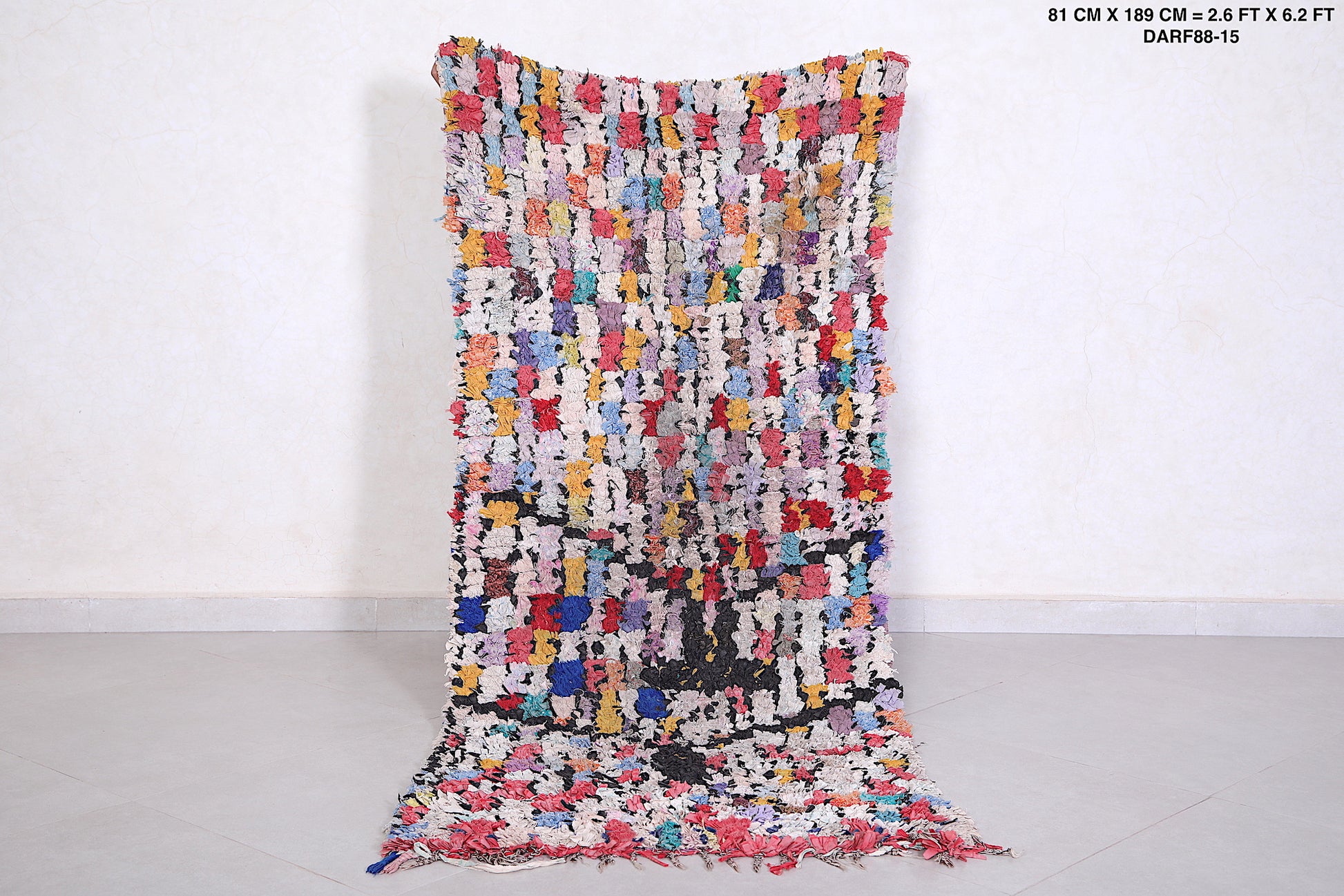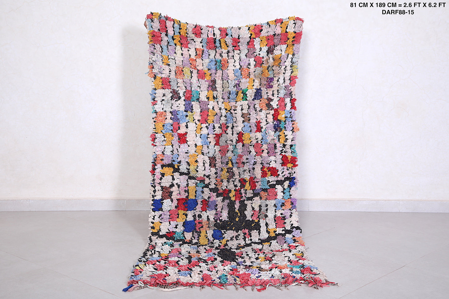 Elevate your interior with this vibrant handmade runner rug, measuring 2.6 x 6.2 FT. Showcasing an array of lively, multicolored squares, this Boucherouite-style rug is crafted from recycled fabrics, blending sustainability with artistry. Perfect for adding charm and color to hallways, entryways, or narrow spaces, this piece highlights traditional Moroccan craftsmanship.