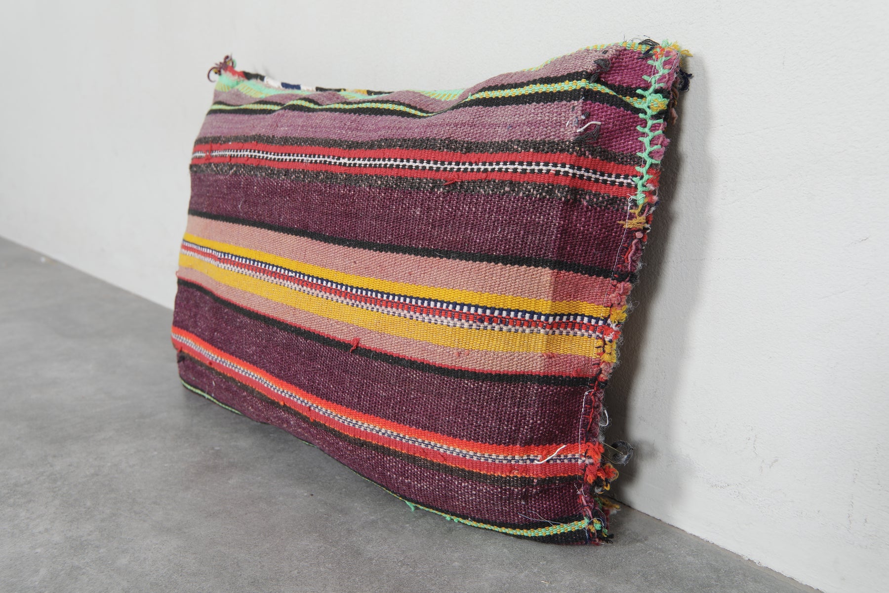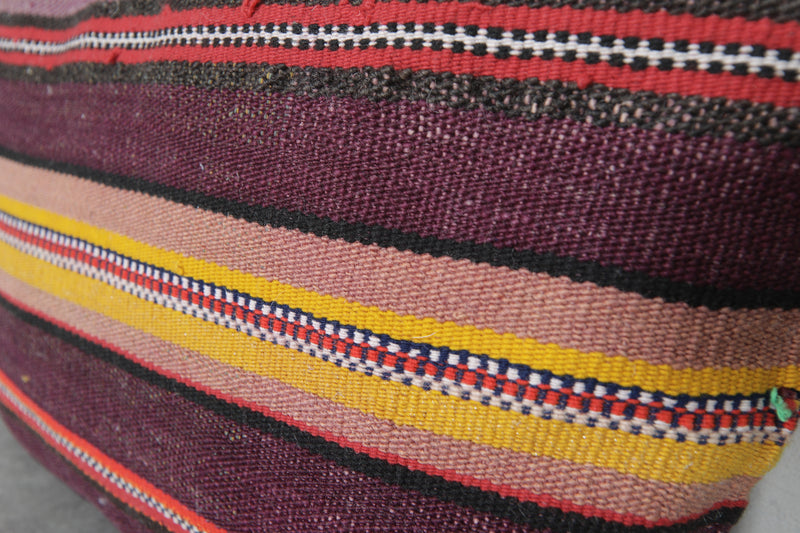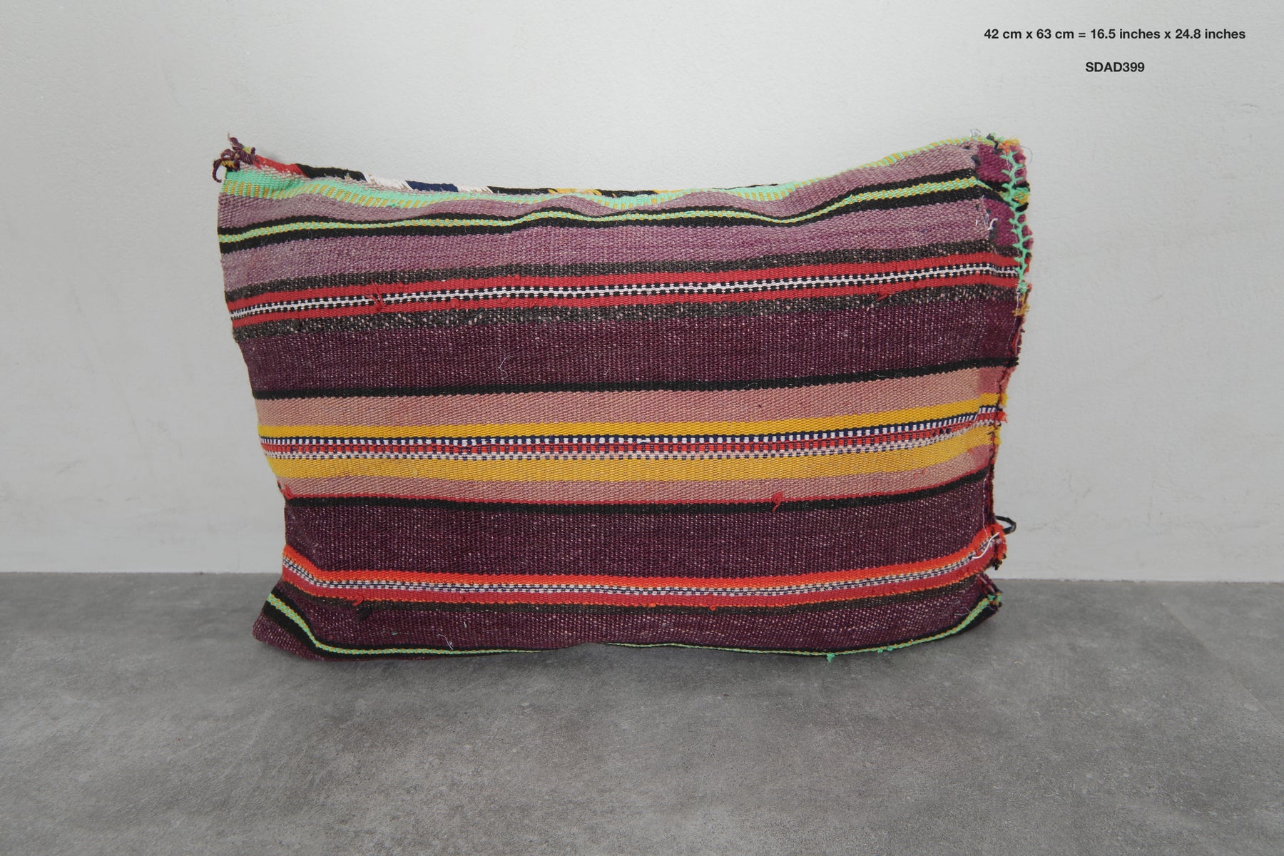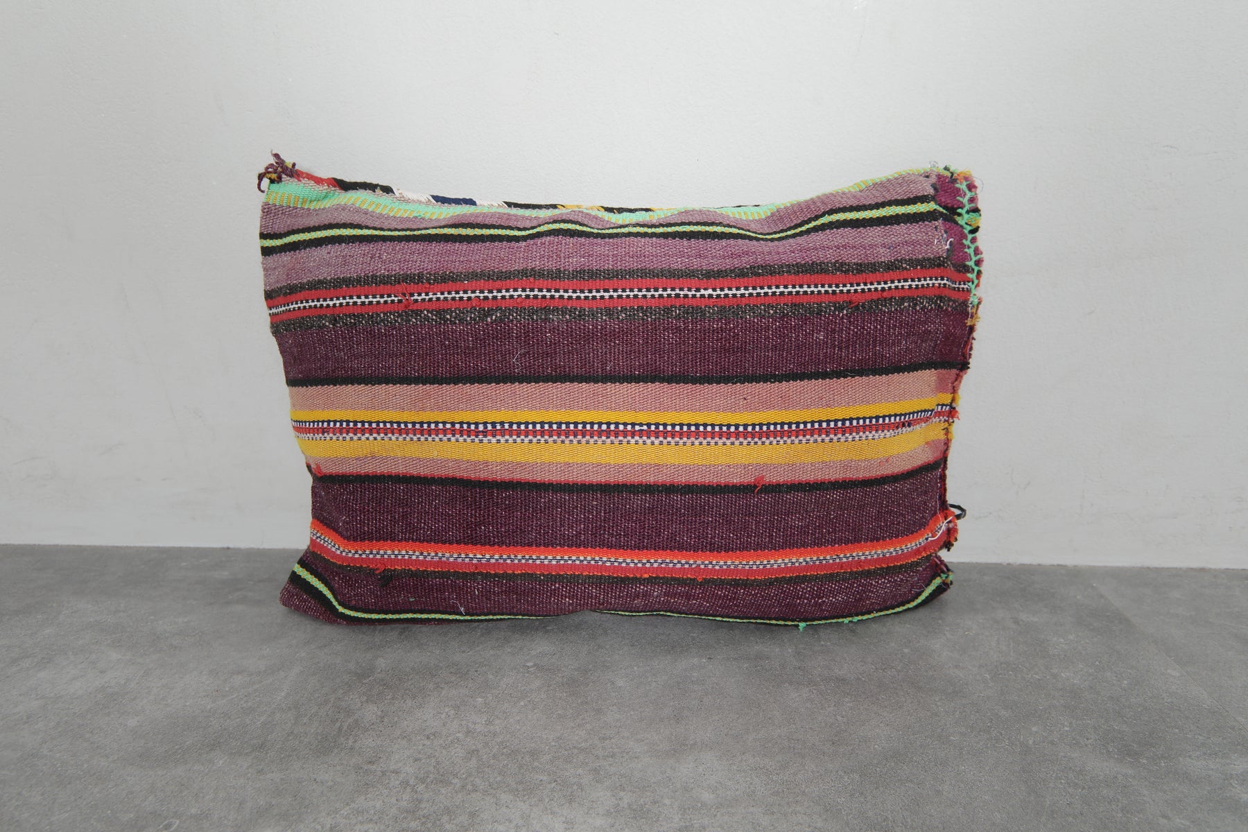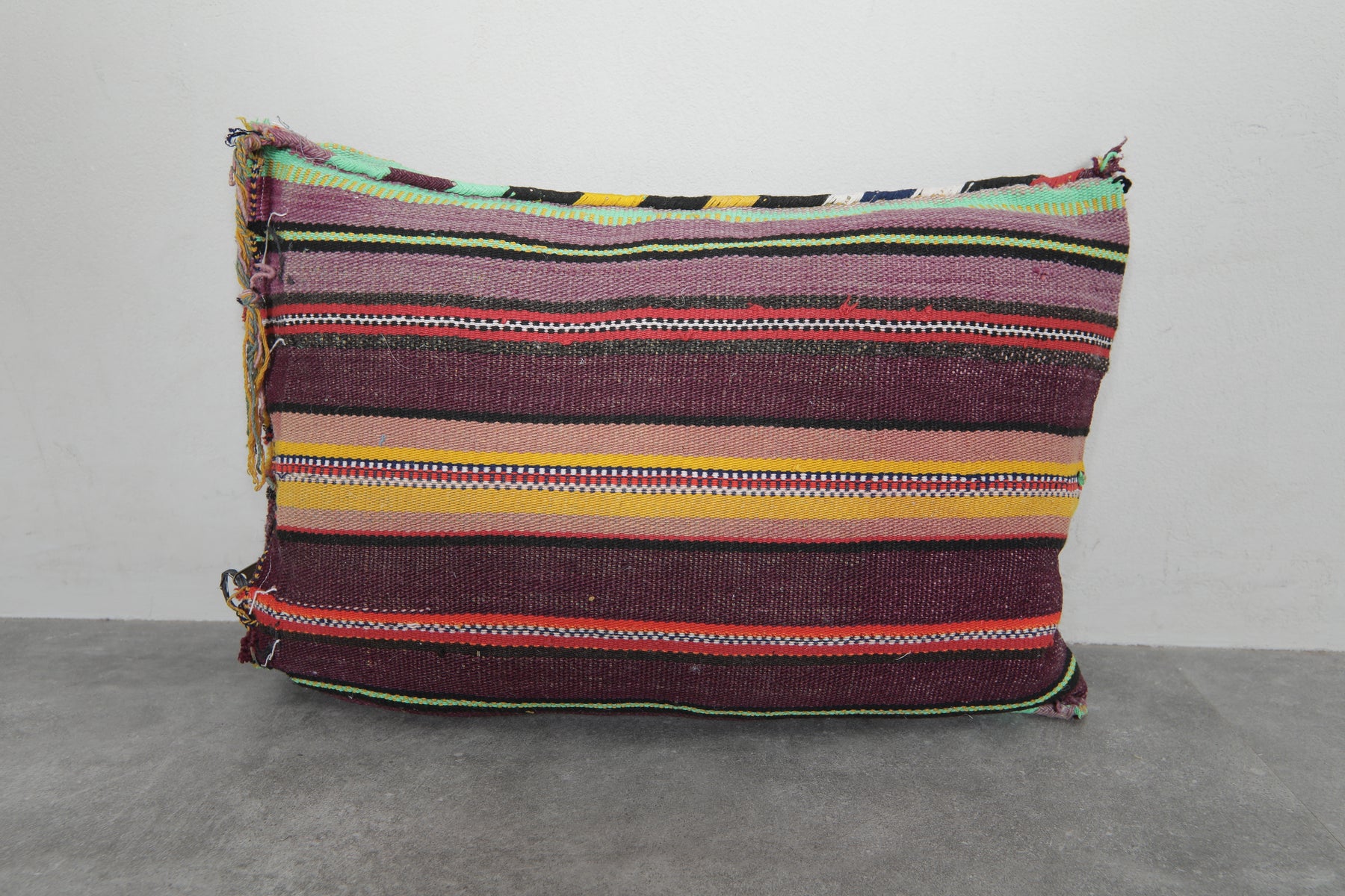Enhance your home decor with this stunning Moroccan pillow showcasing vibrant horizontal stripes in rich burgundy, yellow, orange, and green. Handwoven with intricate detailing, it offers a perfect mix of traditional design and modern aesthetics. Ideal for adding a bold touch to your living room, bedroom, or seating area. Dimensions: 16.5 x 24.8 inches.