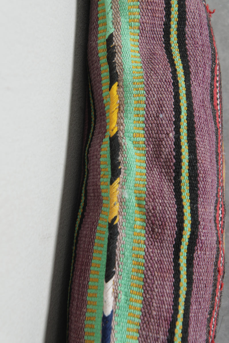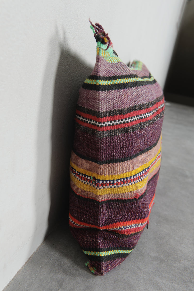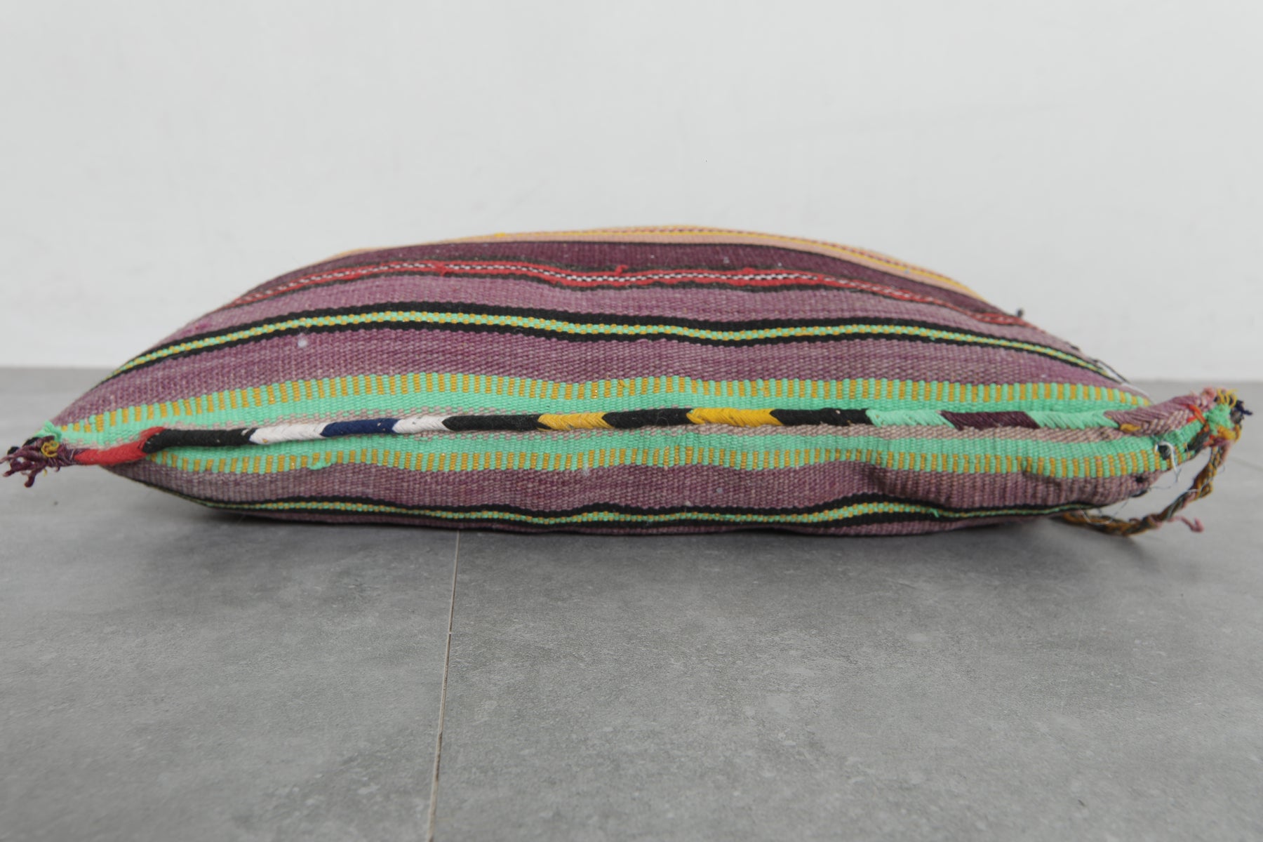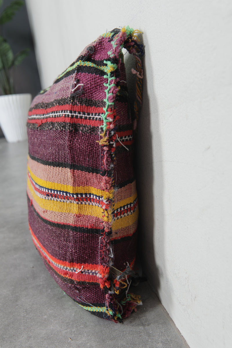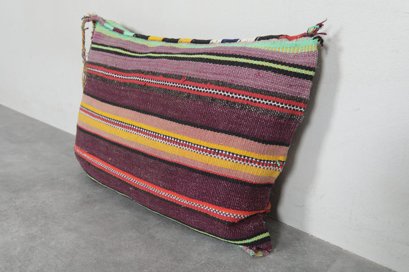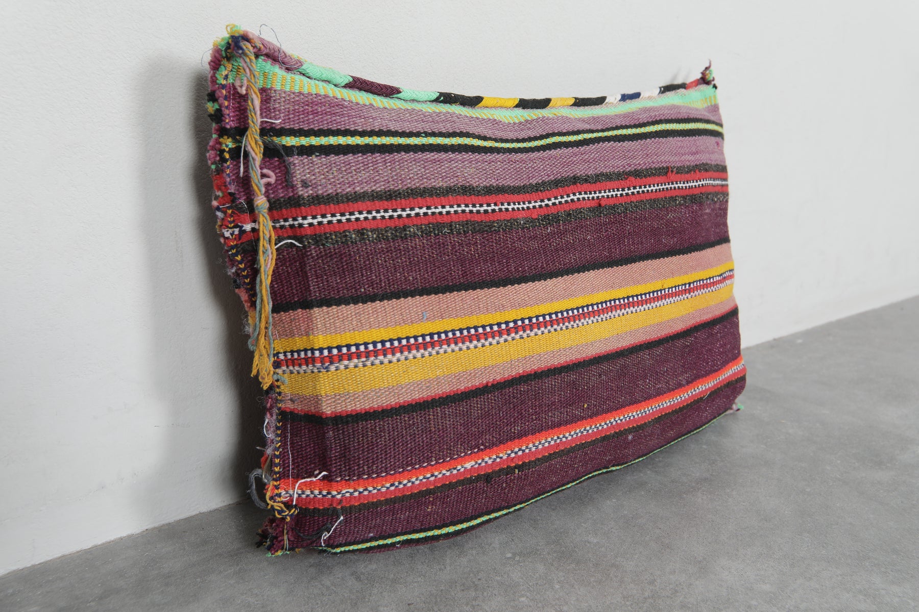 Enhance your home decor with this stunning Moroccan pillow showcasing vibrant horizontal stripes in rich burgundy, yellow, orange, and green. Handwoven with intricate detailing, it offers a perfect mix of traditional design and modern aesthetics. Ideal for adding a bold touch to your living room, bedroom, or seating area. Dimensions: 16.5 x 24.8 inches.