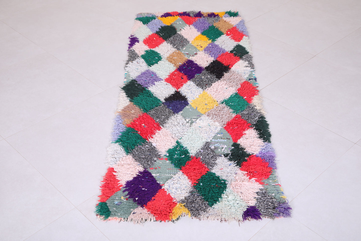 Brighten your home with this colorful Moroccan Boucherouite runner rug, featuring a captivating diamond pattern in vibrant hues of green, yellow, red, purple, and more. Measuring 2.5 x 6.3 feet, this one-of-a-kind piece adds a cheerful and artistic aesthetic to any space, perfect for hallways, bedrooms, or living areas.