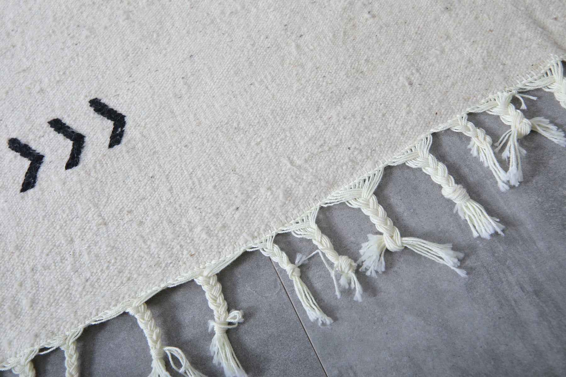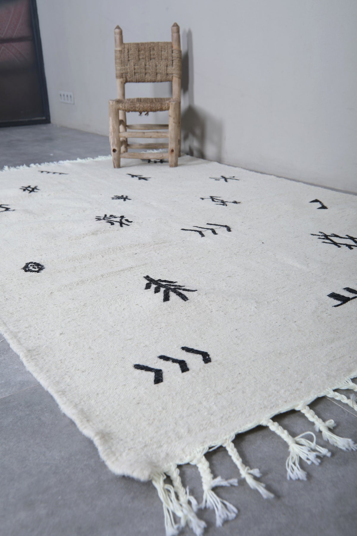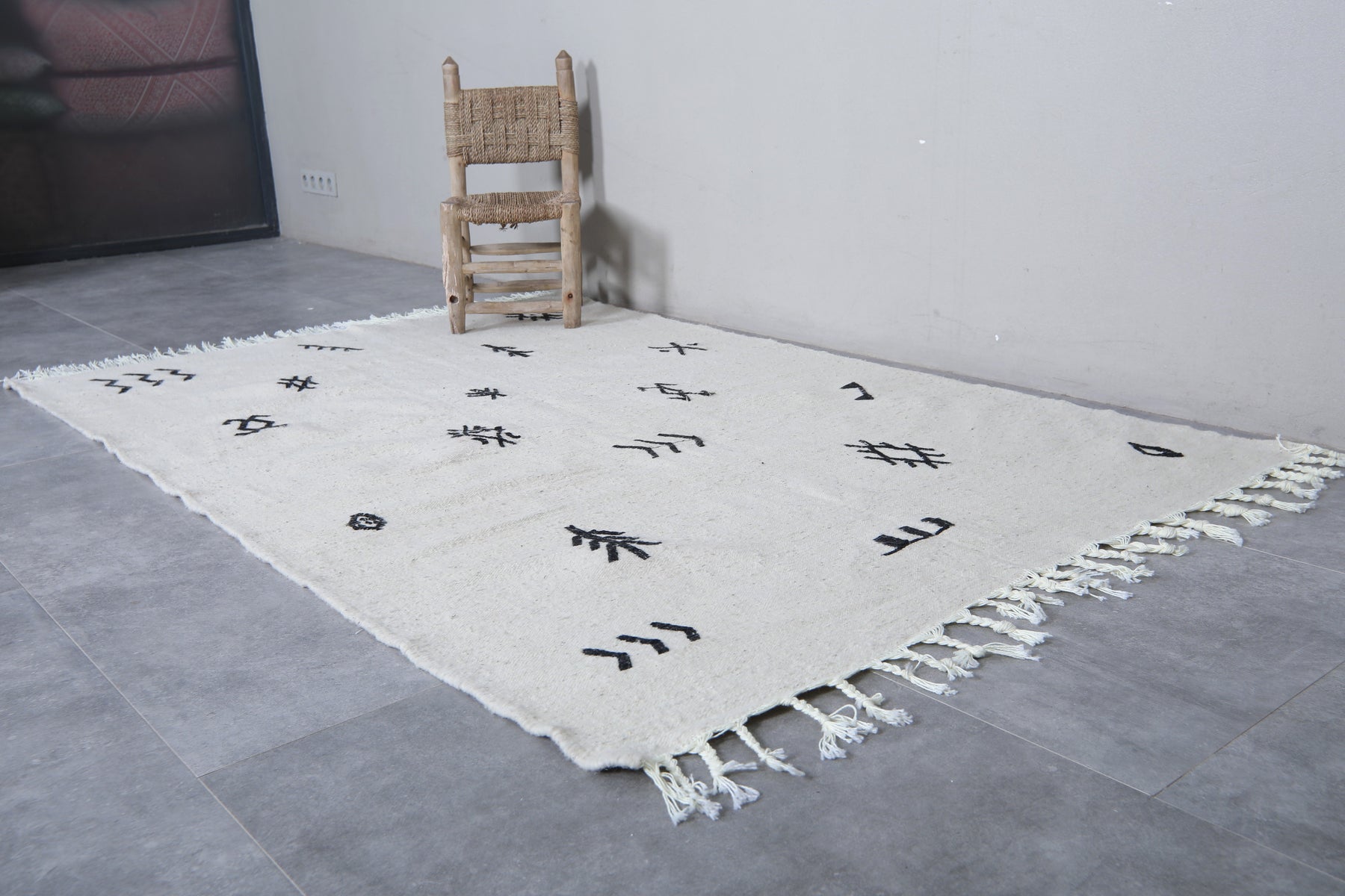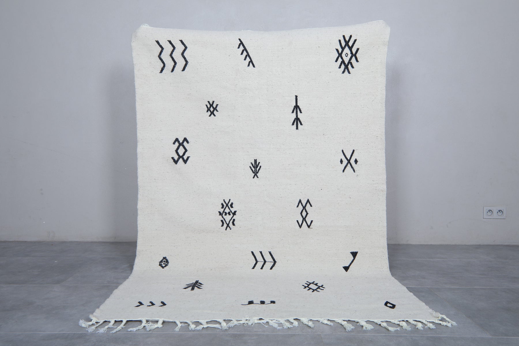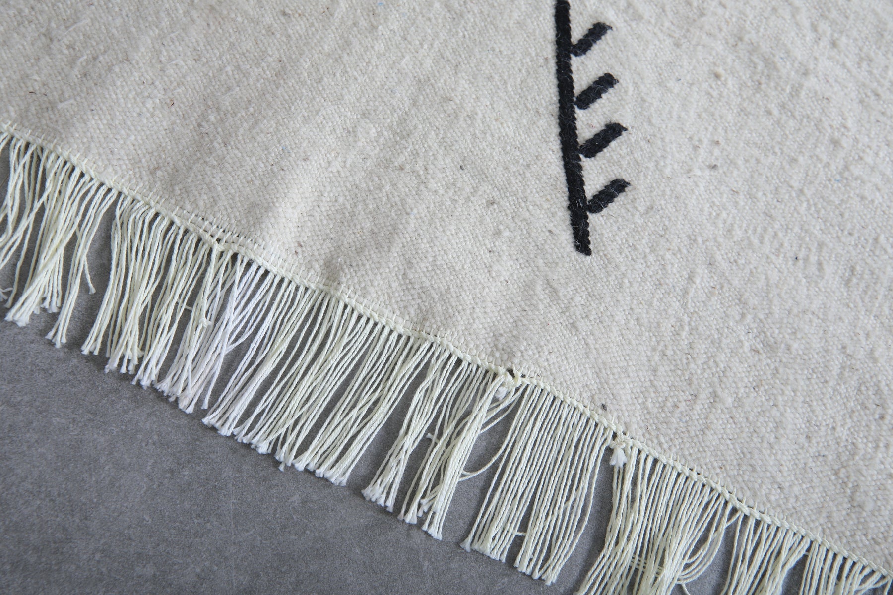 Add a touch of authentic character to a room with this Azilal-style flat-weave Moroccan rug, featuring striking black tribal symbols on a clean white background. Each symbol has a story to tell of heritage and meaning, drawn from inspiration found in traditional Berber motifs. This makes this rug more than just a covering for the floor-it's a statement of culture. Woven from natural wool into a flat, lightweight weave, it features fringed edges and can be used either on its own or layered in modern, boho, or minimalist settings.