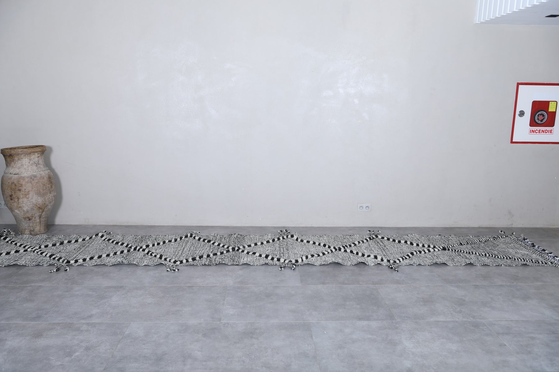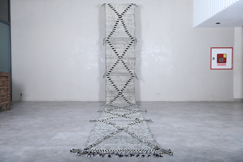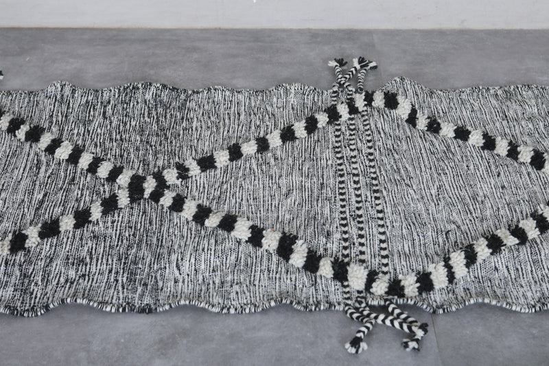 Bring timeless style to your home with this Moroccan handmade rug, featuring a striking black and white diamond motif on a soft, heathered gray background. Perfect for hallways, entryways, or narrow spaces, this long Berber rug is handwoven from natural wool and finished with traditional tassels. Its minimalist tribal design and durable flatweave construction make it an elegant yet practical choice for modern or rustic decor. A beautiful blend of tradition and contemporary charm.