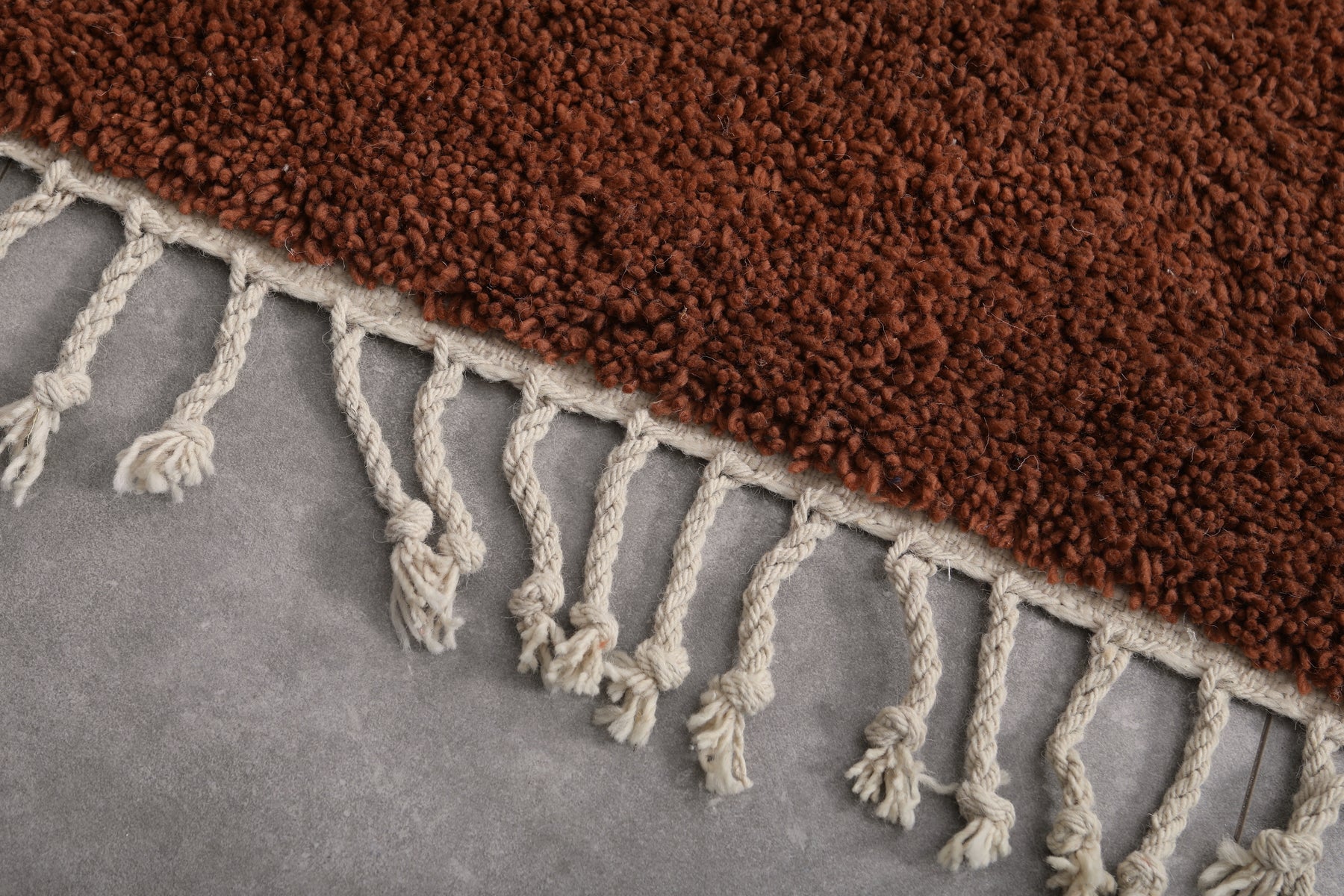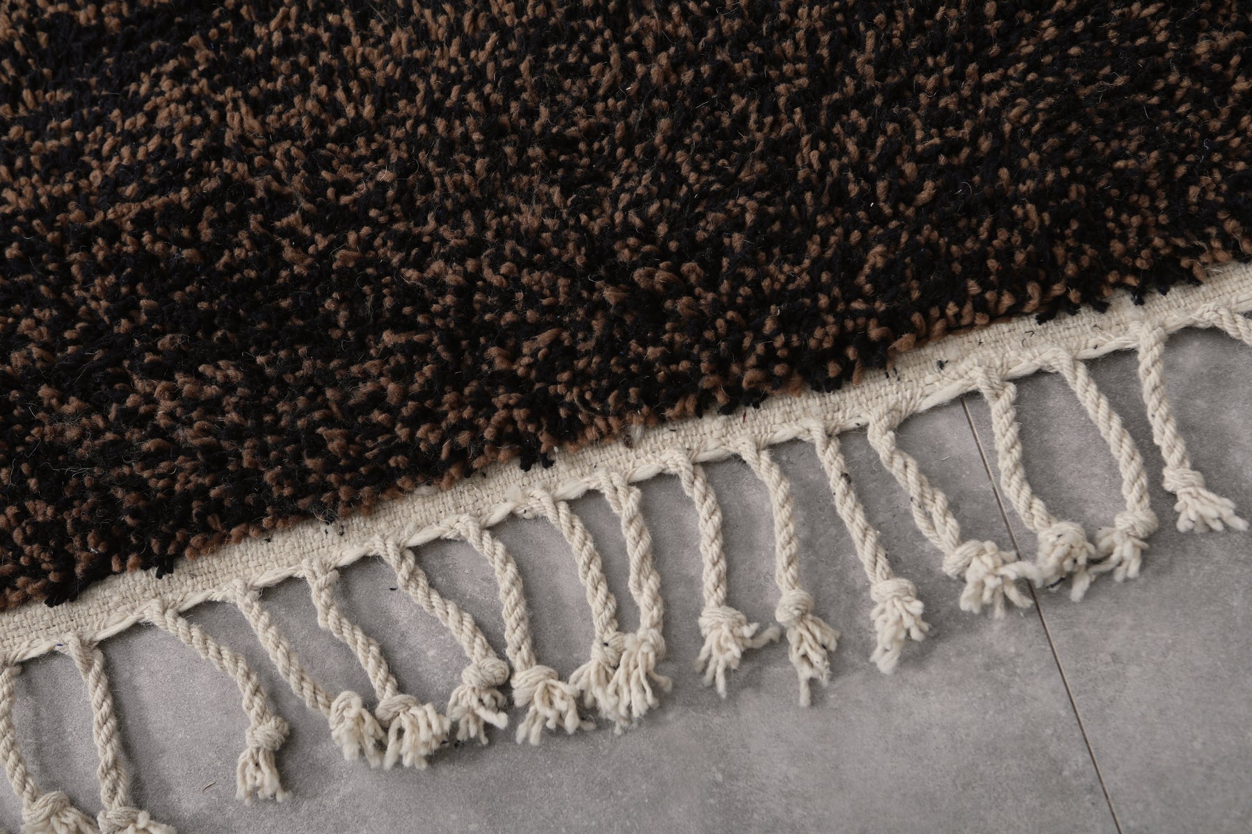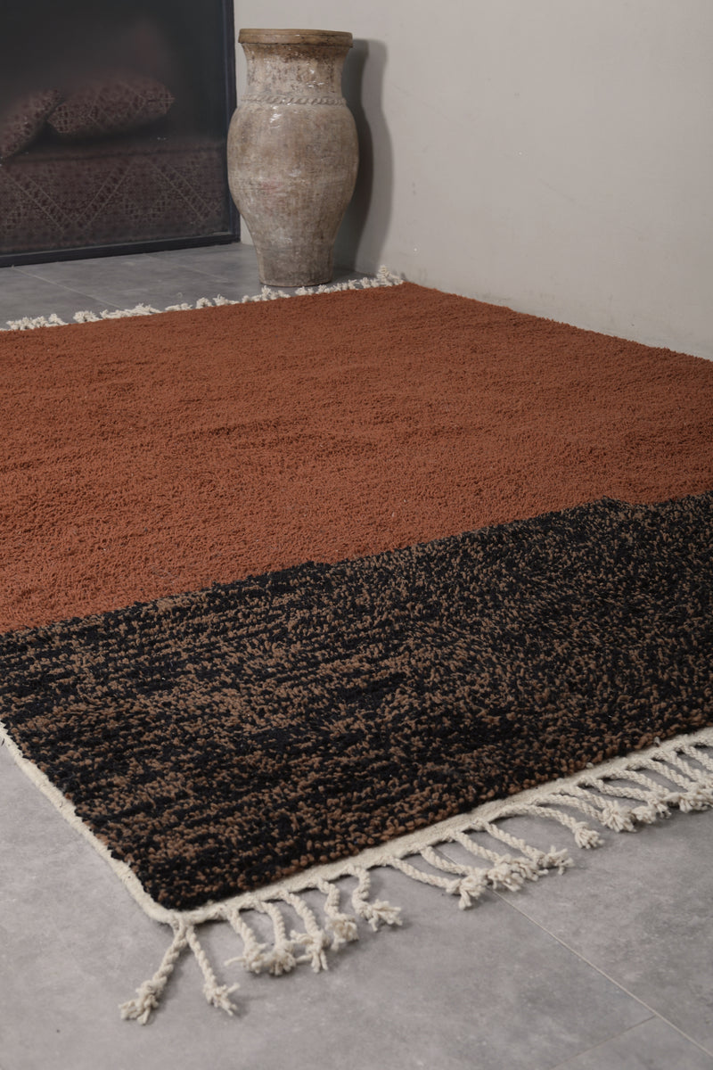 Add earthy elegance to your space with this Moroccan wool rug, handwoven in a striking blend of deep brown and black. The minimalist color-block design offers a modern aesthetic while respecting traditional Berber craftsmanship. Made from 100% natural wool, this plush rug provides warmth and texture underfoot, making it ideal for cozy living rooms, serene bedrooms, or modern rustic interiors. The fringe edges are natural, setting it as a bold yet timeless piece that anchors your space not only in style but also in authenticity.
