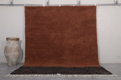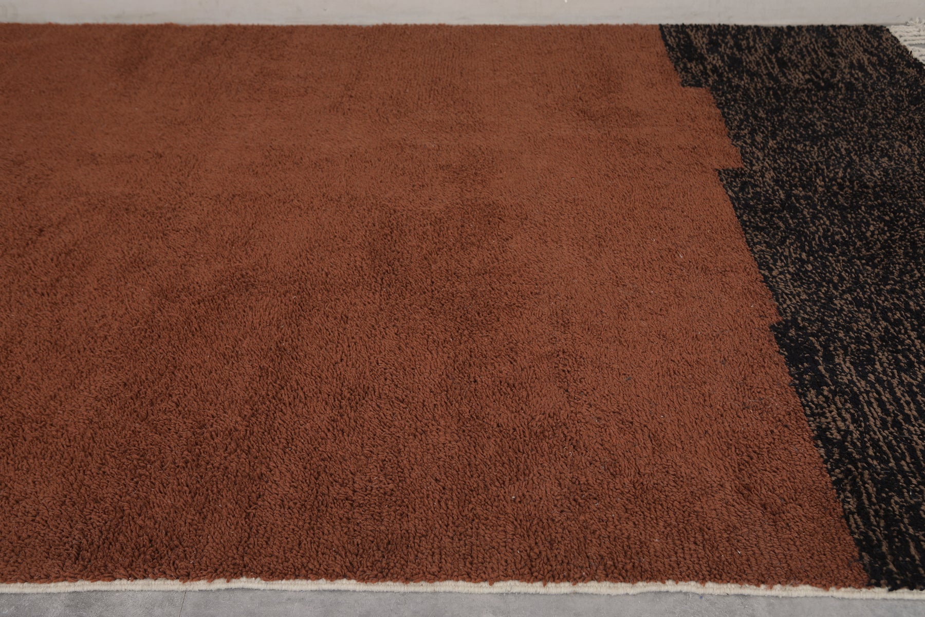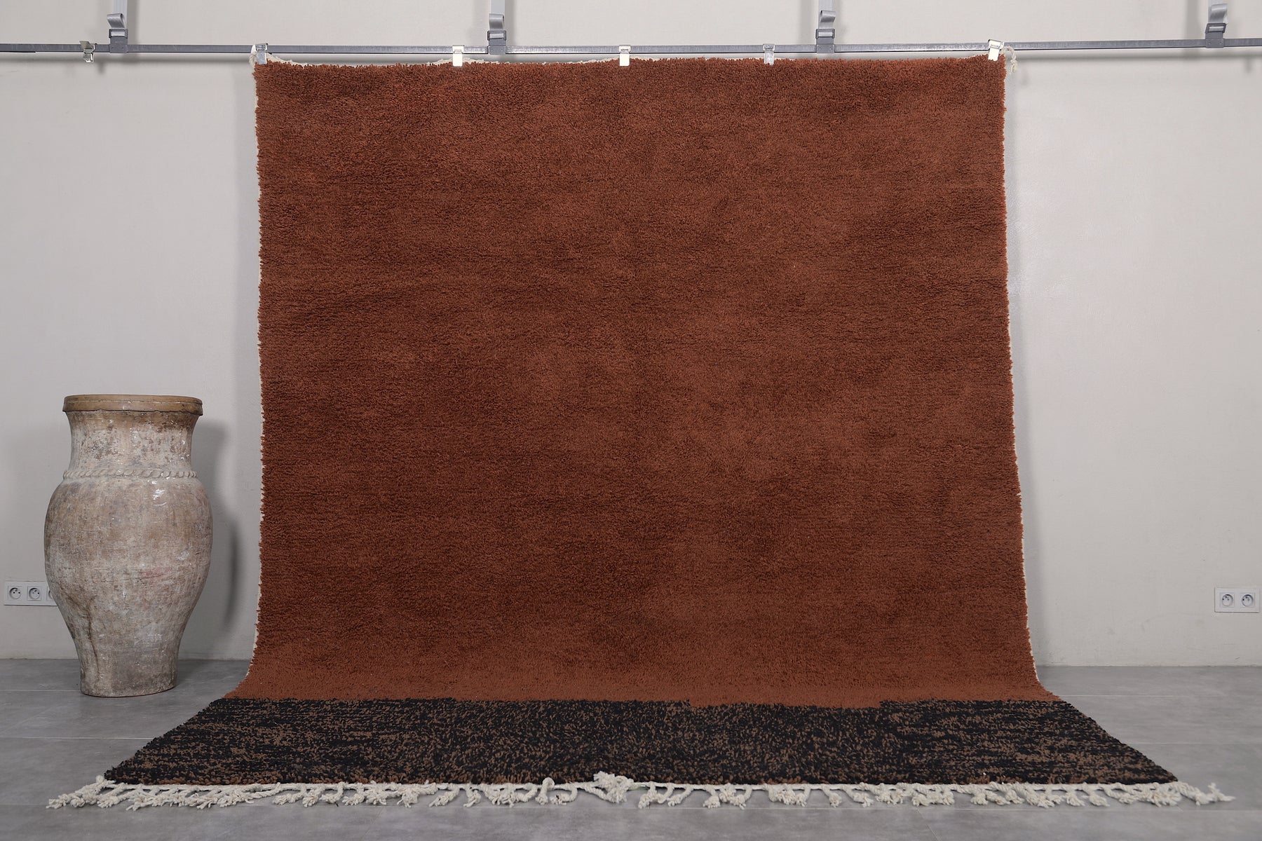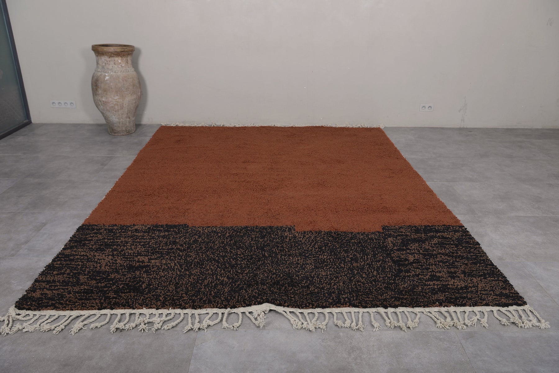 Add earthy elegance to your space with this Moroccan wool rug, handwoven in a striking blend of deep brown and black. The minimalist color-block design offers a modern aesthetic while respecting traditional Berber craftsmanship. Made from 100% natural wool, this plush rug provides warmth and texture underfoot, making it ideal for cozy living rooms, serene bedrooms, or modern rustic interiors. The fringe edges are natural, setting it as a bold yet timeless piece that anchors your space not only in style but also in authenticity.