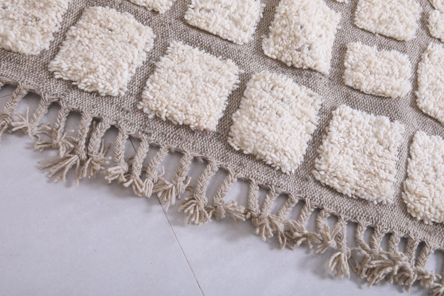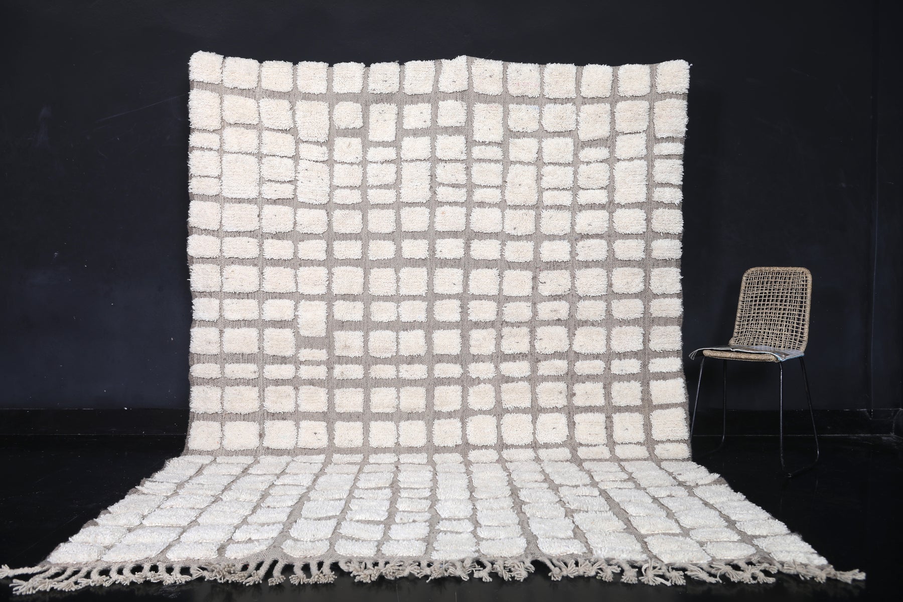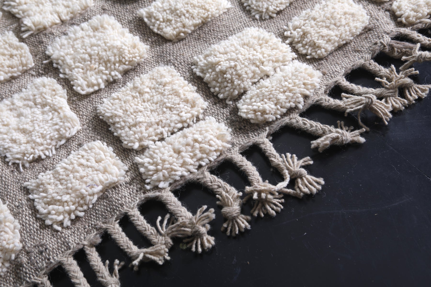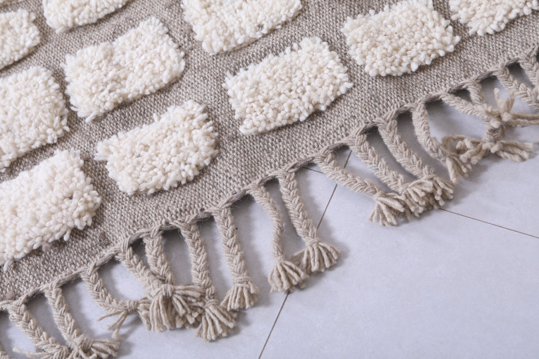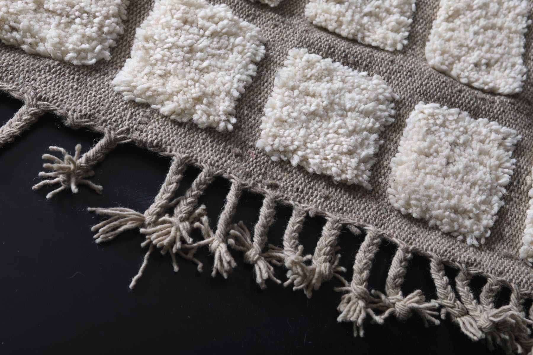 Add modern texture and artisanal charm to your home with this Checkered Moroccan Rug in Cream and grey. Handwoven by skilled Berber artisans, this rug features a unique grid-like pattern that blends traditional Moroccan weaving with a clean, minimalist aesthetic. The soft cream pile contrasts beautifully against a natural taupe base, creating a cozy yet sophisticated look.