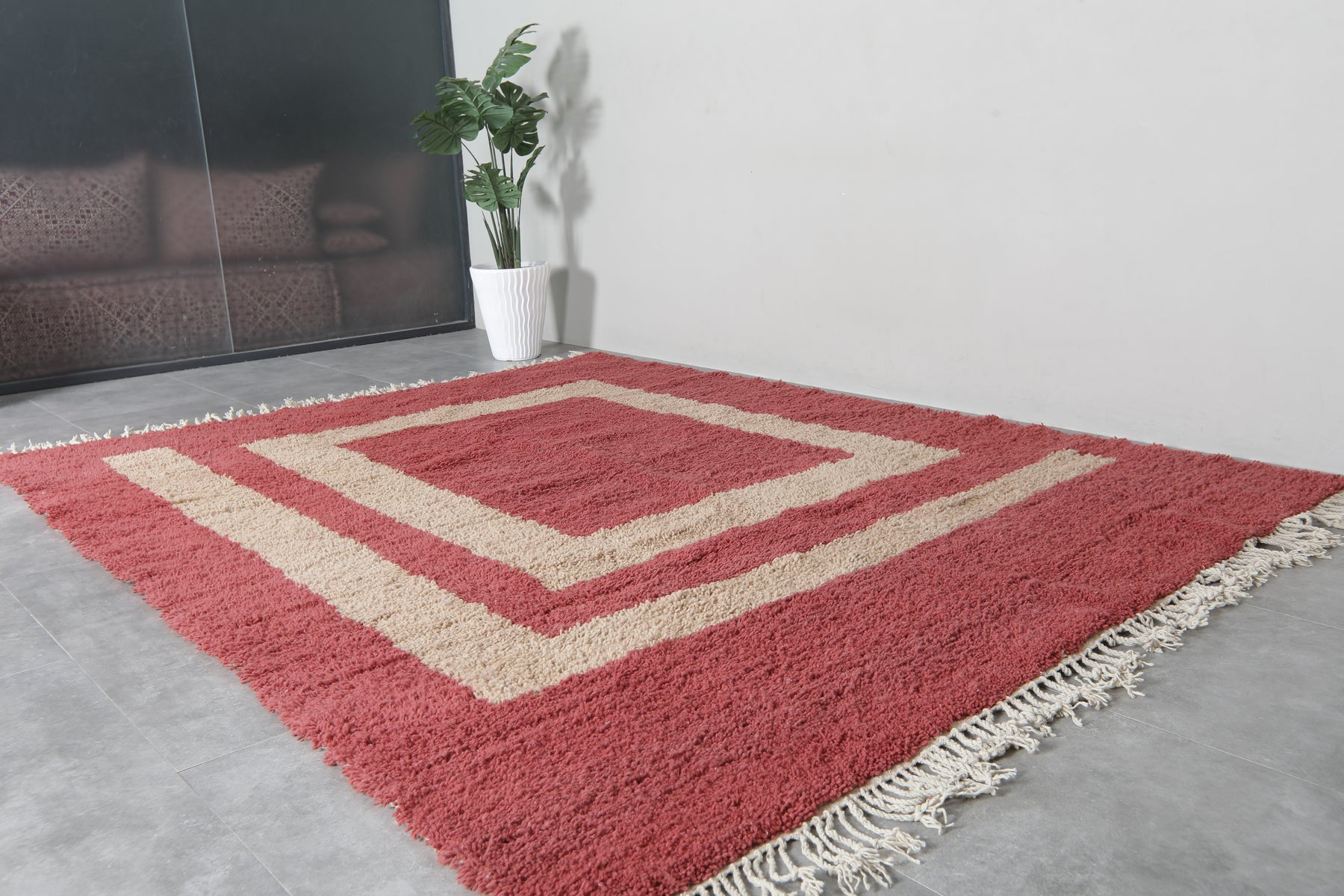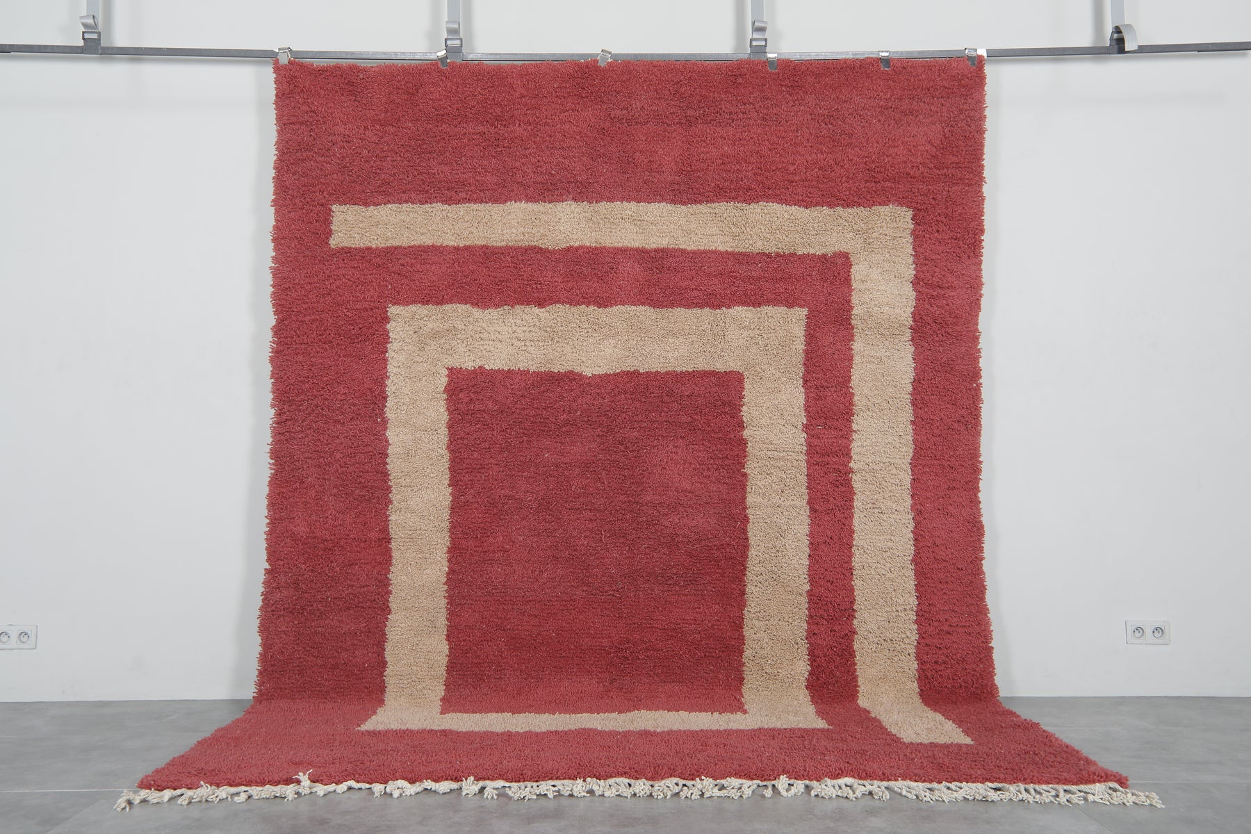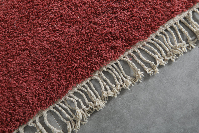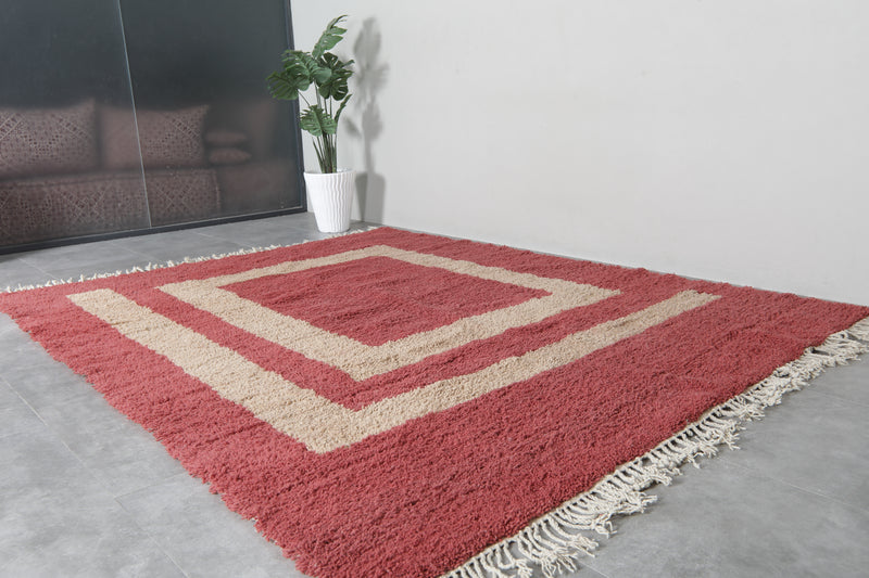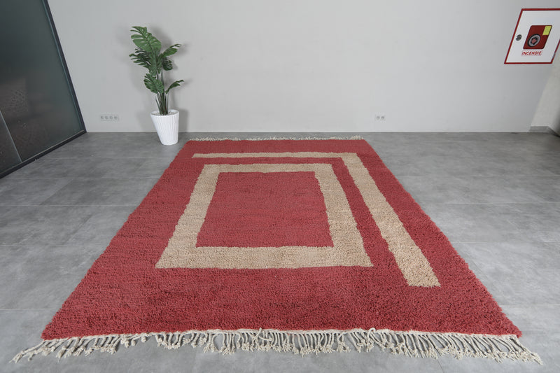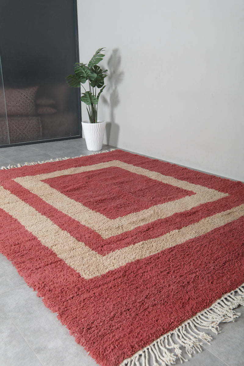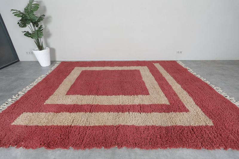 This exquisite handwoven Moroccan rug seamlessly combines traditional craftsmanship with a bold, contemporary design. Featuring a striking red and beige color palette, the rug showcases a detailed beige square at the center, adding a unique touch of sophistication. The plush texture ensures a luxurious feel underfoot, while the hand-knotted fringes bring an authentic artisanal element to the piece. Whether placed in a modern, transitional, or classic setting, this rug will enhance your space with both style and warmth.