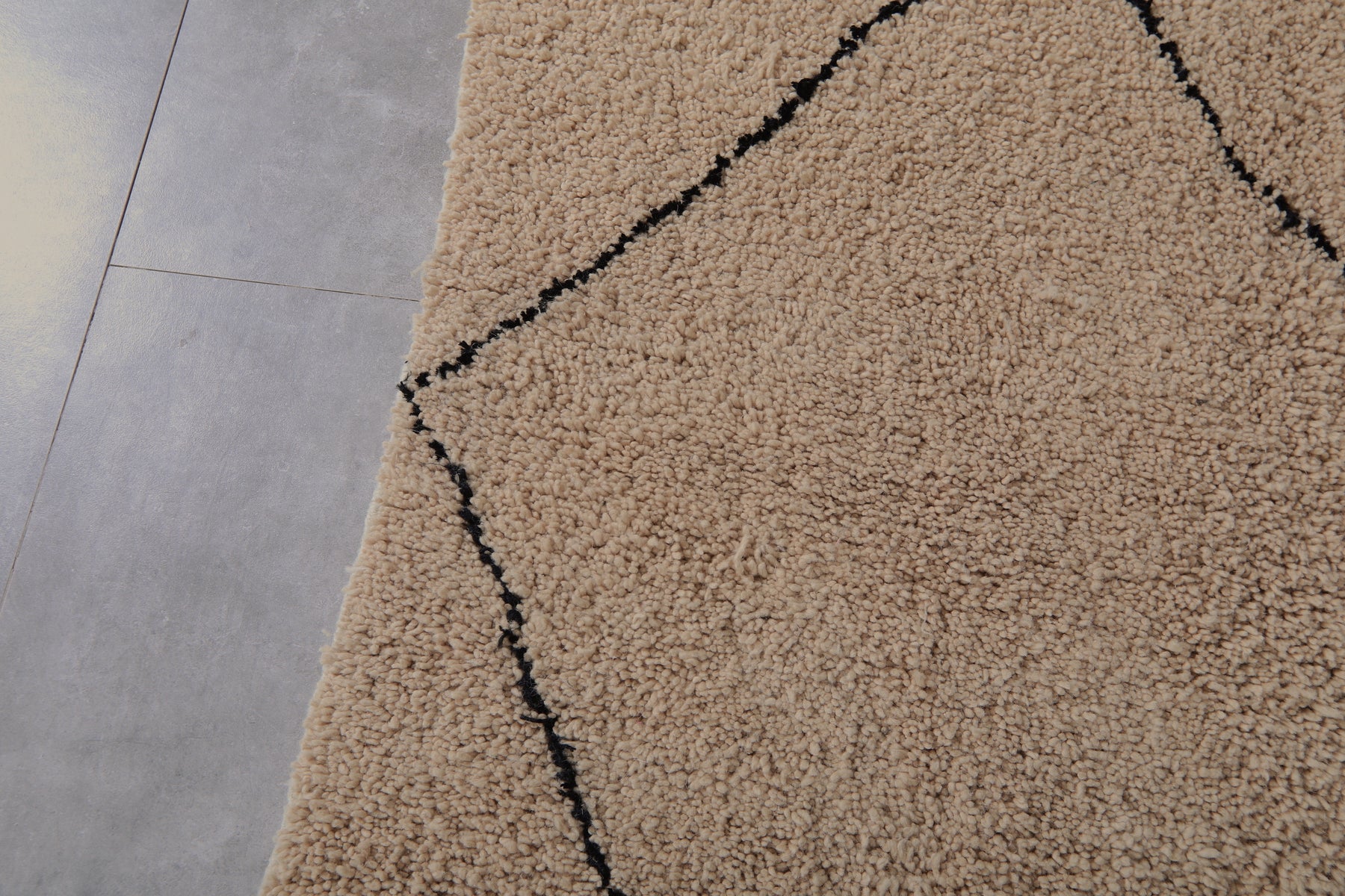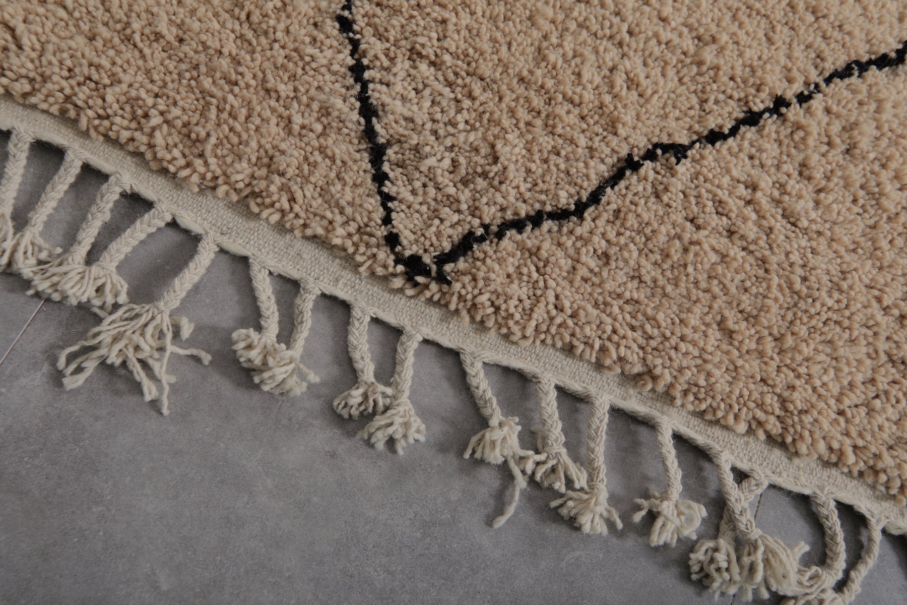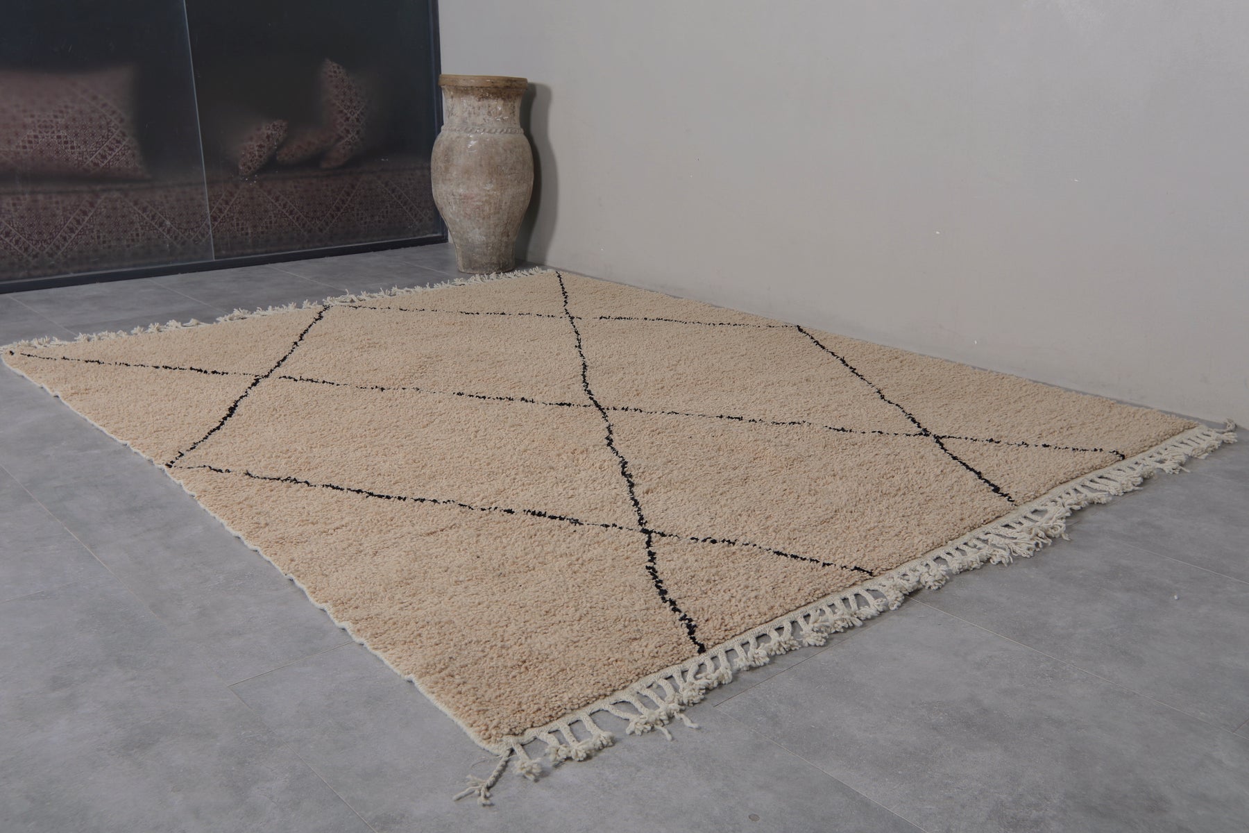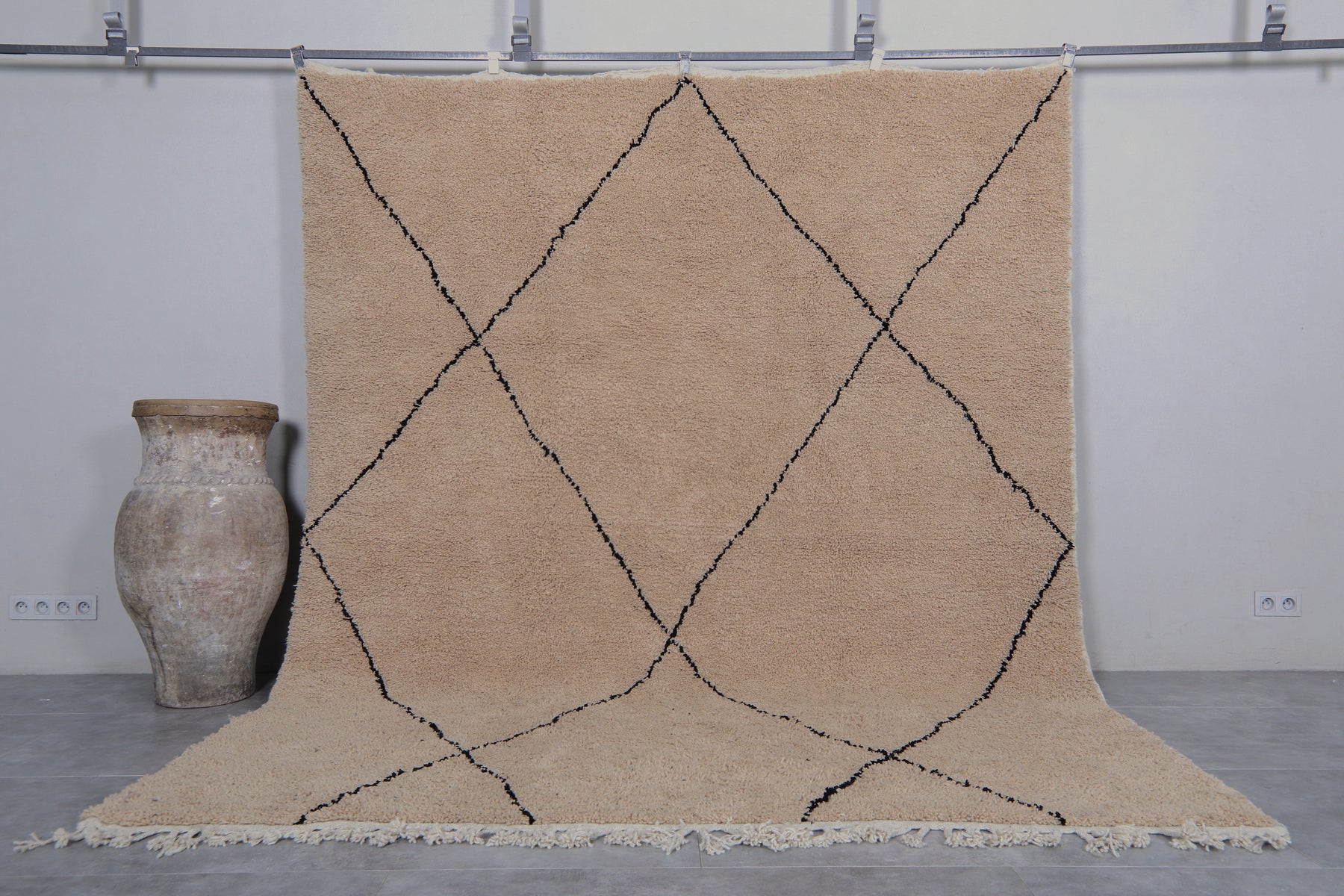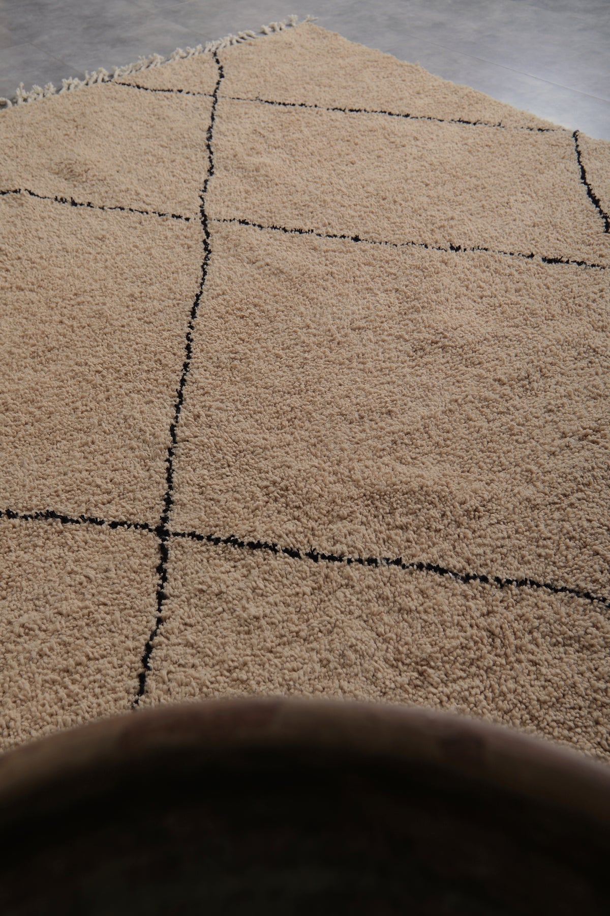 Infuse your home with the rich heritage of Morocco with this handwoven Beni Ourain rug, crafted by skilled artisans using traditional Berber techniques. This stunning beige Moroccan rug features a classic diamond lattice pattern in black, delivering the perfect balance of minimalist elegance and cultural charm.