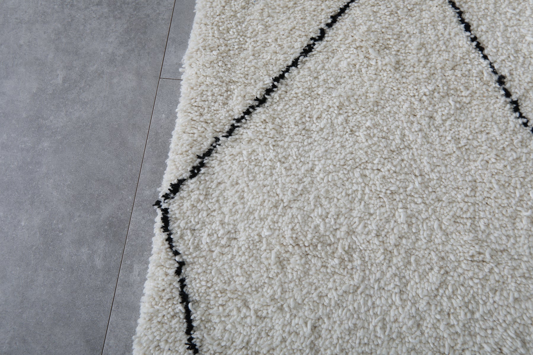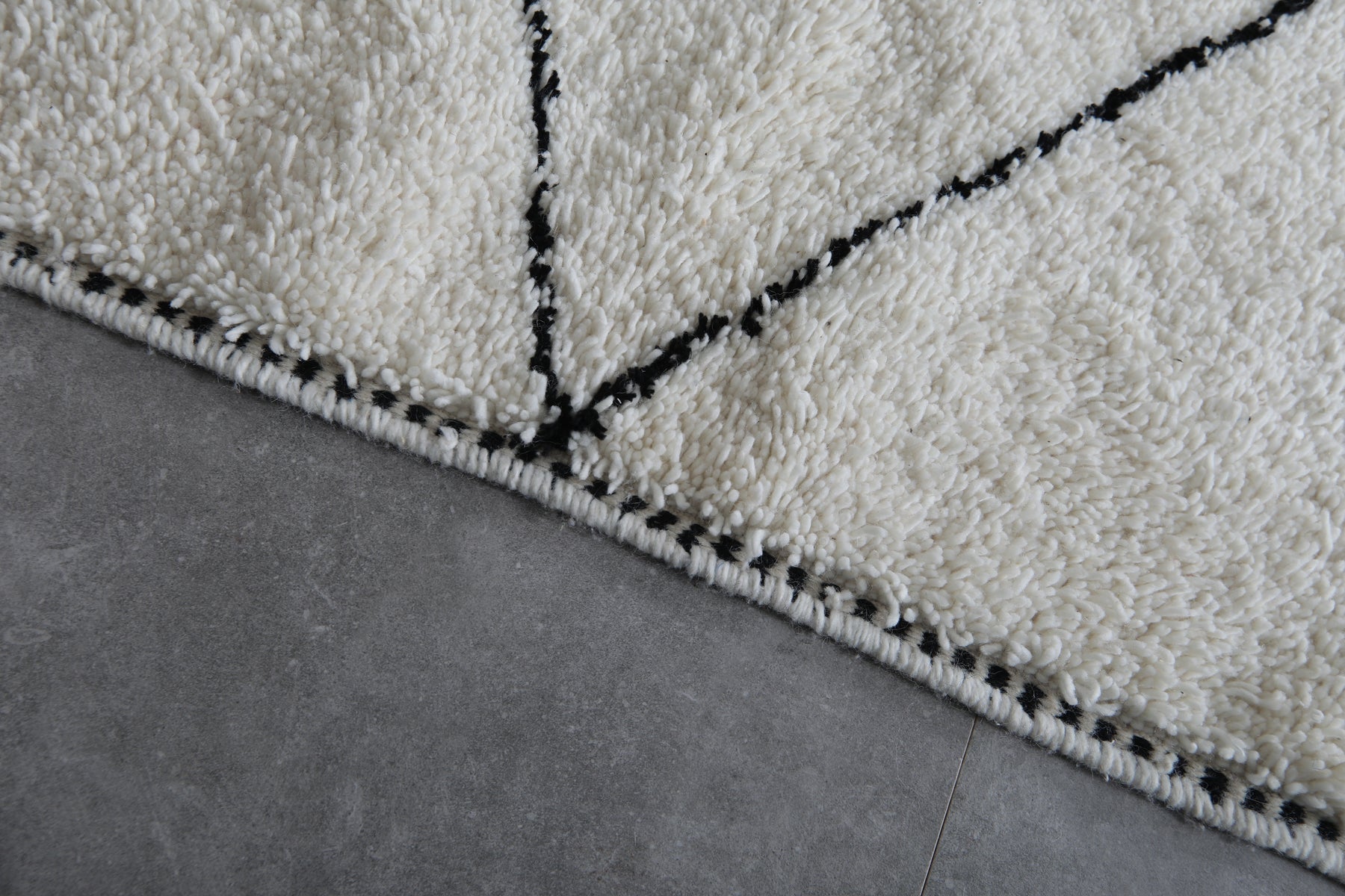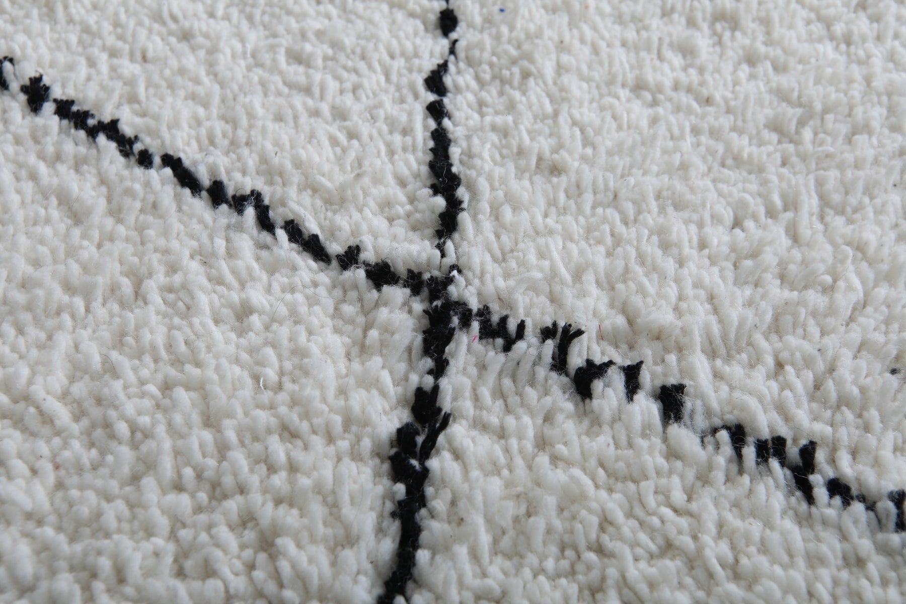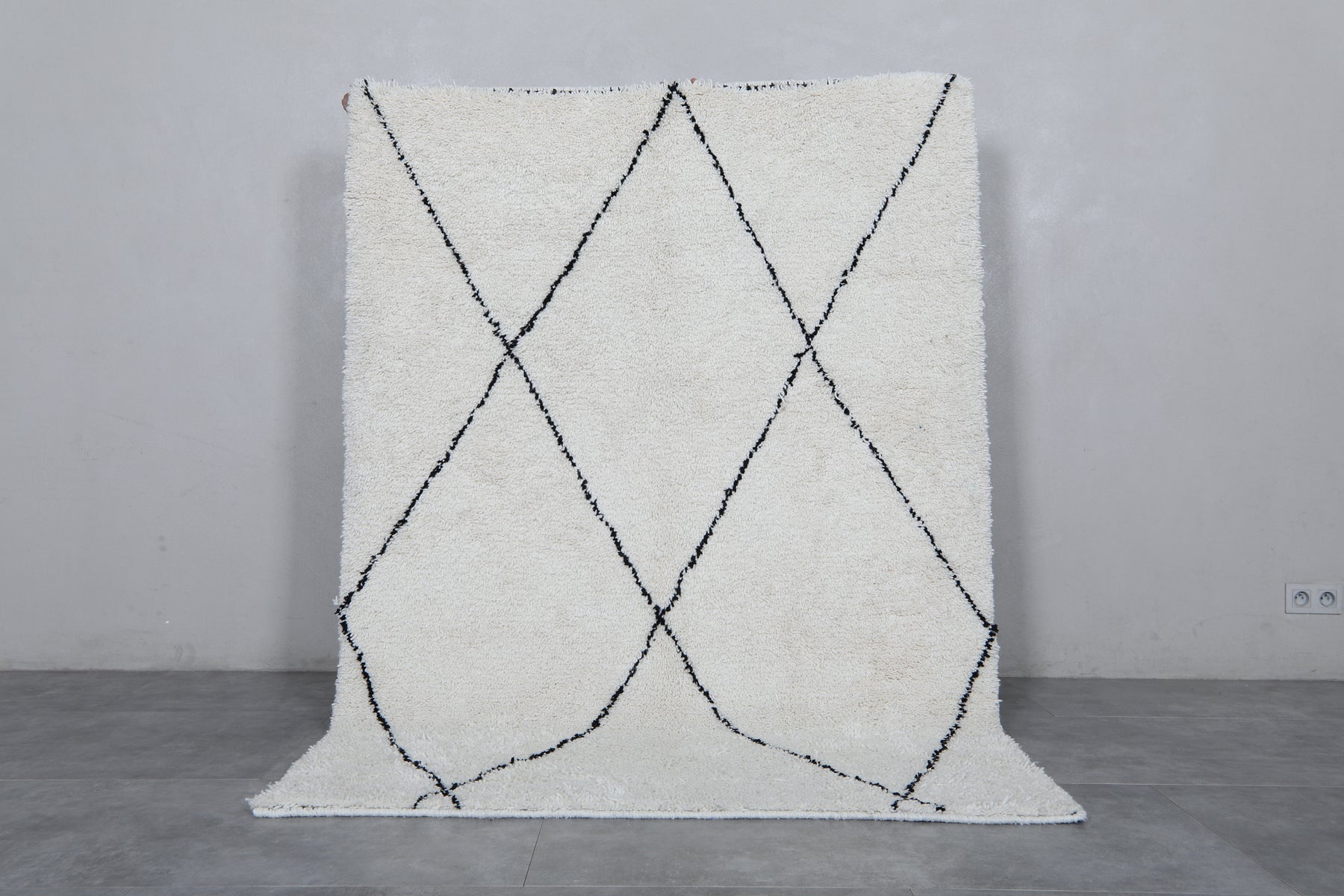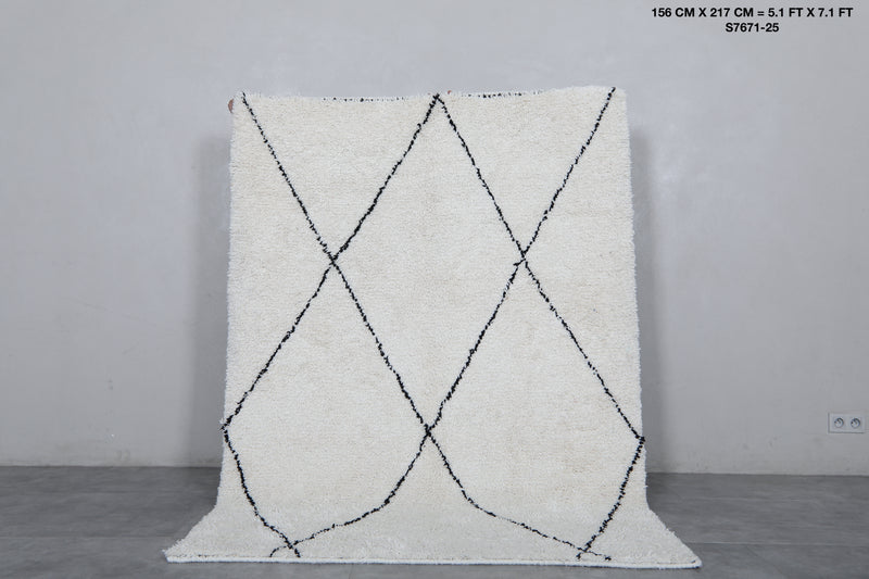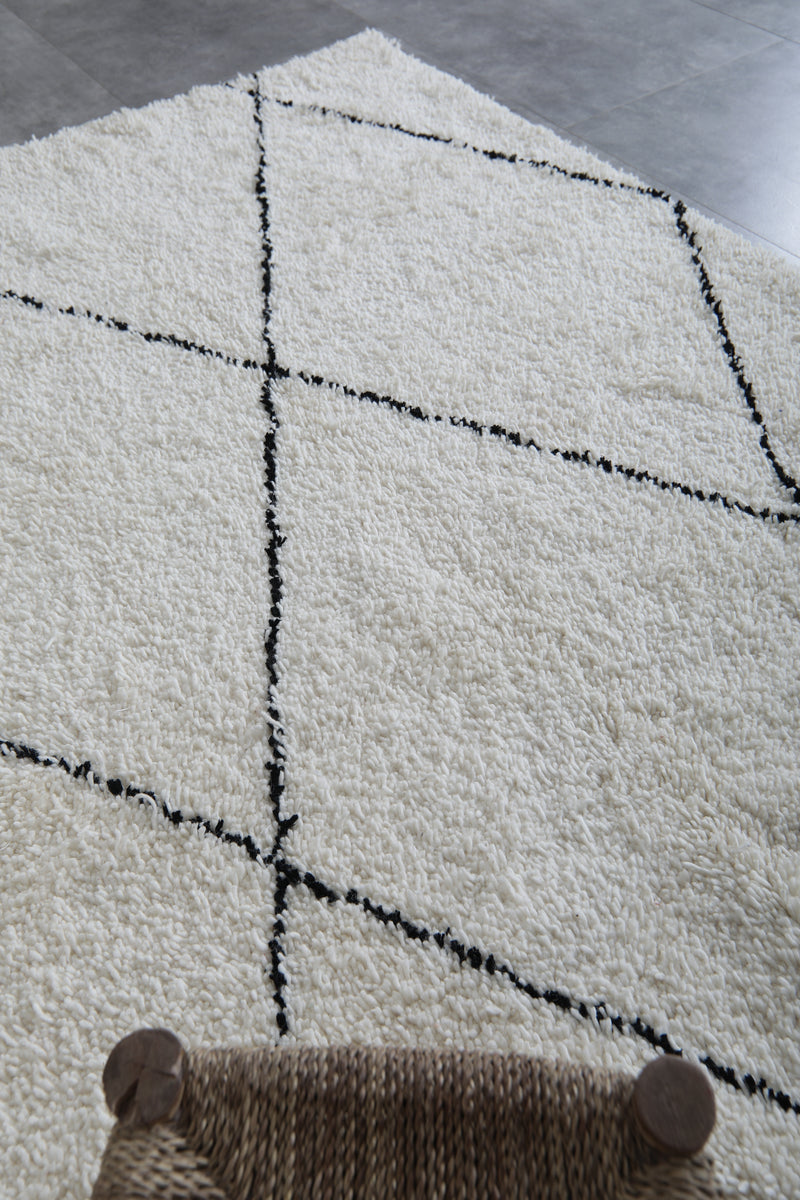 Bring timeless elegance to your home with this Diamond Moroccan Rug, handwoven from soft natural wool. Measuring 5.1 x 7.1 feet (156 CM x 217 CM), this rug features a classic diamond pattern in bold black lines on a neutral white background, making it a versatile addition to modern or traditional interiors. Its medium size and plush texture are perfect for adding warmth and sophistication to living rooms, bedrooms, or offices. Durable and stylish, this Moroccan rug is a testament to exceptional craftsmanship. Elevate your décor with this stunning handmade piece today!