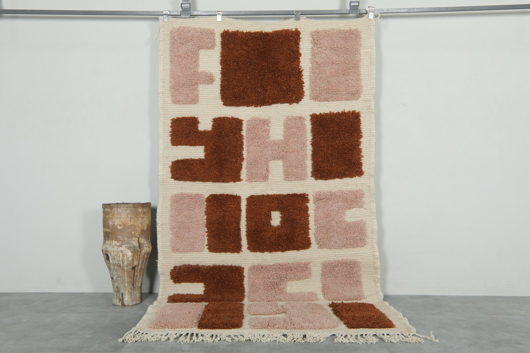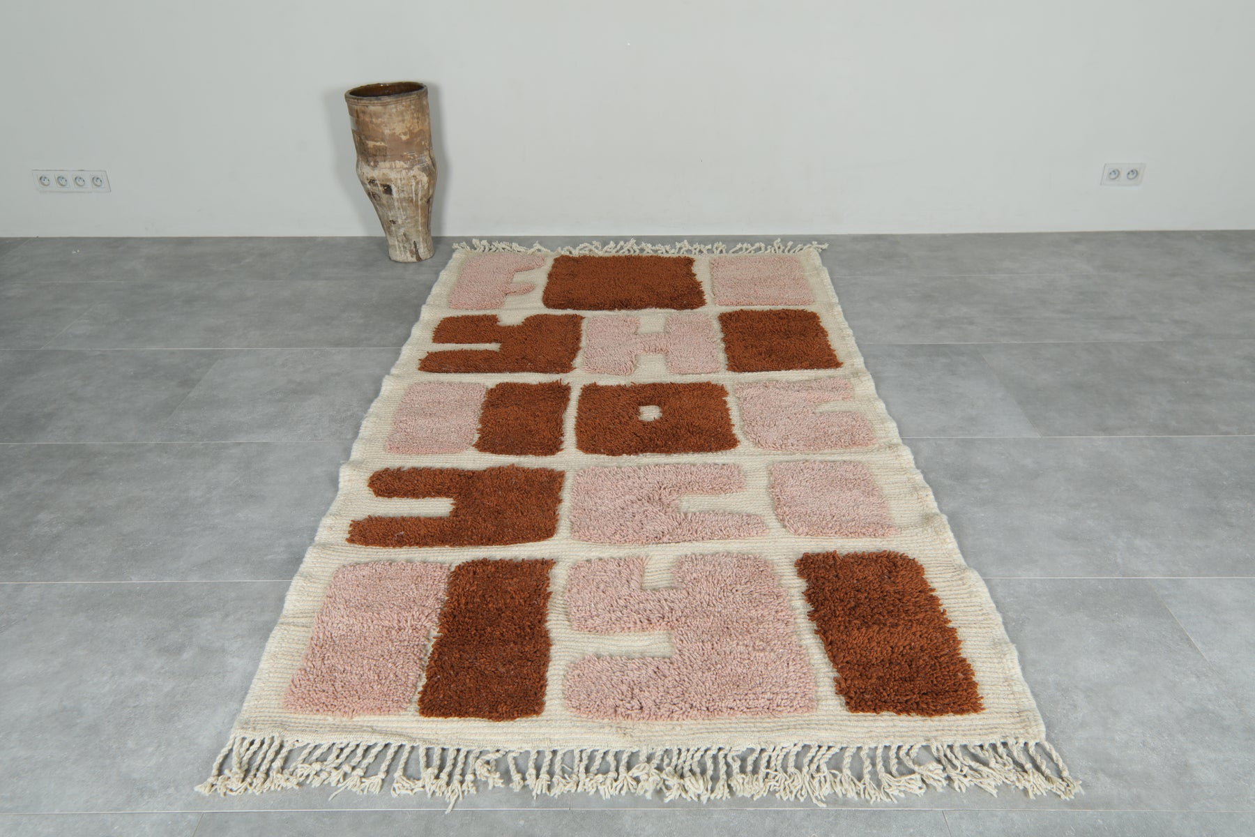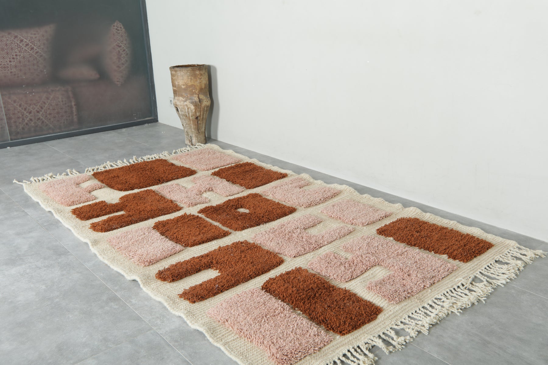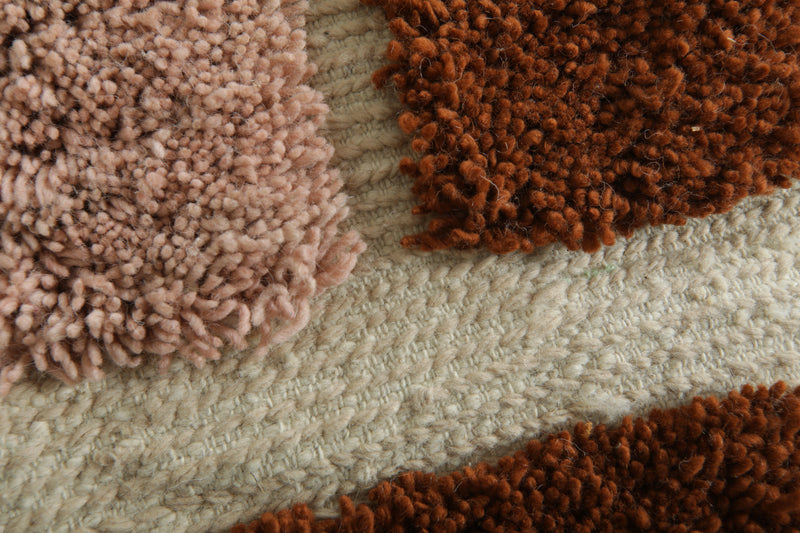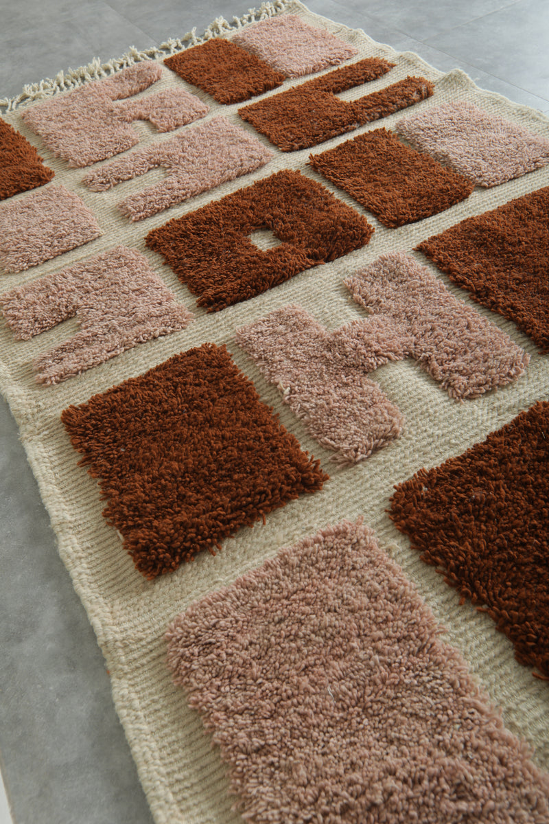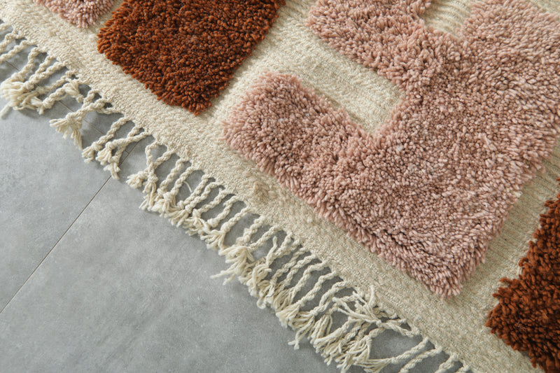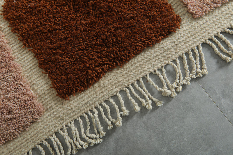 Add an artistic statement to your space with this bold handwoven Moroccan rug. Featuring a playful mix of terracotta rust and dusty rose abstract blocks set against a soft ivory base, this 3.6 x 6.2 ft piece combines modern design with authentic craftsmanship. Its unique pattern and plush texture make it perfect for creative interiors, from minimalist to eclectic.