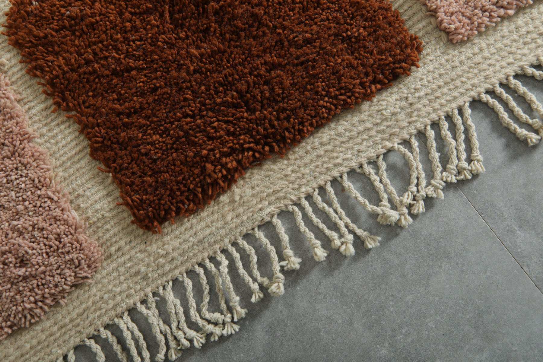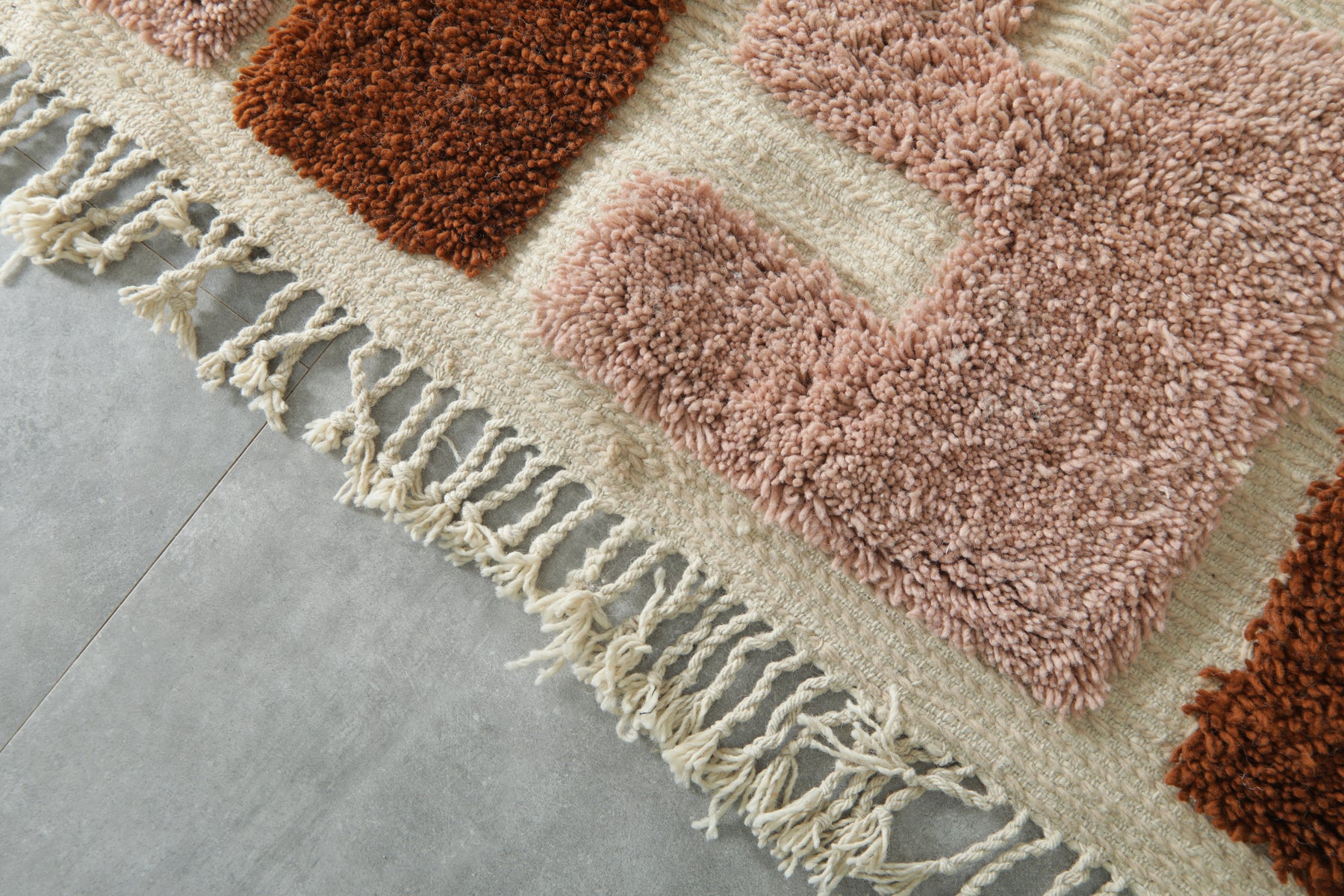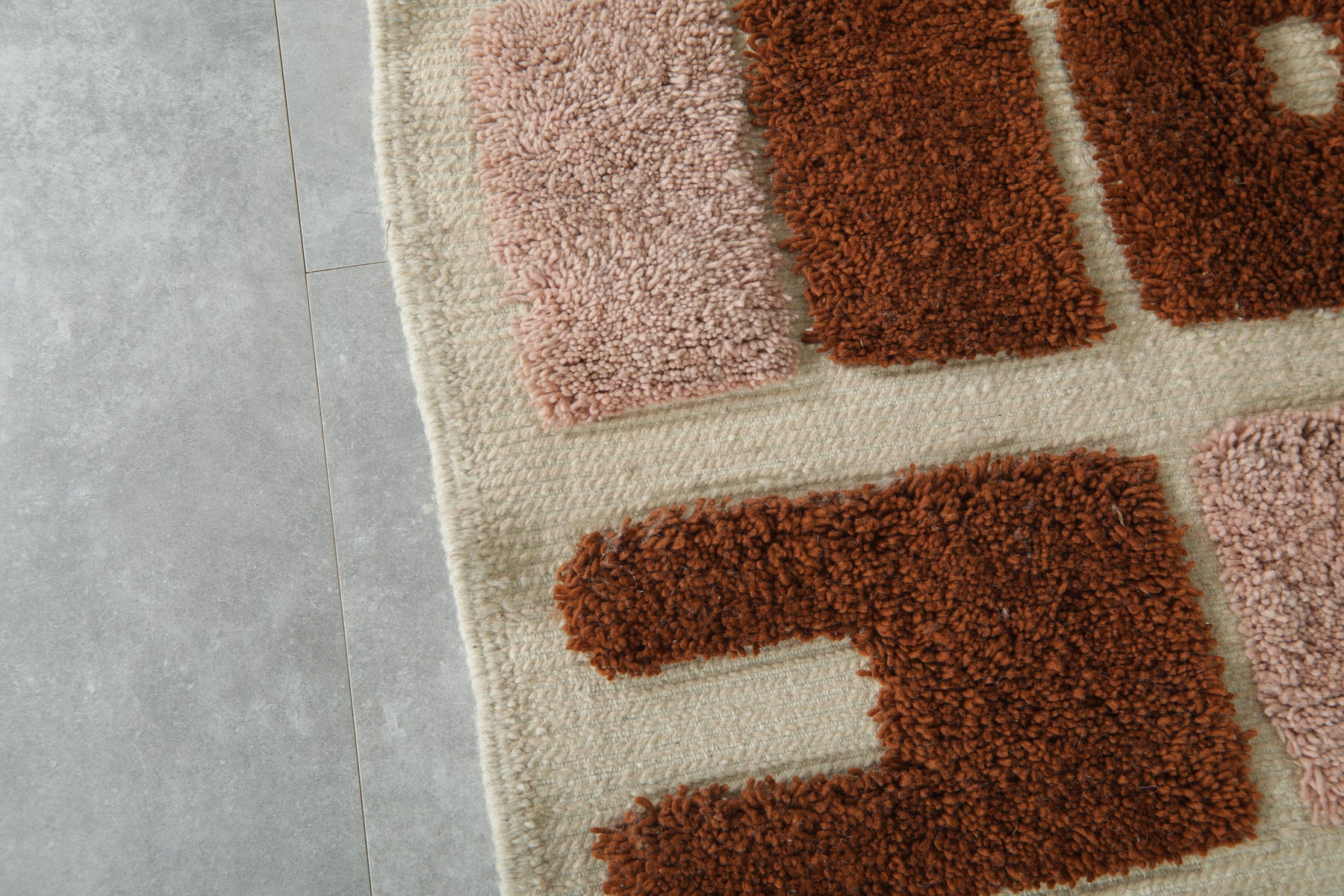 • Chunky geometric forms in warm terracotta and soft rose