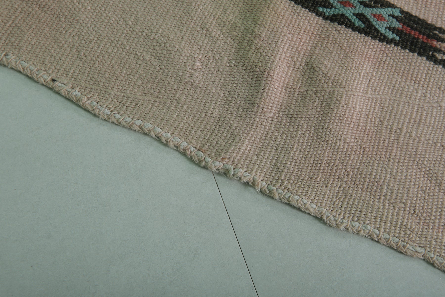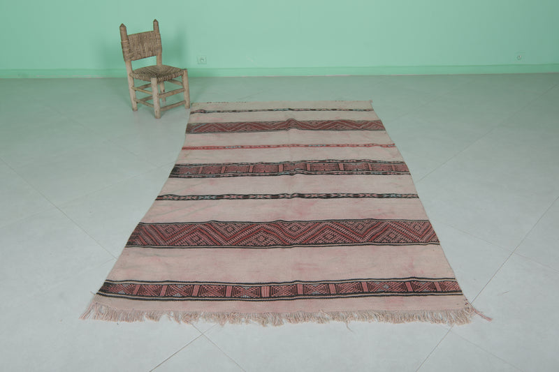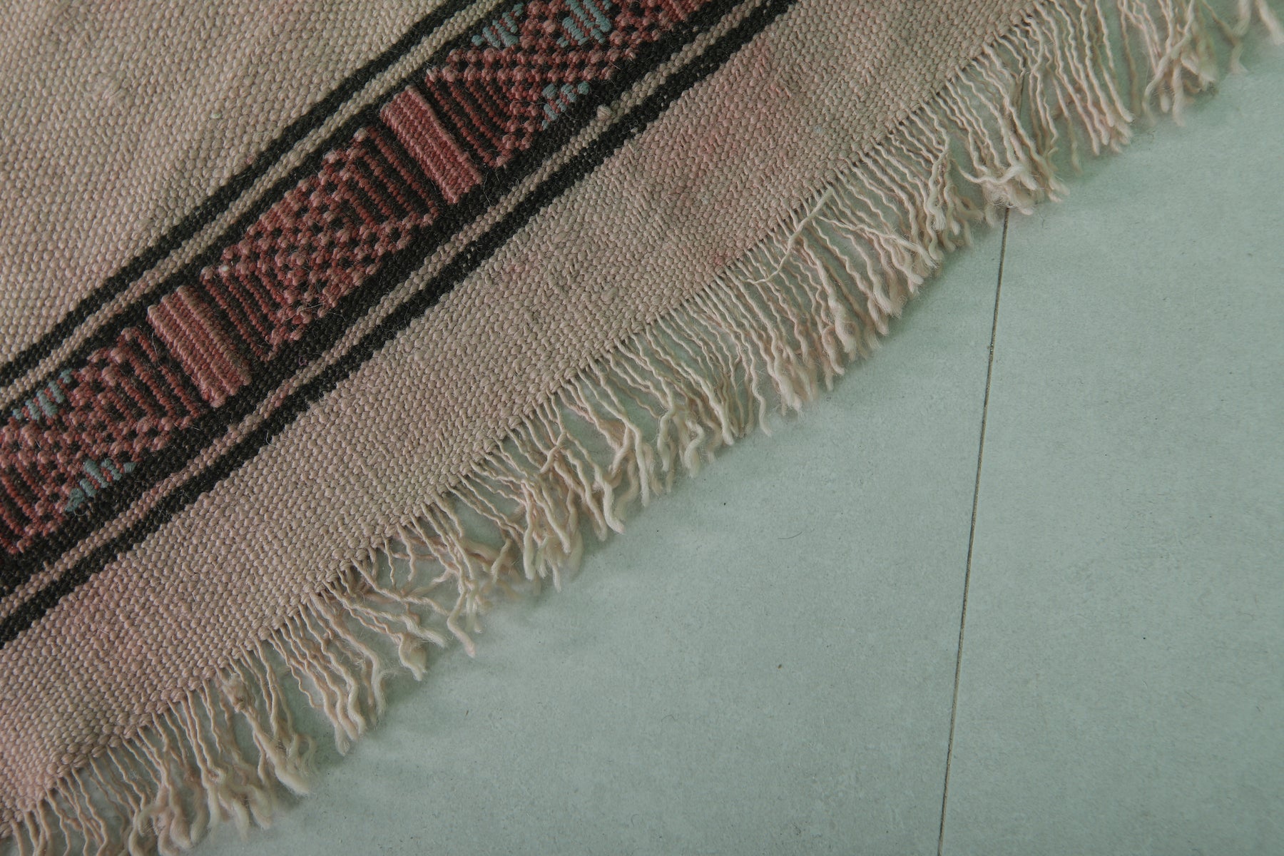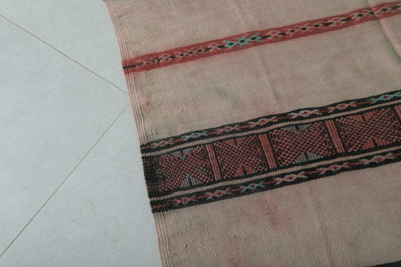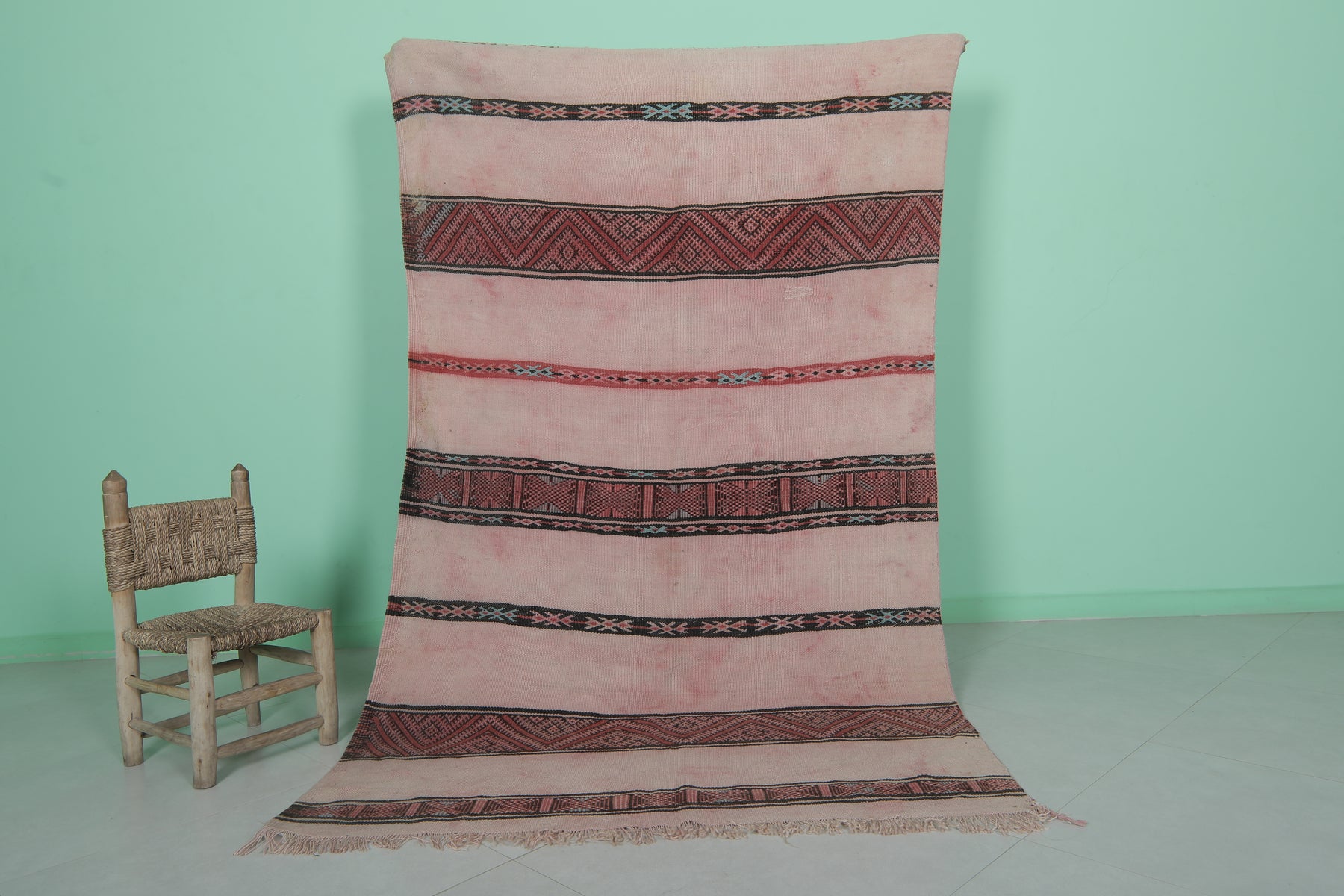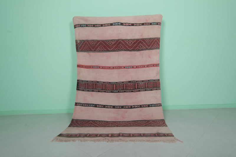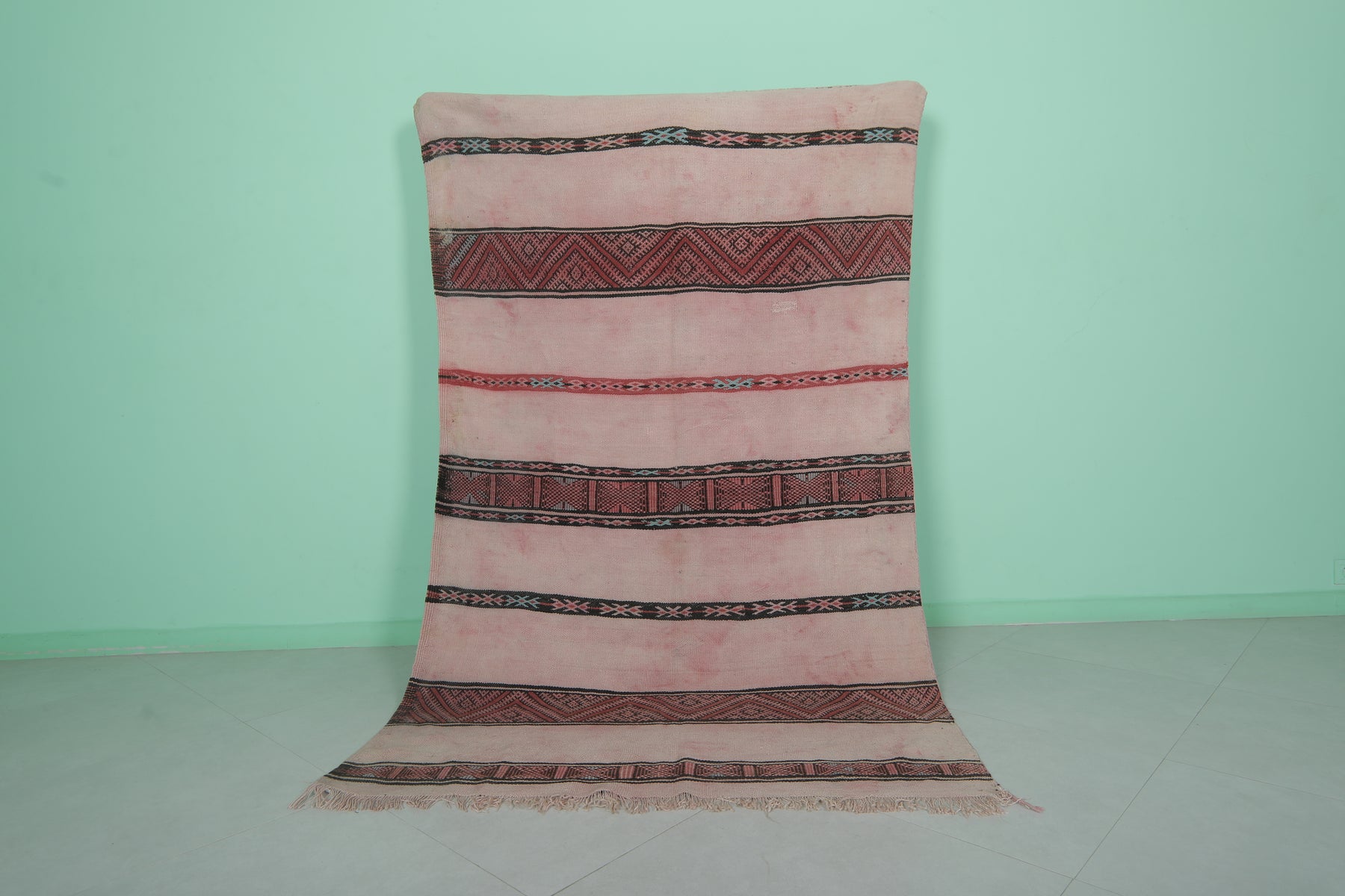 This 4.5 x 7.7 feet Elegant Moroccan Handwoven Rug features a soft pink tone adorned with intricate tribal patterns in black and blue, exuding bohemian charm and authenticity. Handwoven from natural fibers, this durable rug adds warmth and character to any space.