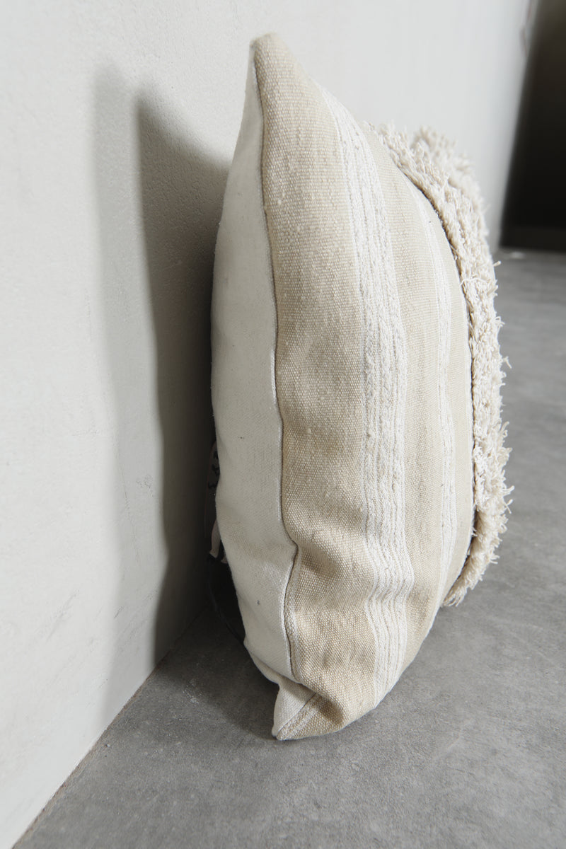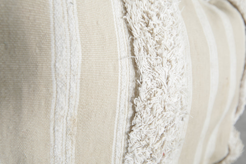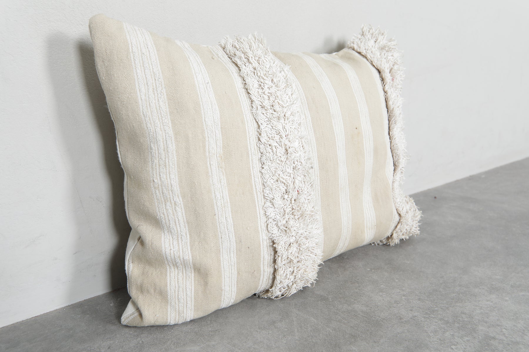 Enhance your home decor with this elegant Moroccan pillow featuring soft beige and white stripes. Handwoven with a touch of texture, the delicate fringe accents add a cozy and refined touch, perfect for modern or bohemian interiors. A versatile piece for sofas, chairs, or beds. Dimensions: 15.7 x 22.8 inches.
