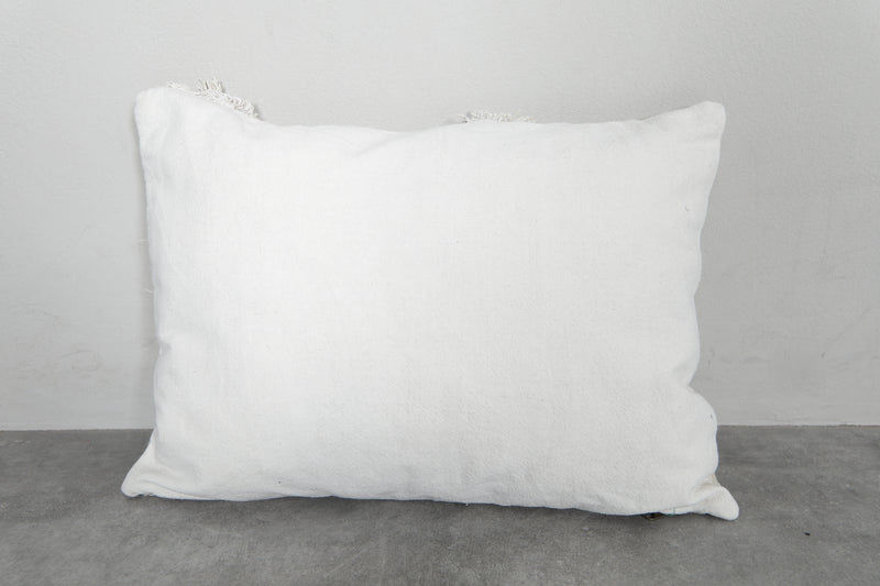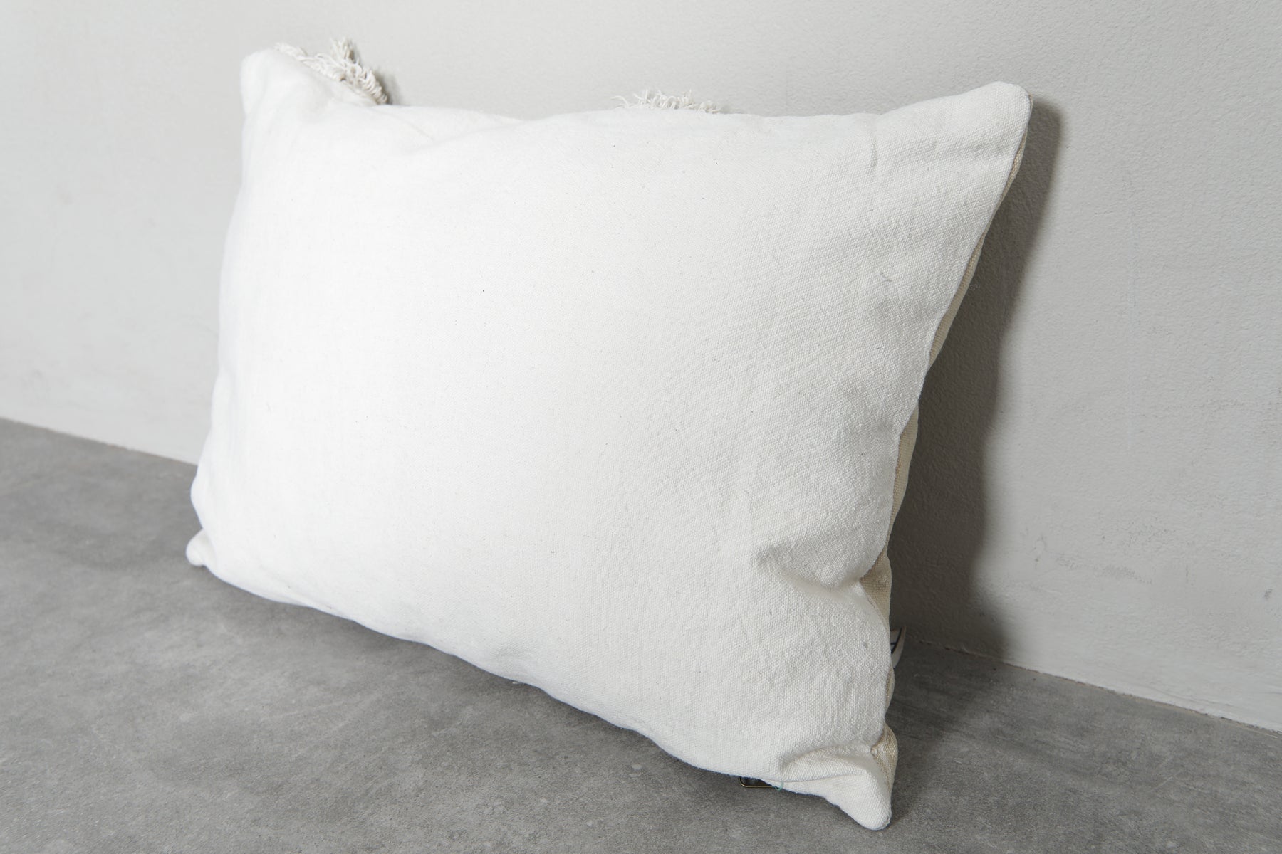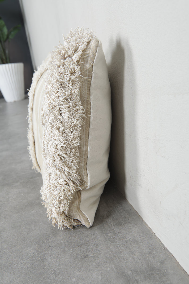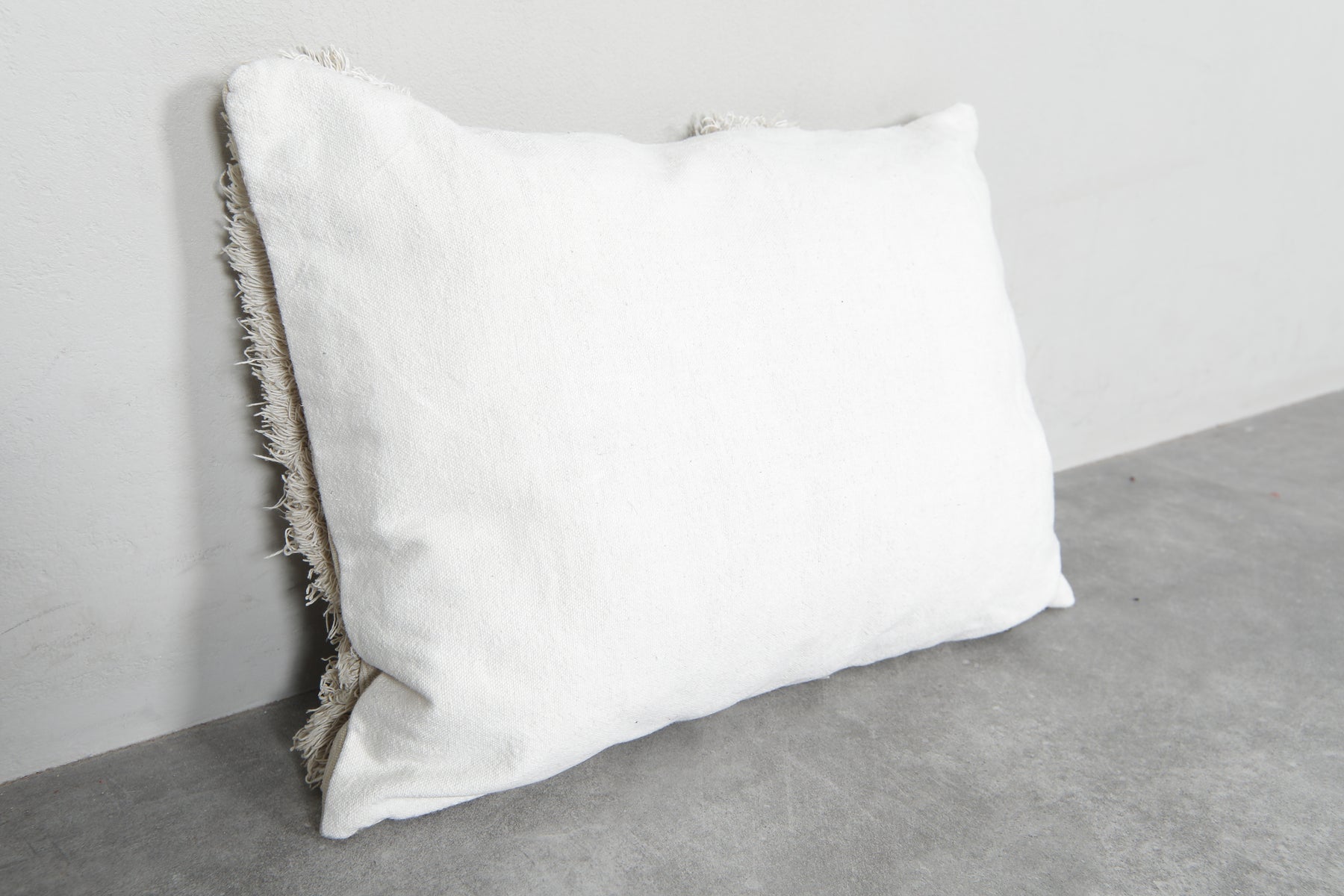 Enhance your home decor with this elegant Moroccan pillow featuring soft beige and white stripes. Handwoven with a touch of texture, the delicate fringe accents add a cozy and refined touch, perfect for modern or bohemian interiors. A versatile piece for sofas, chairs, or beds. Dimensions: 15.7 x 22.8 inches.