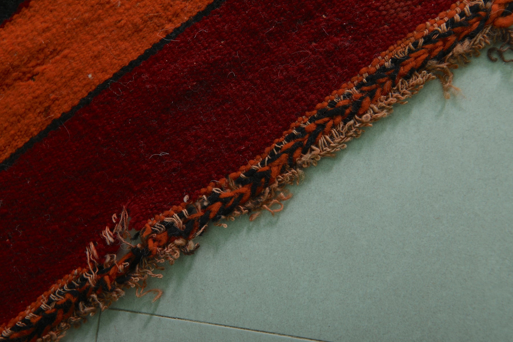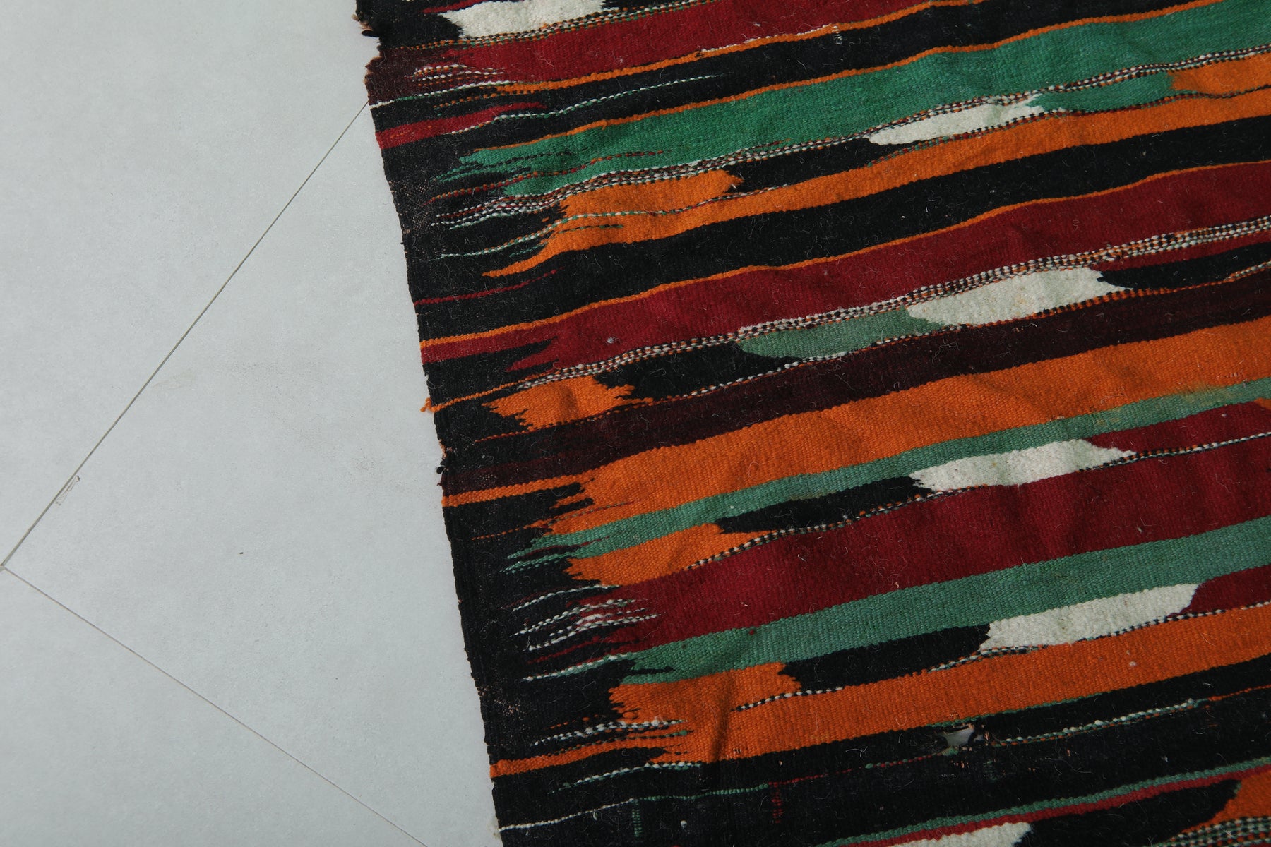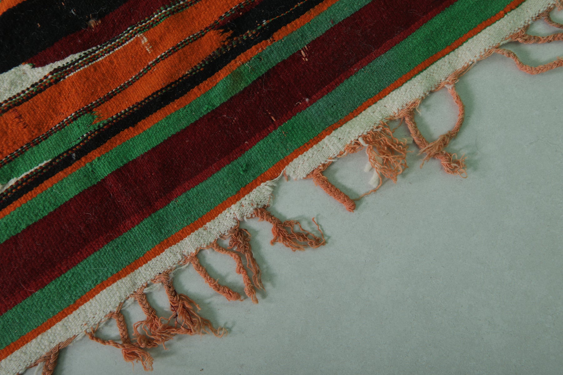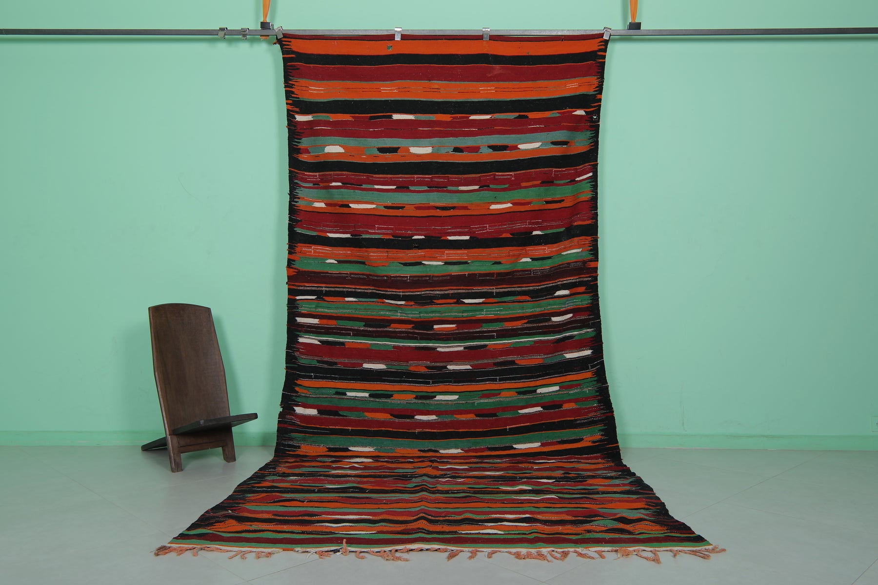 This 5.9 x 12.5 feet Moroccan flat-woven rug features bold stripes in rich, earthy tones—an elegant fusion of traditional weaving and modern design. Its generous size and durable build make it perfect for anchoring large areas like living rooms, dining spaces, or open-concept interiors.