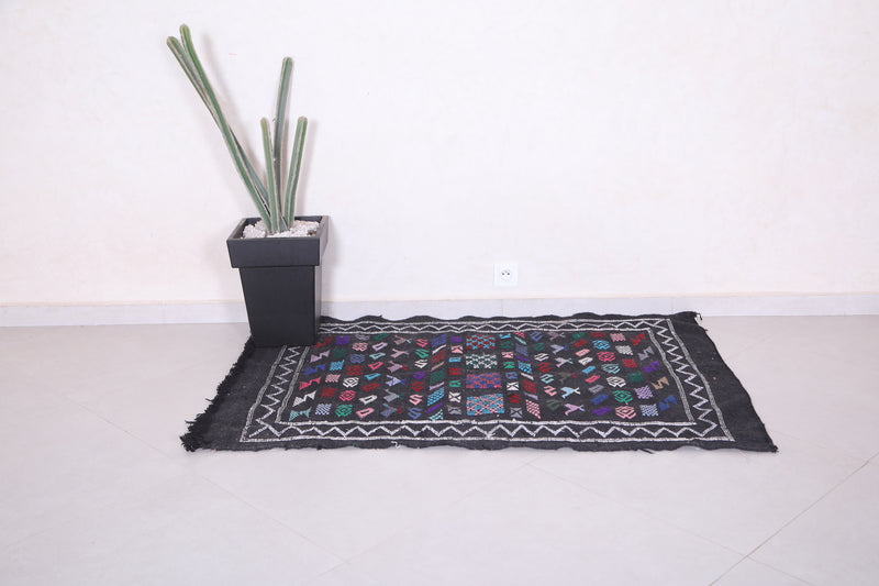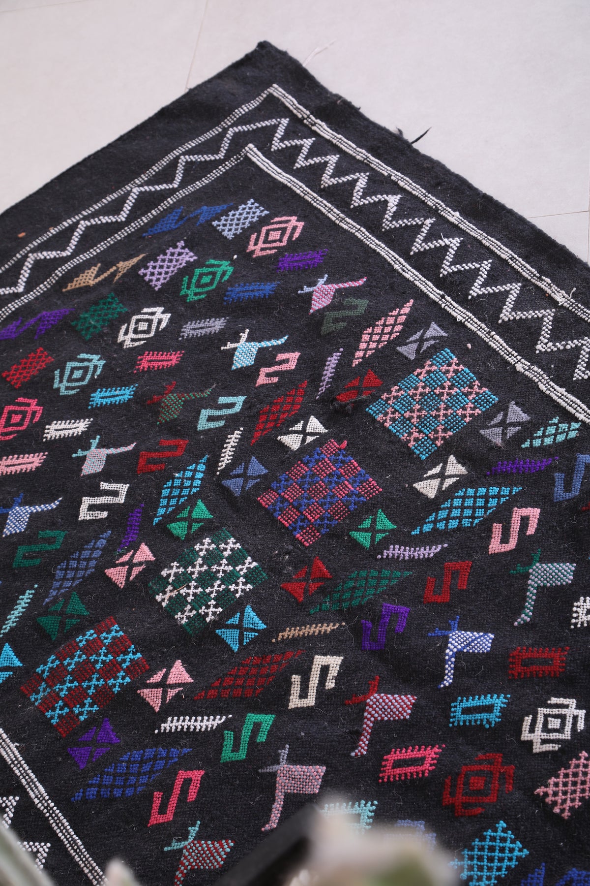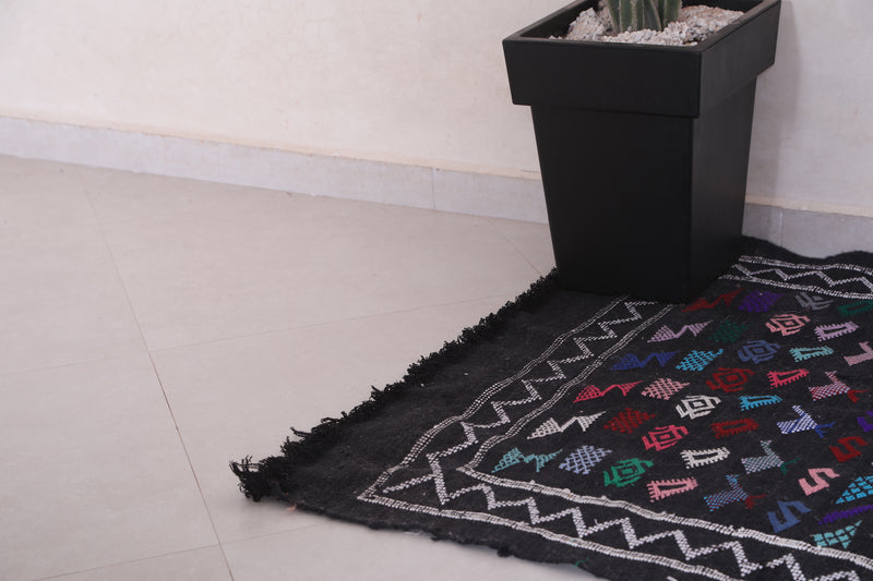 This 3.3 x 4.9 feet Flat Woven Moroccan Kilim Rug features intricate geometric patterns in vibrant hues set against a bold black background, blending traditional craftsmanship with modern appeal. A stunning statement piece, this kilim is perfect for living rooms, bedrooms, or hallways.