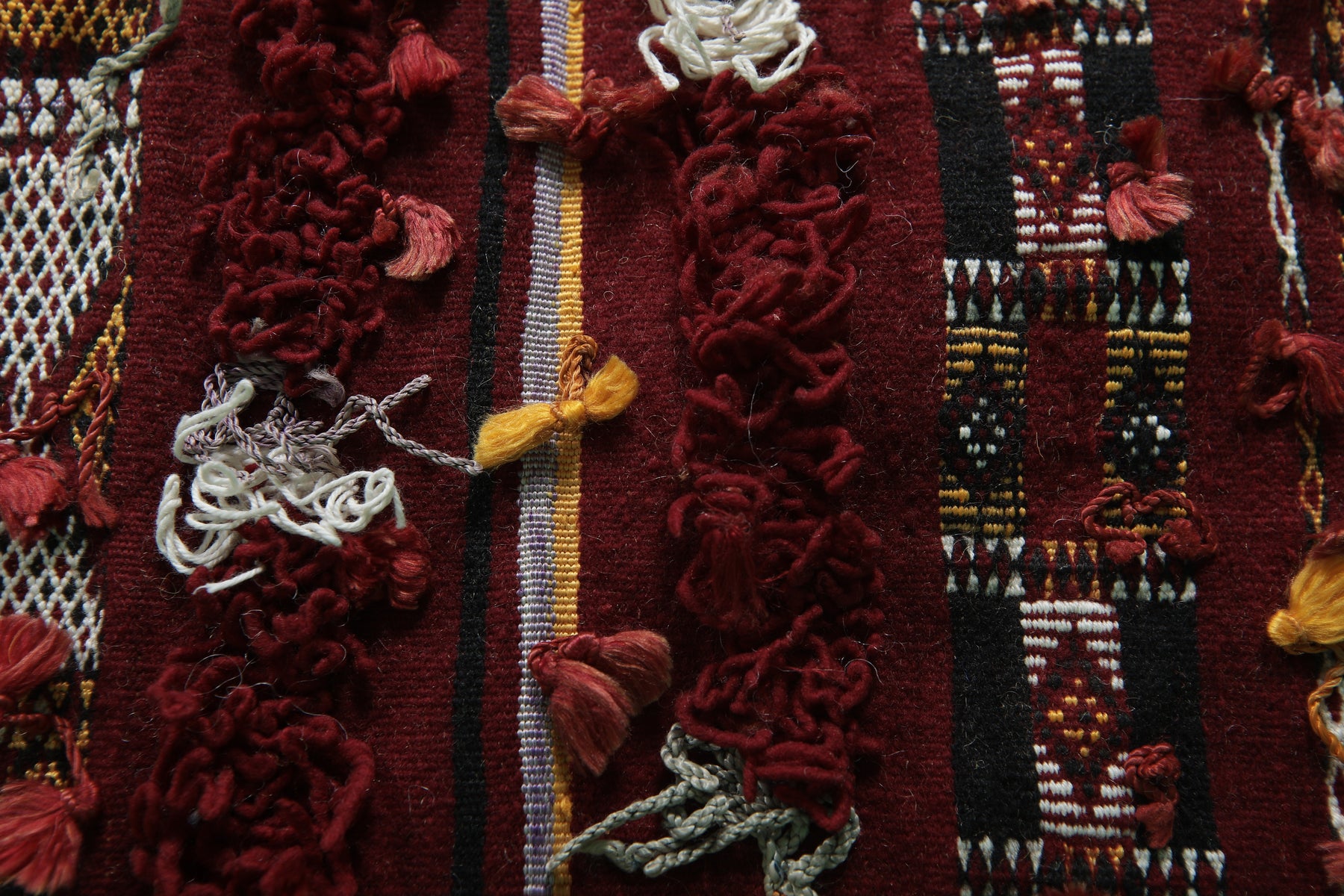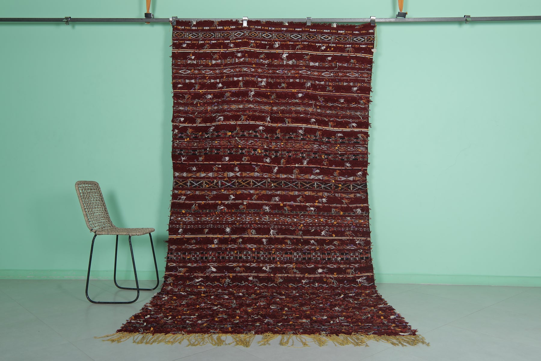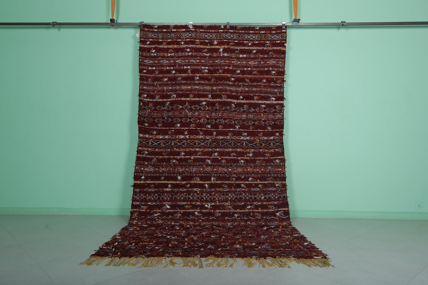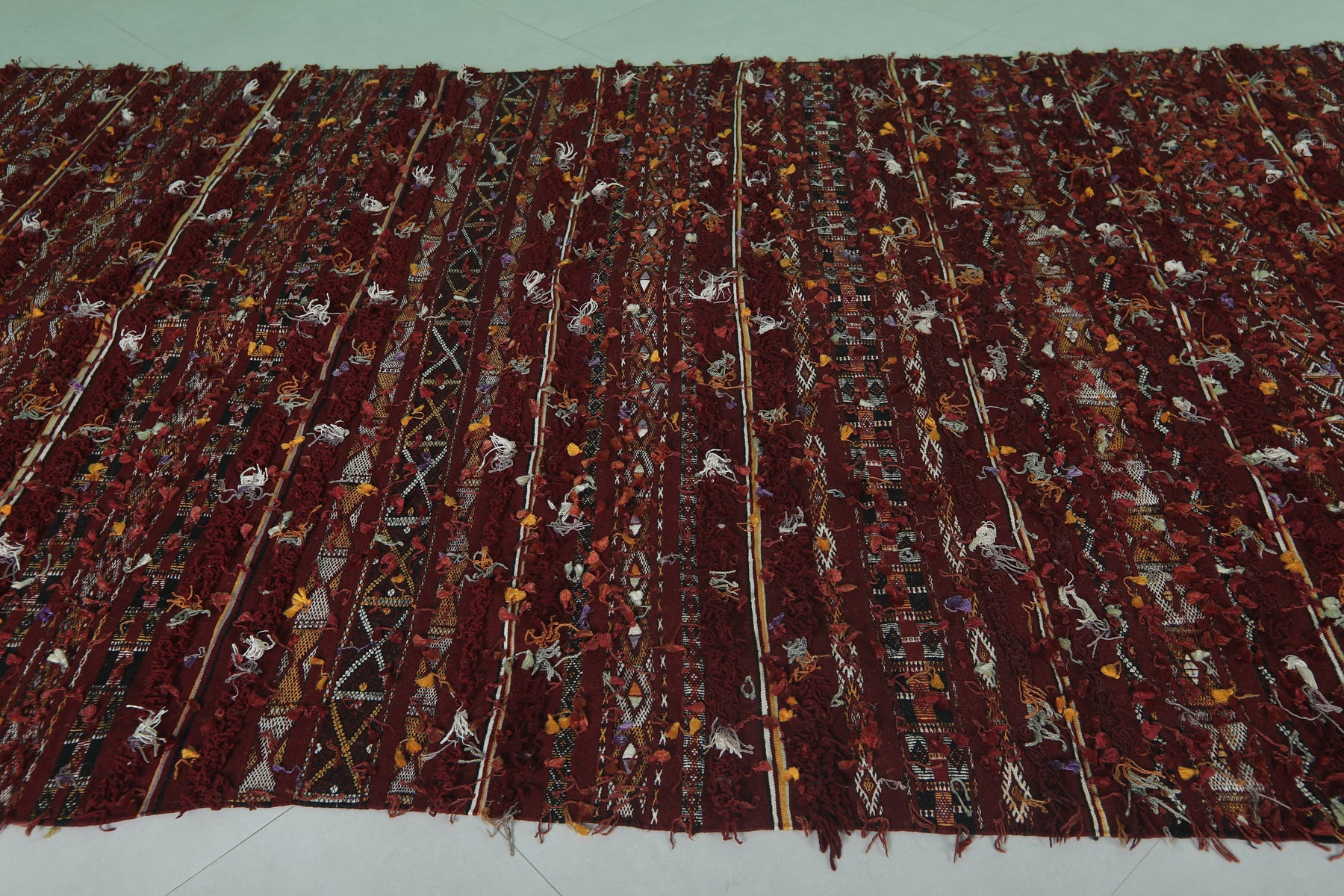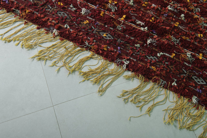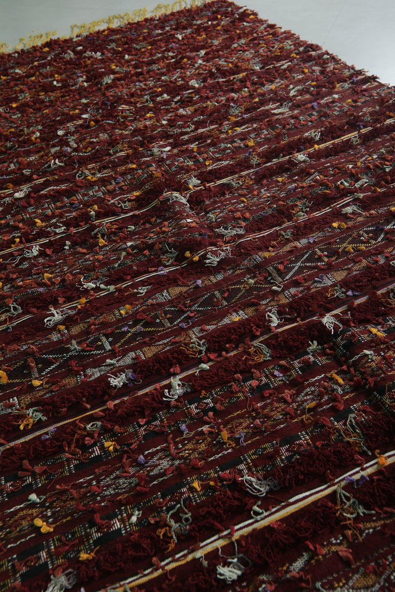 • Boasts traditional Berber geometric patterns in deep reds and earth tones.
