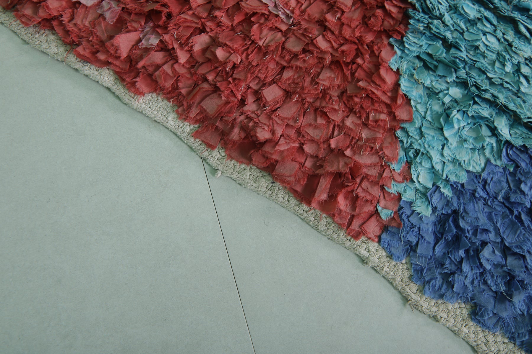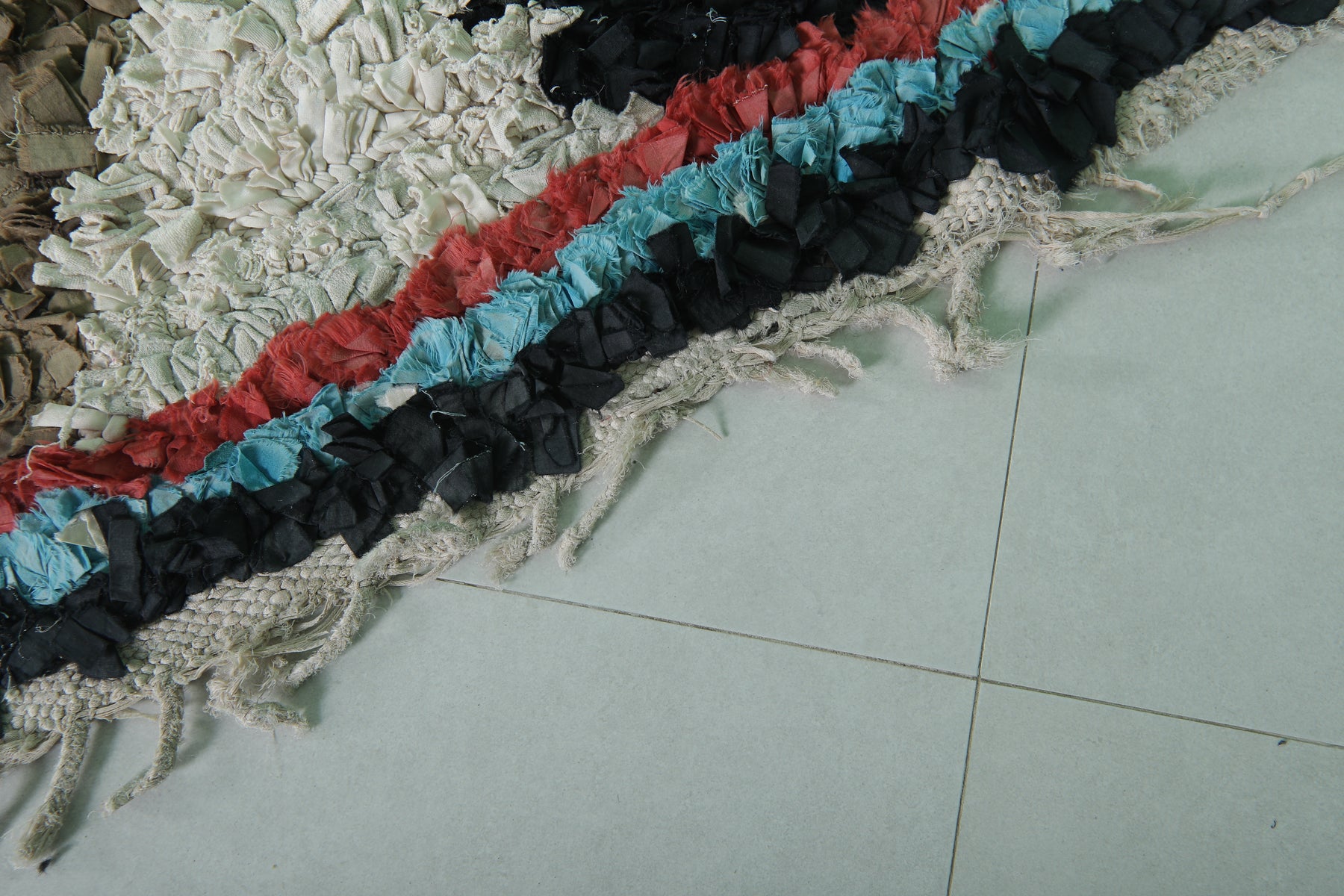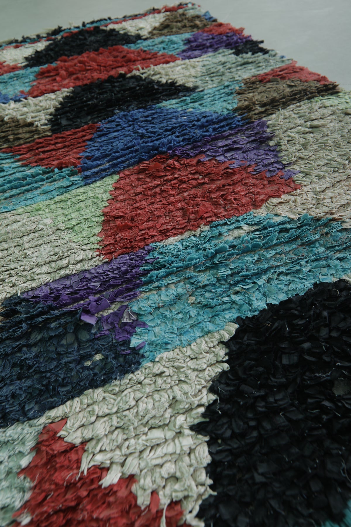 Add a bold and artistic touch to your home with this Hand-Knotted Boucherouite Rug, measuring 3 x 7.2 FT. Featuring a striking geometric pattern in vibrant colors, this rug is meticulously handwoven by Moroccan artisans using upcycled textiles. Its eco-friendly craftsmanship and dynamic design make it a perfect centerpiece for bohemian, eclectic, or modern interiors. Ideal for hallways, entryways, or as a statement piece in living spaces, this rug brings Moroccan tradition and sustainability into your decor.